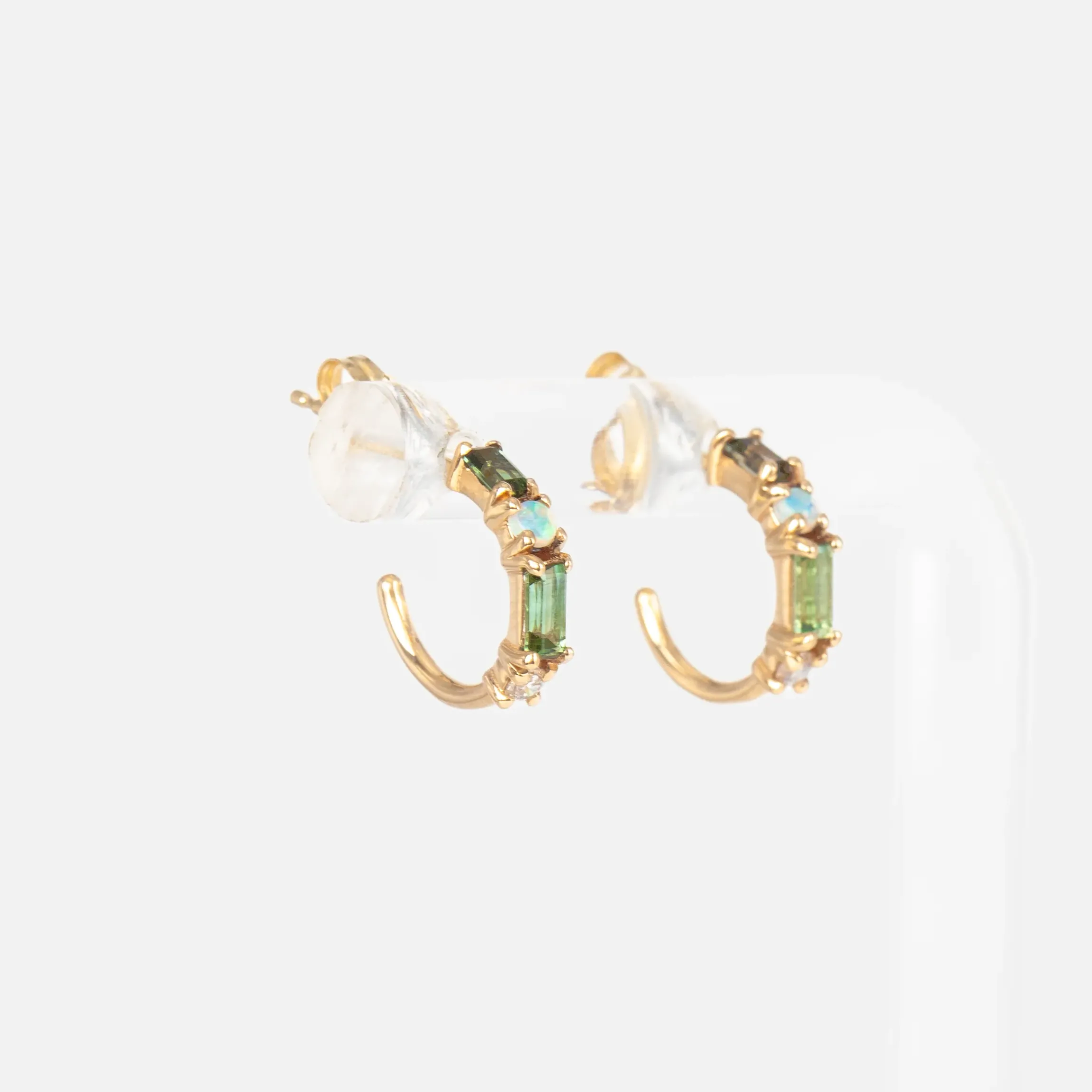 14k solid recycled yellow gold with tourmaline baguettes totaling 0.33 total cts per pair, Australia-origin opals totaling 0.06 total cts per pair, and recycled diamonds totaling 0.06 total cts per pair.