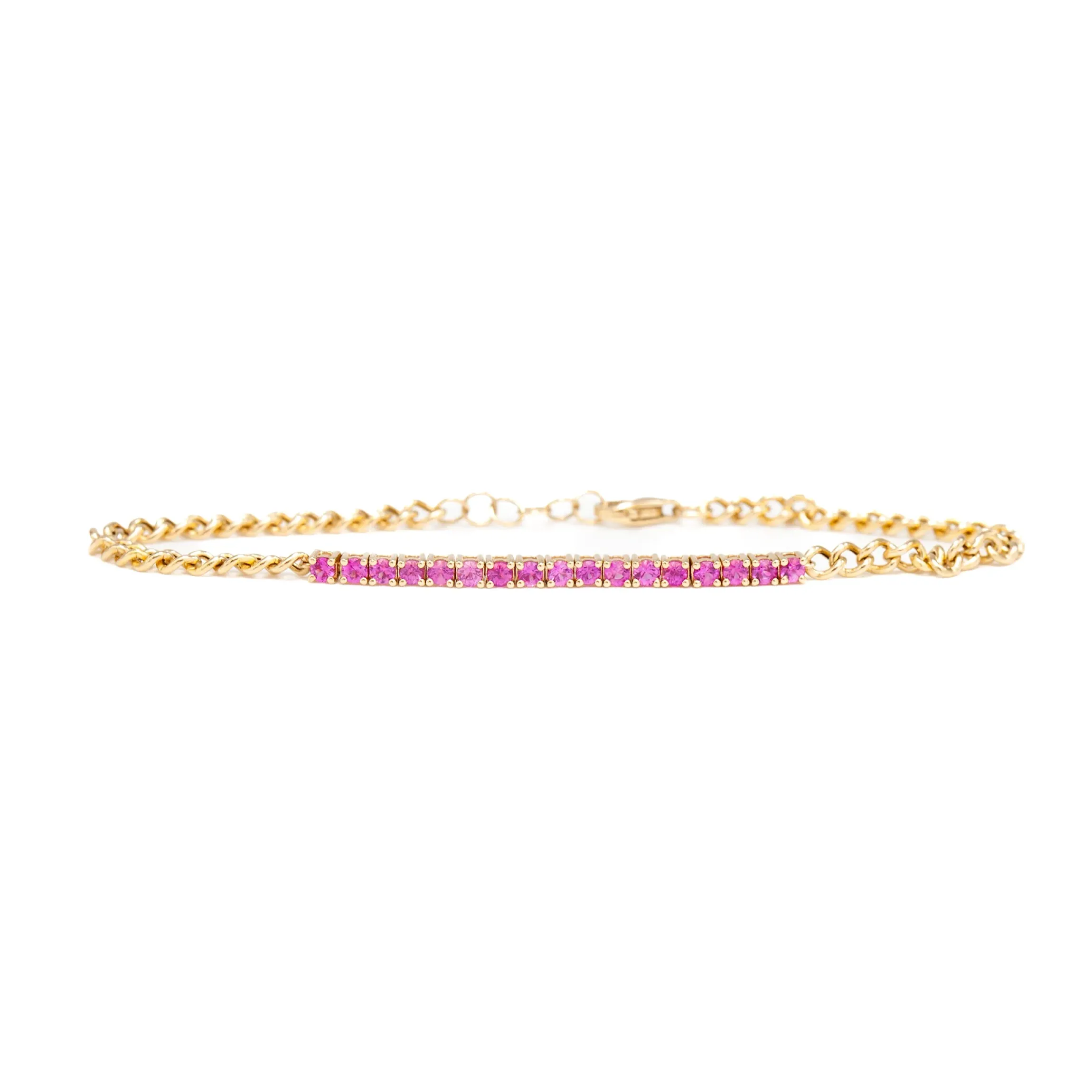 This stunning sapphire bracelet takes the timeless tennis style and gives it a fresh and unexpected spin. A meticulously set row of pink sapphires is paired with a 14k yellow cuban link gold chain. Want to keep your stack simple? Layer this beauty with slender gold chains for a subtle yet elegant pairing. Finished with a spring ring clasp.