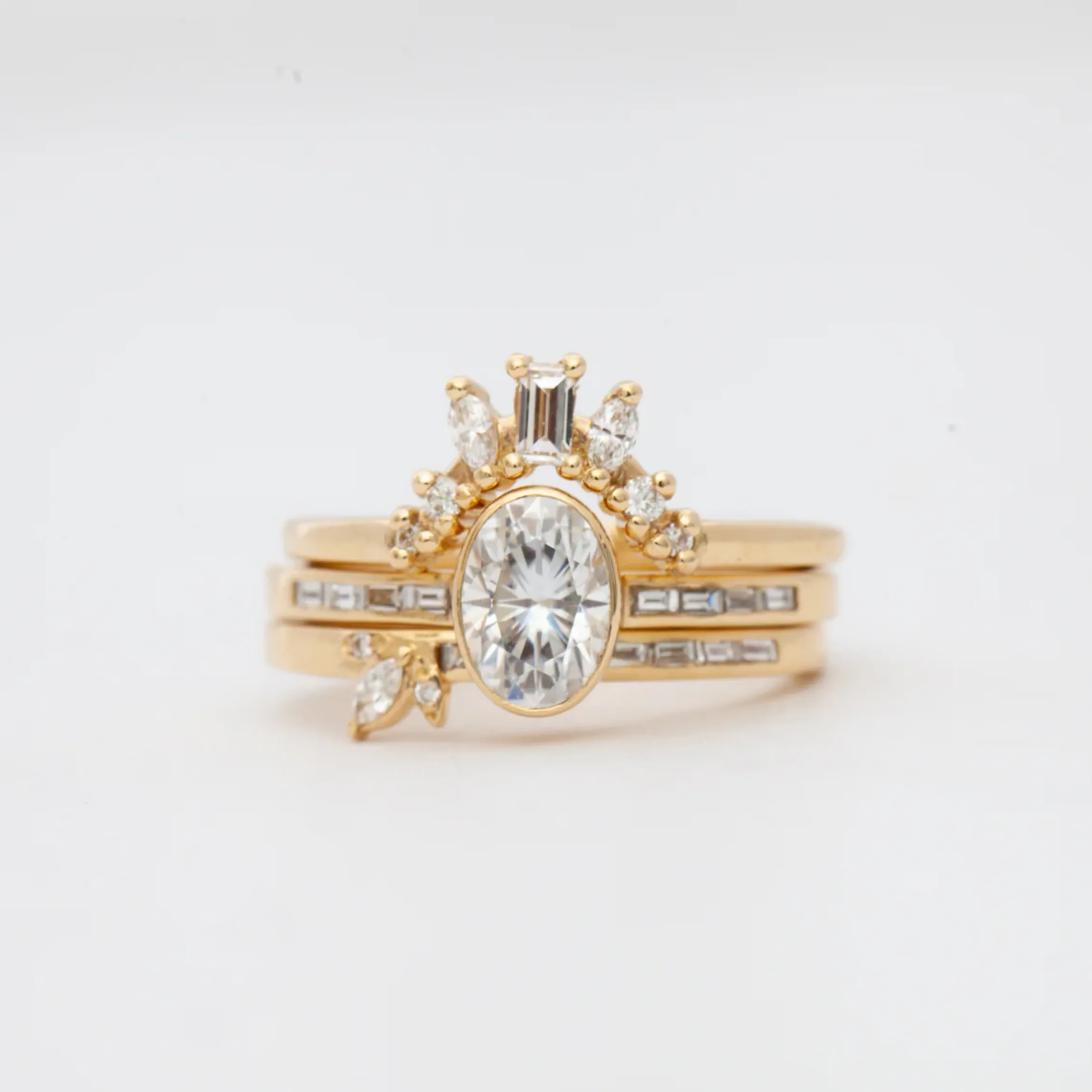 The Presley Ring is an unmistakably classic solitaire featuring a minimal, bezel-set oval diamond flanked by a row of sparkling baguettes. Fans of low-profile settings will love how it lays close to the skin, while still allowing bands to cozy up against it. Though you can pair it with anything you like, we love how the Daisy Baguette Band and Zora Ring complement it perfectly. Made in the U.S.A.
