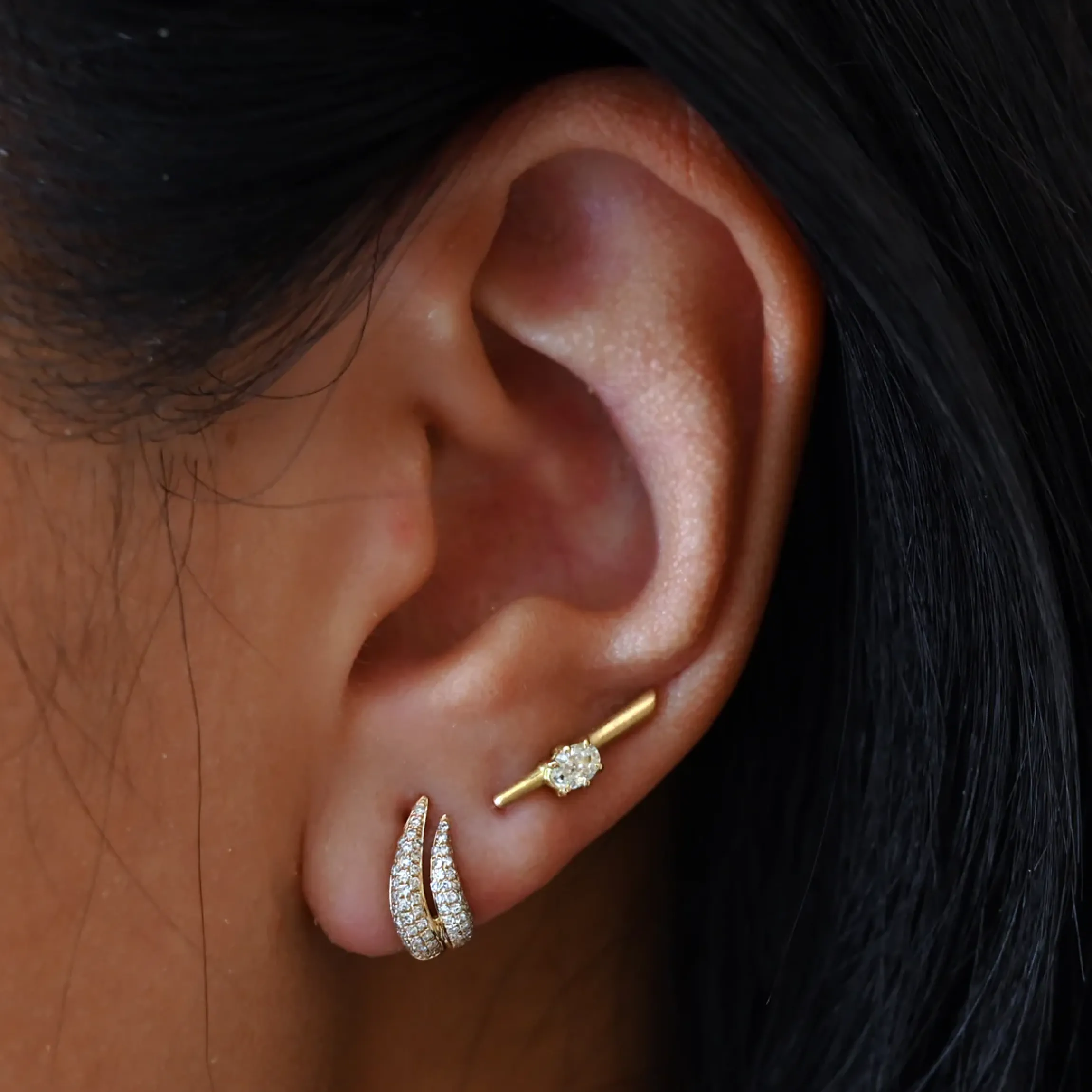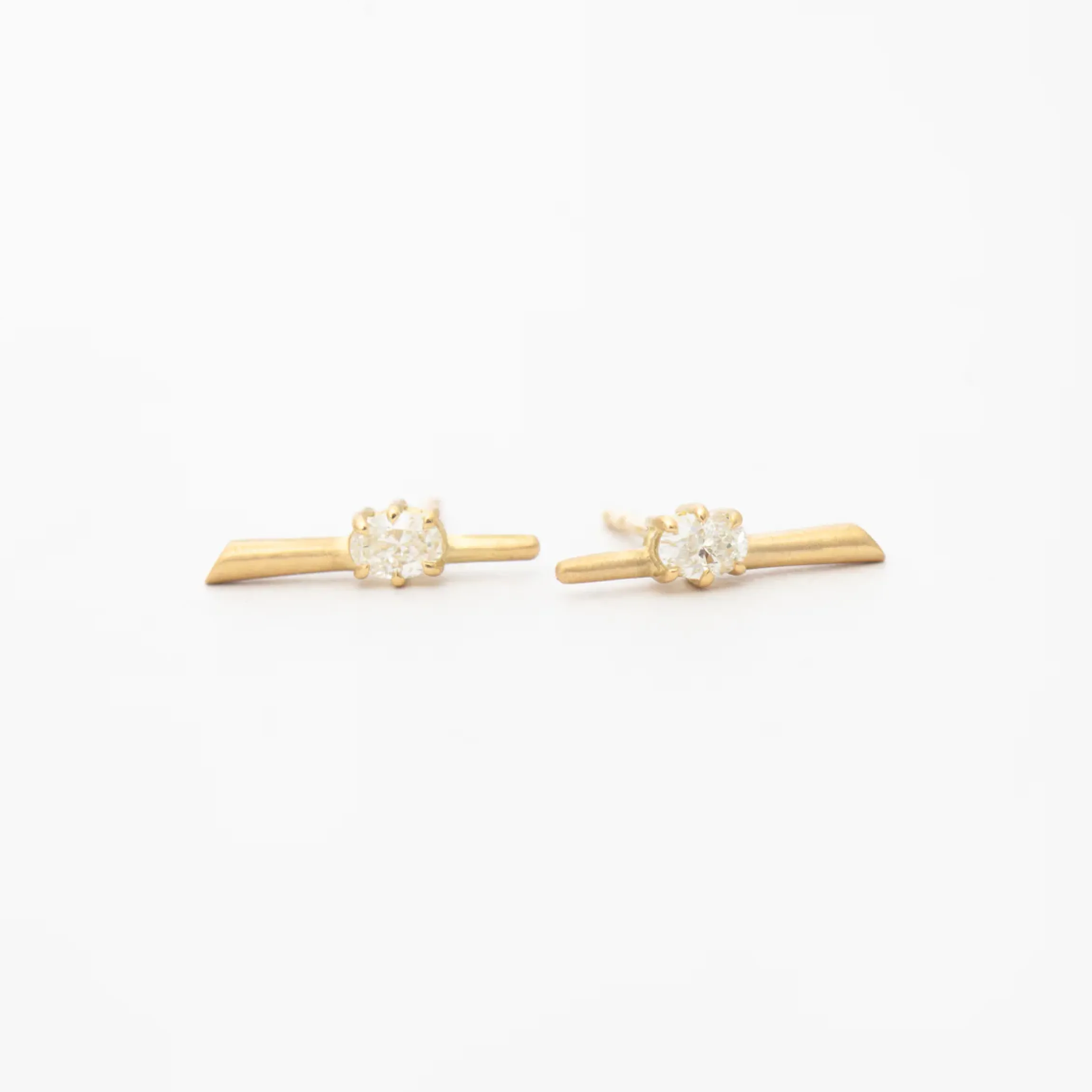 A pair of tapered columns in satin-finish gold is punctuated by oval white diamonds in these dainty yet daring studs by Jade Trau. Wear them alone to accentuate any outfit day or night—or stack them with your favorites studs and huggies for an ear curation that spares no sparkle. Made in the U.S.A.