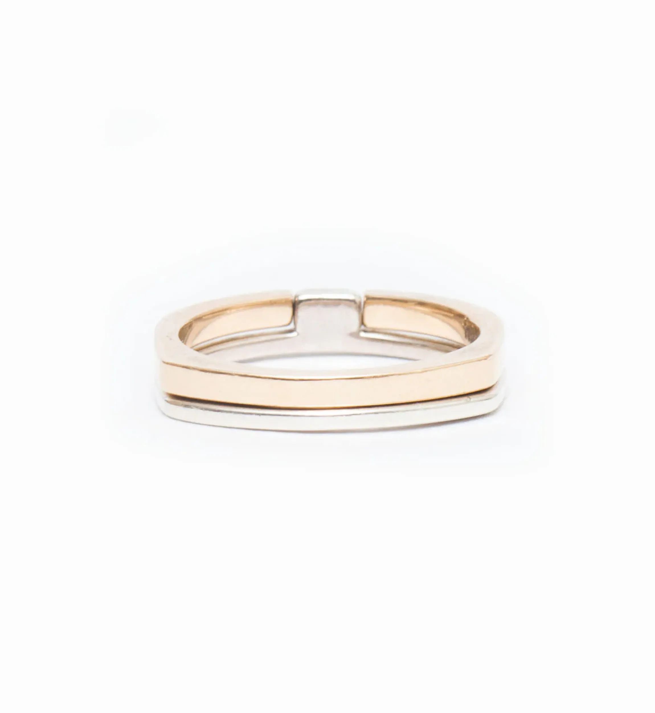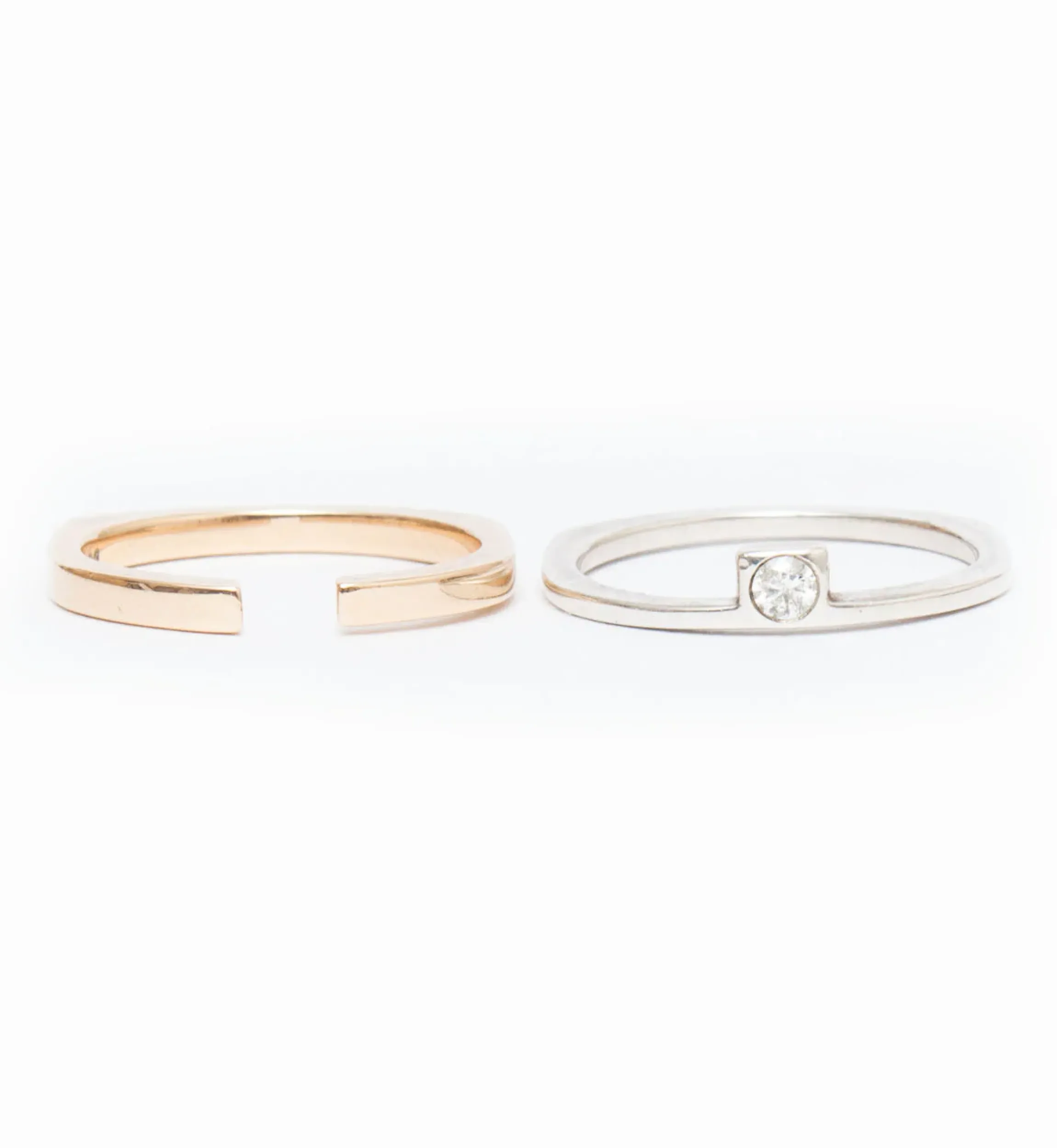 Squaring the circle might be mathematically impossible, but Bliss Lau proposes a unique solution to the ancient challenge by placing a single diamond within a offset square setting to create a modern new solitaire style. Interlocking bands of white and yellow gold make this contrasting engagement ring-cum-wedding a distinctly minimal take on commitment jewelry. Made in the U.S.A.