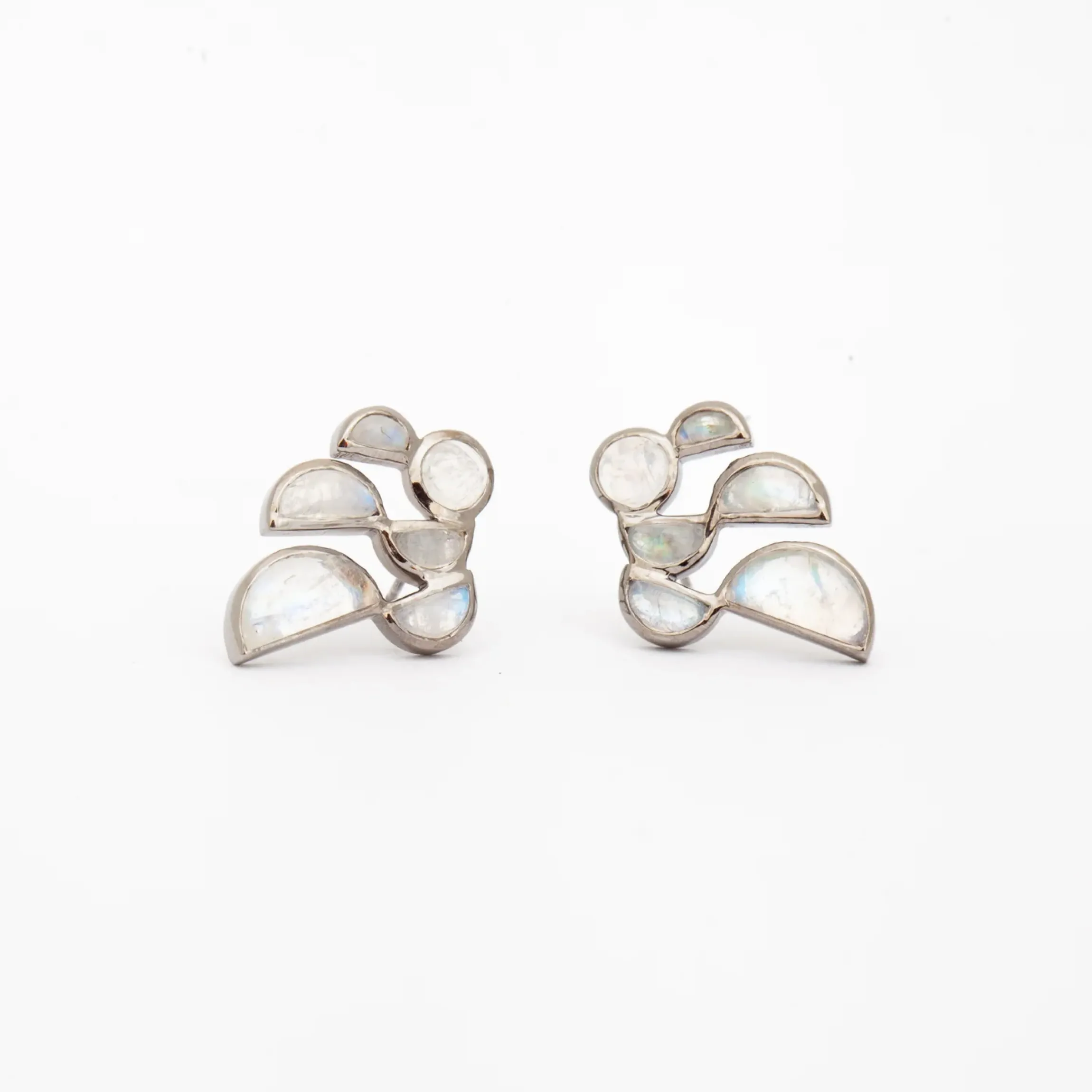 Step into the spotlight with these Rainbow Moonstone Prawn Earrings. Impeccable quality with an alternative aesthetic, Nak Armstrong utilizes his signature sterling silver with black rhodium bezel settings to build a gorgeous and impeccably constructed set of studs. Show off your style with a daring combination of fun composition and statement-making, opalescent moonstones. Dare to take risks and turn heads with these unique, attention-grabbing earrings! Designed in Austin, Texas.