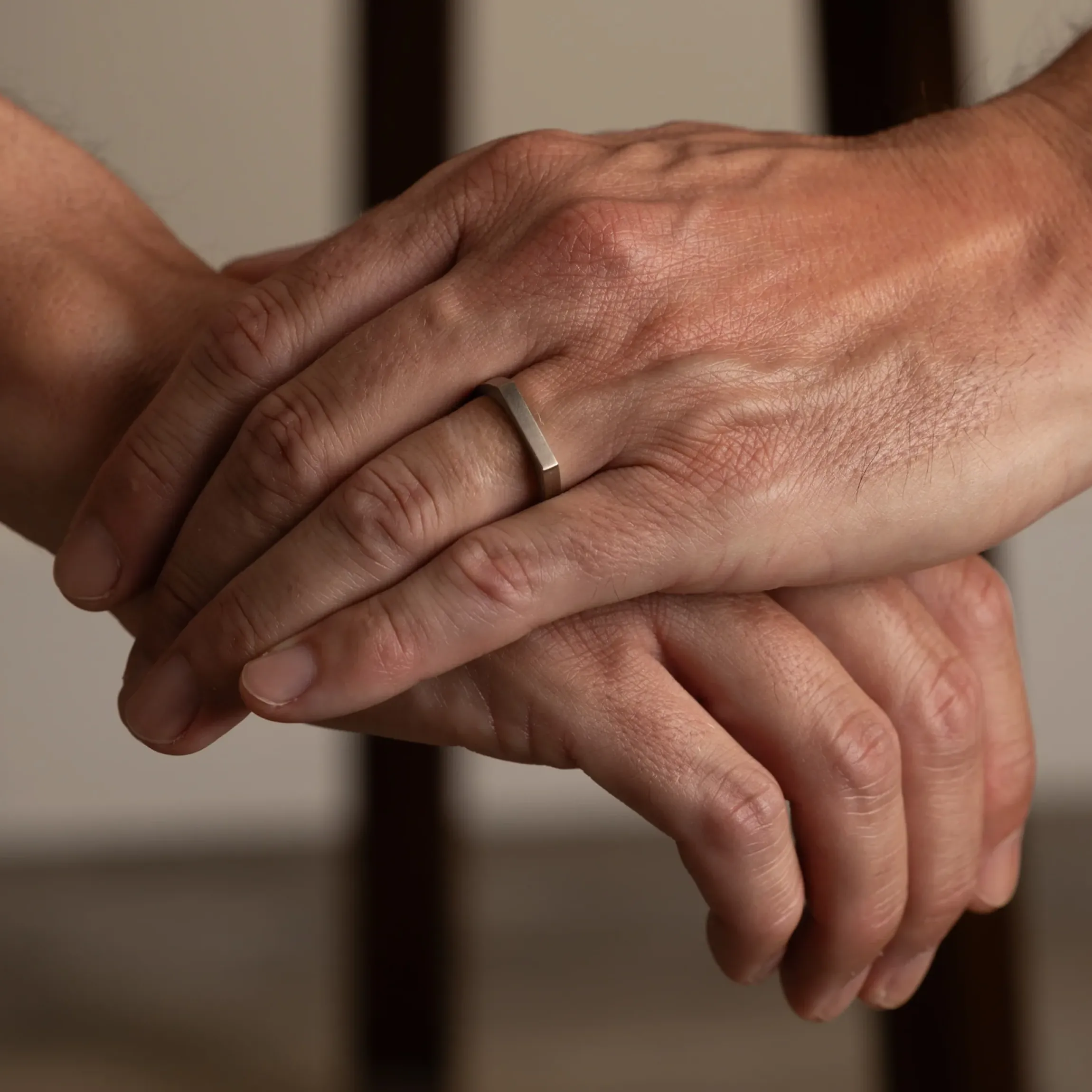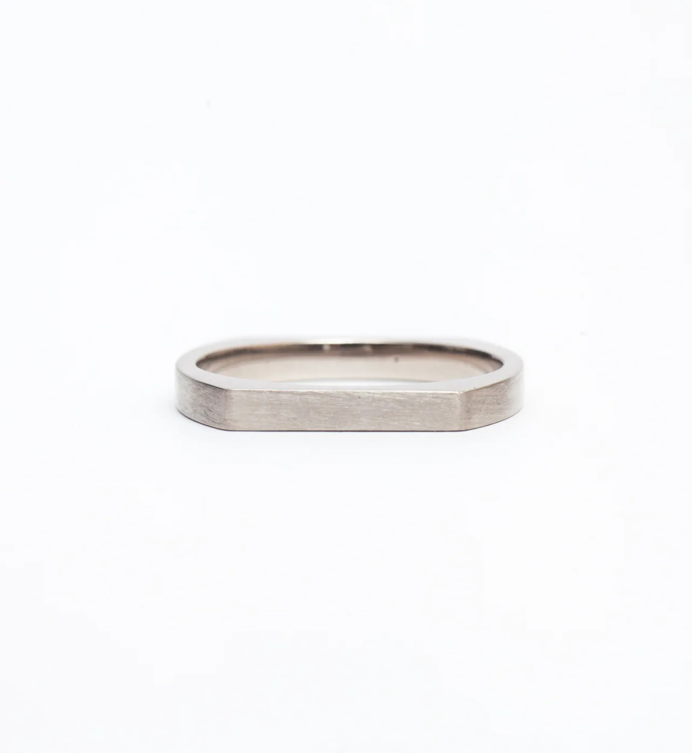 An arresting combination of soft curves and hard lines create modern balance for this men’s band. Designed by Bliss Lau as an understated counterpoint to her artfully geometric, this style mirrors her signature stabilizing shape and can be rotated for two different looks. A polished interior feels soft on the skin while a matte face gives its smokey white construction an edgy finish. Made in the U.S.A.