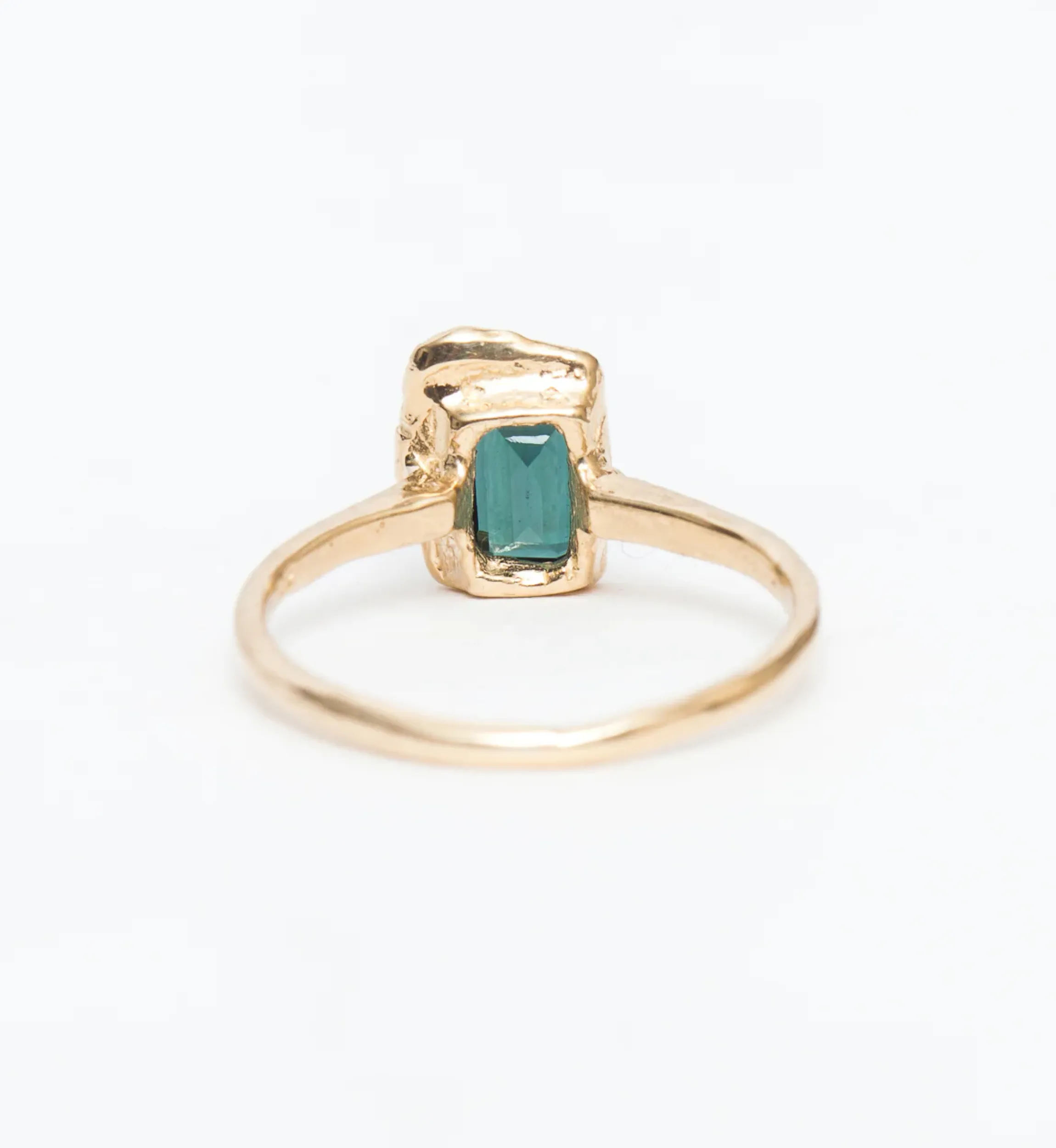 14 karat gold set with a 6 mm x 4 mm emerald-cut green tourmaline center and five round white diamonds totaling 0.033 carat.