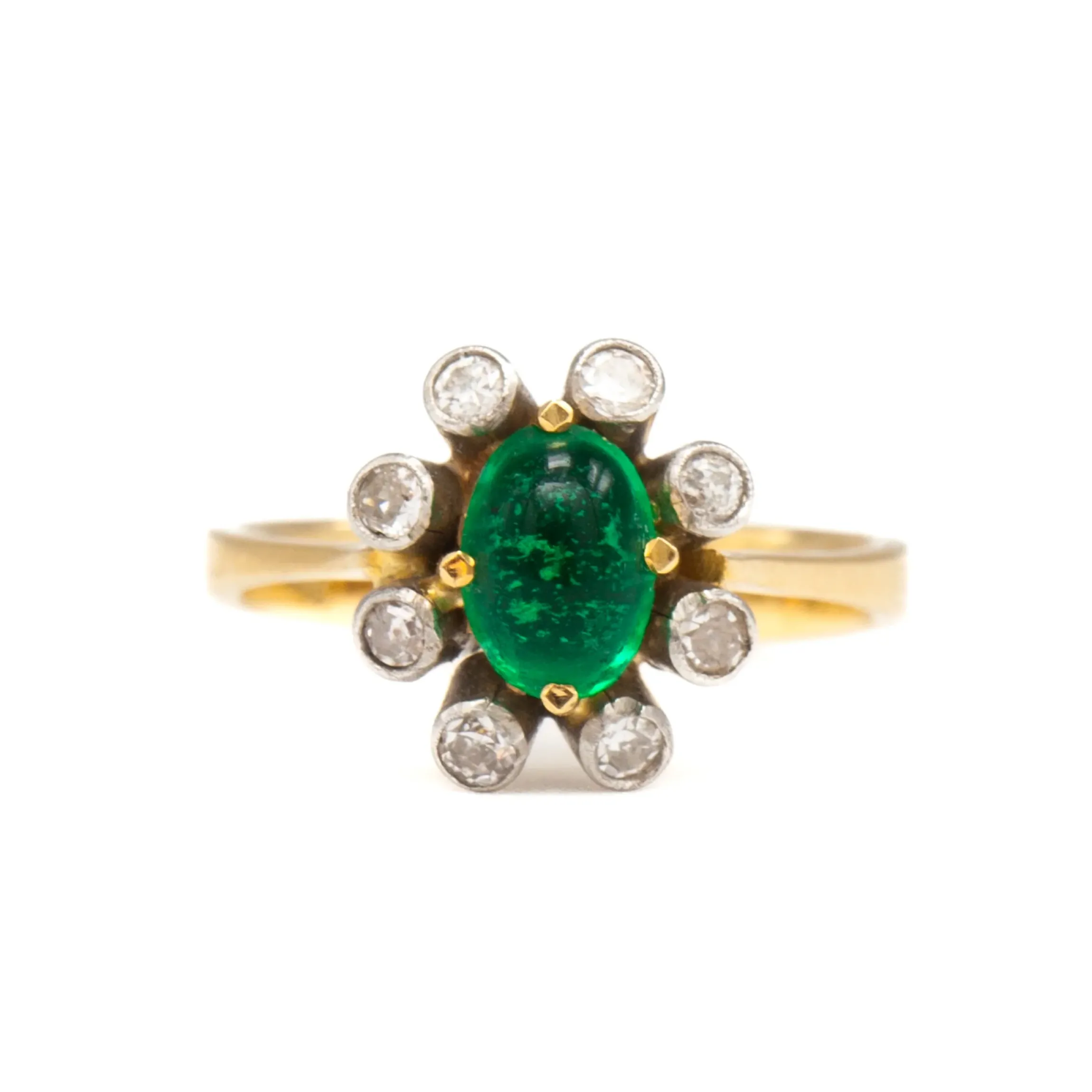18 karat yellow and white gold with emerald cabochon u0026amp; single-cut round diamonds.