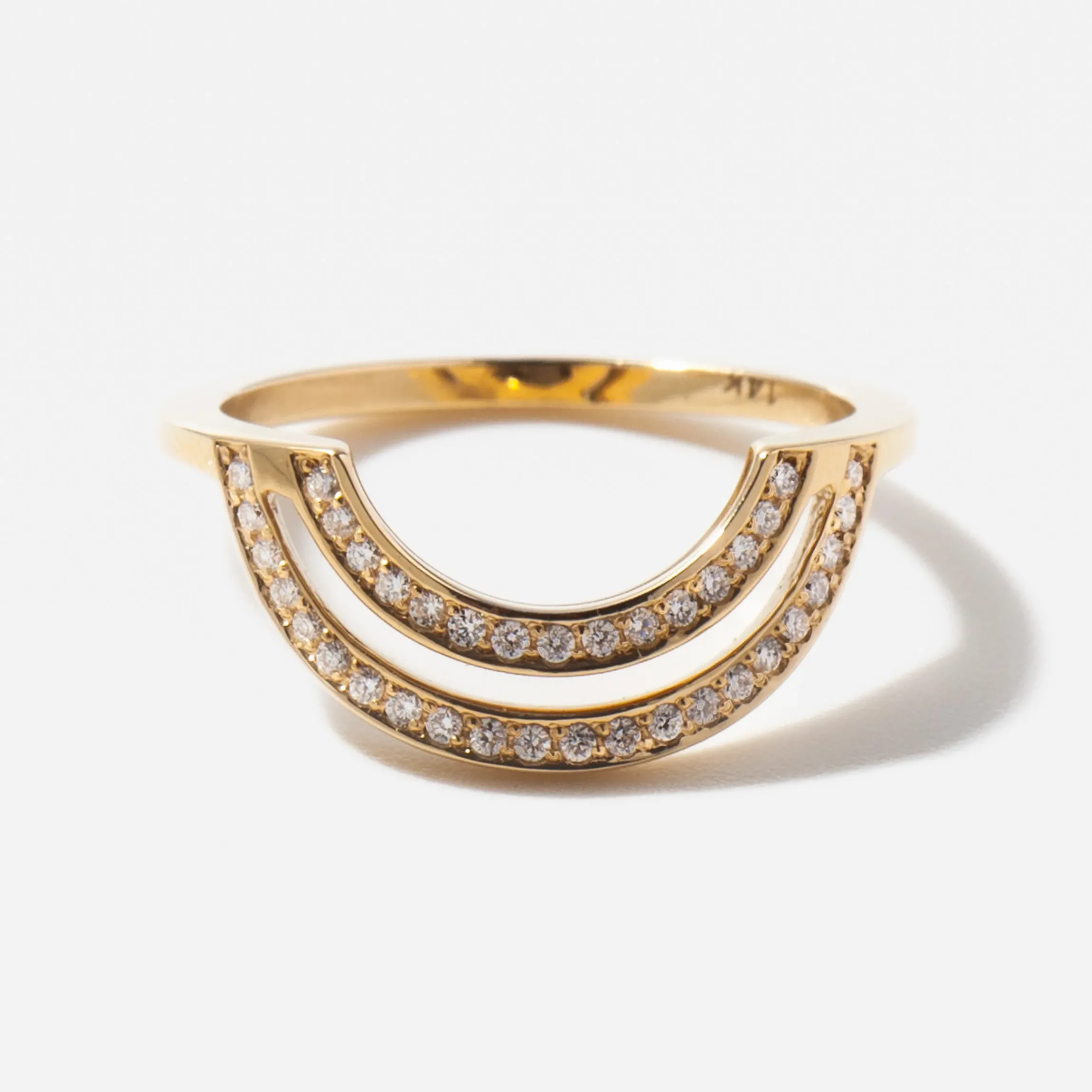 Catch eyes with this unique layered diamond crown that combines architectural elements and sparkles, featuring a modern use of negative space.