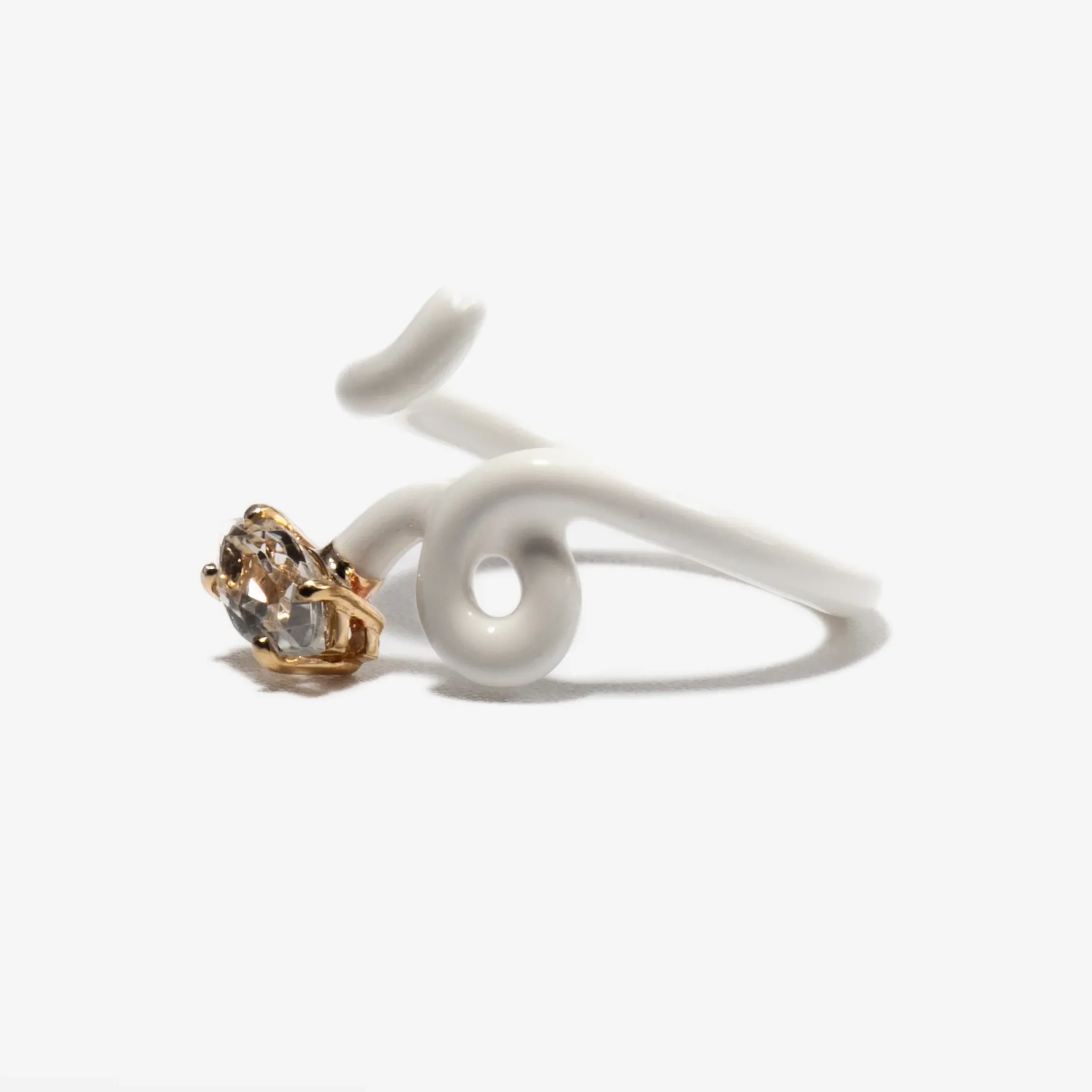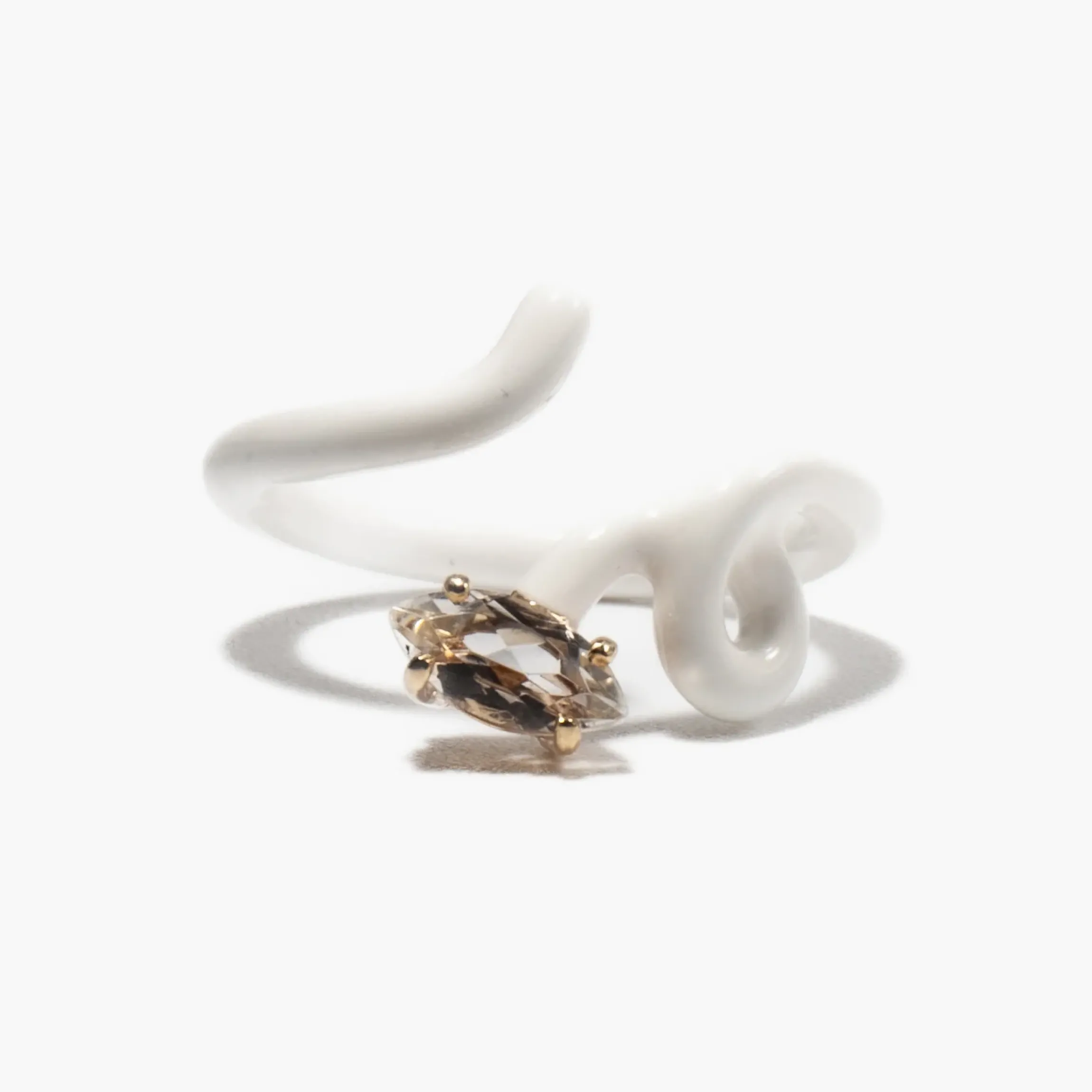 Upgrade your style game with this cool ring from Bea Bongiasca. Crafted in Italy with 9kt gold and coated in white enamel, this ring captures the designer’s unique aesthetic. The swirling motion, bold design, and addition of a beautiful rock crystal marquise make this piece a wearable masterpiece. Made in Italy.