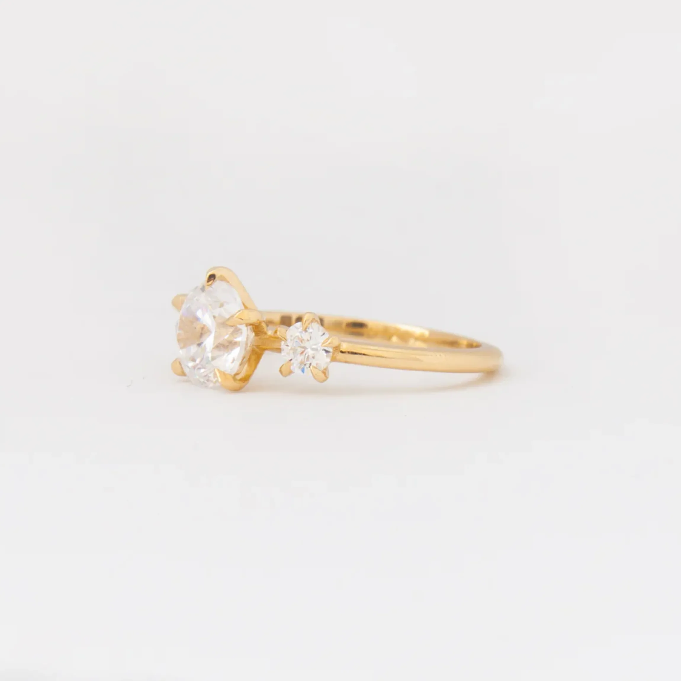 18 karat yellow gold set with a 1.25 round brilliant-cut G/H VS white diamond center and two round brilliant-cut white diamonds totaling an additional 0.36 carat.