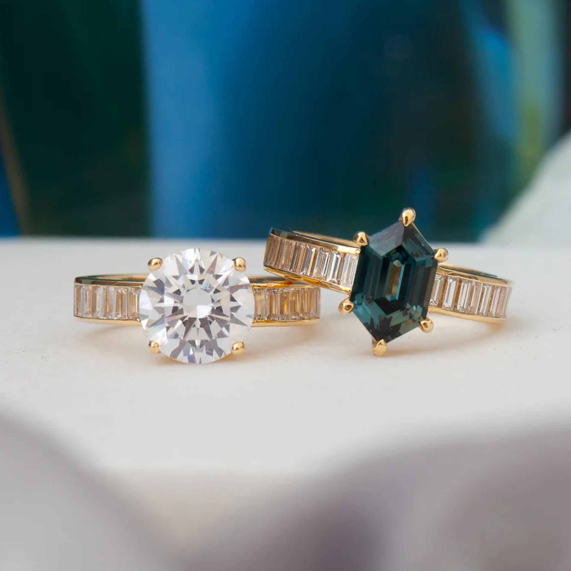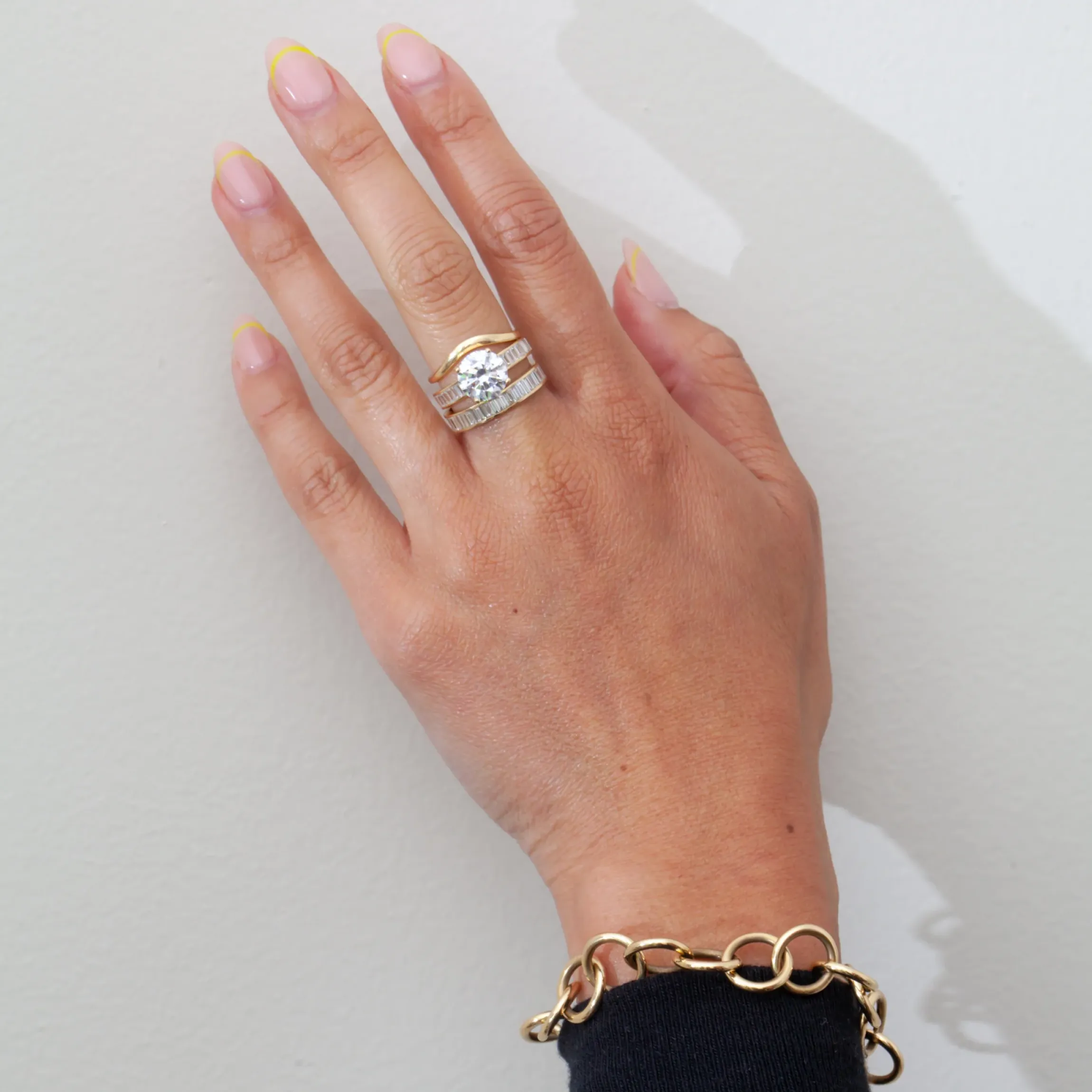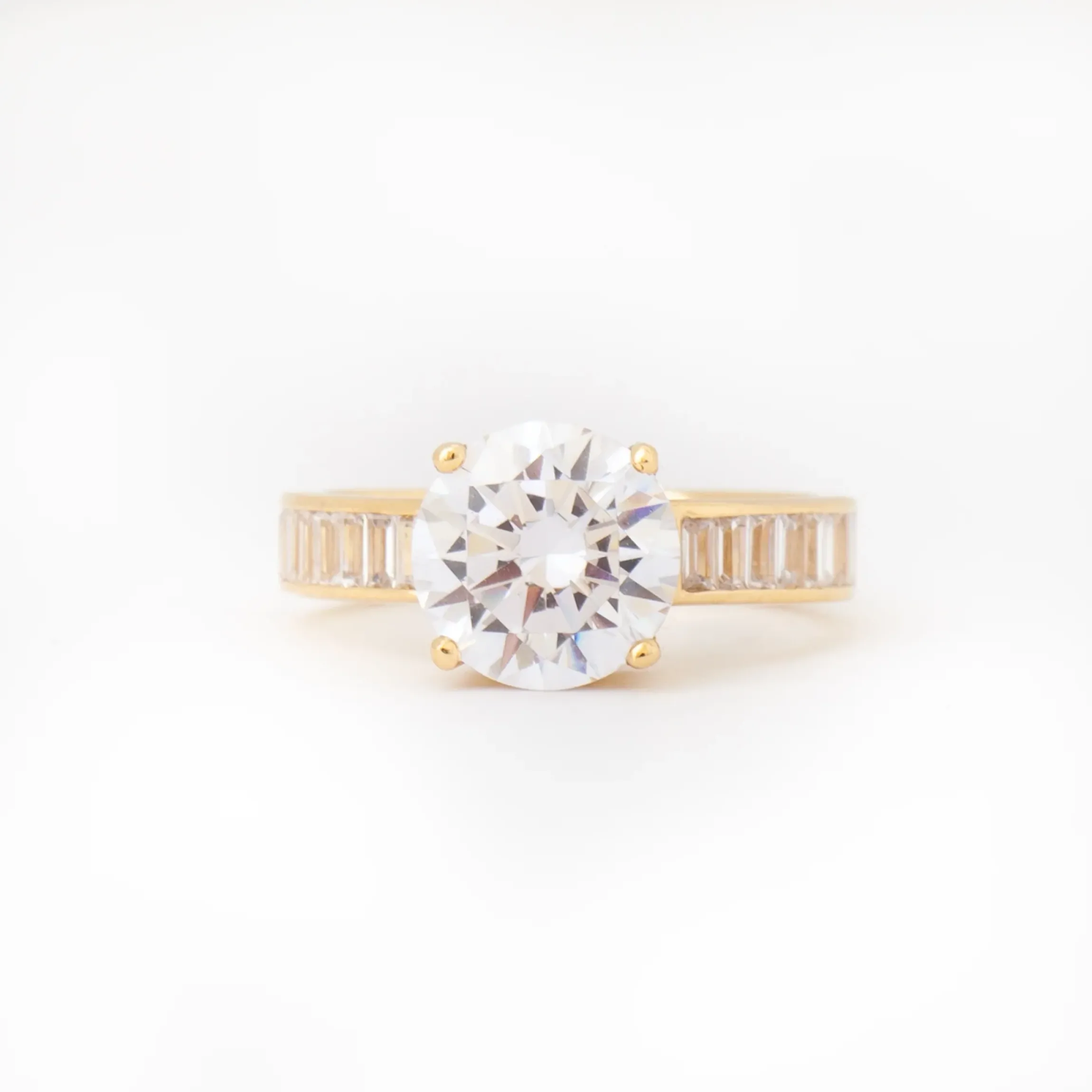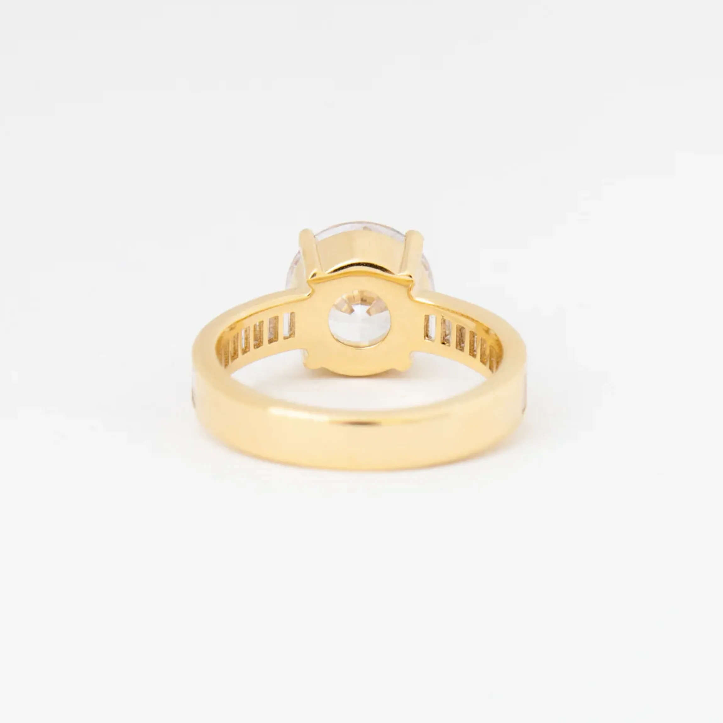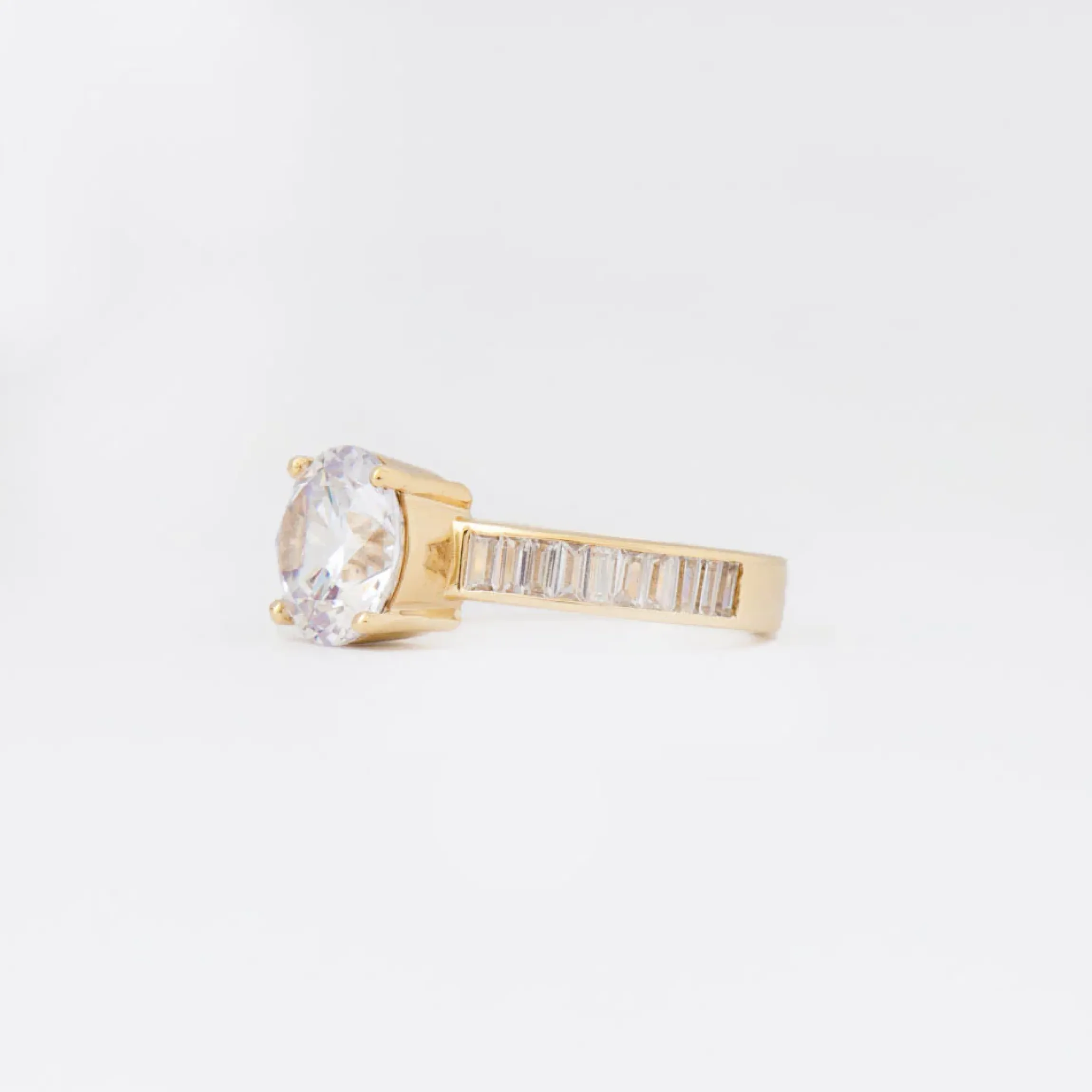 18 karat yellow gold set with a round brilliant-cut (G/H VS) white diamond with baguette-cut white diamonds totaling approximately 0.60 carat.