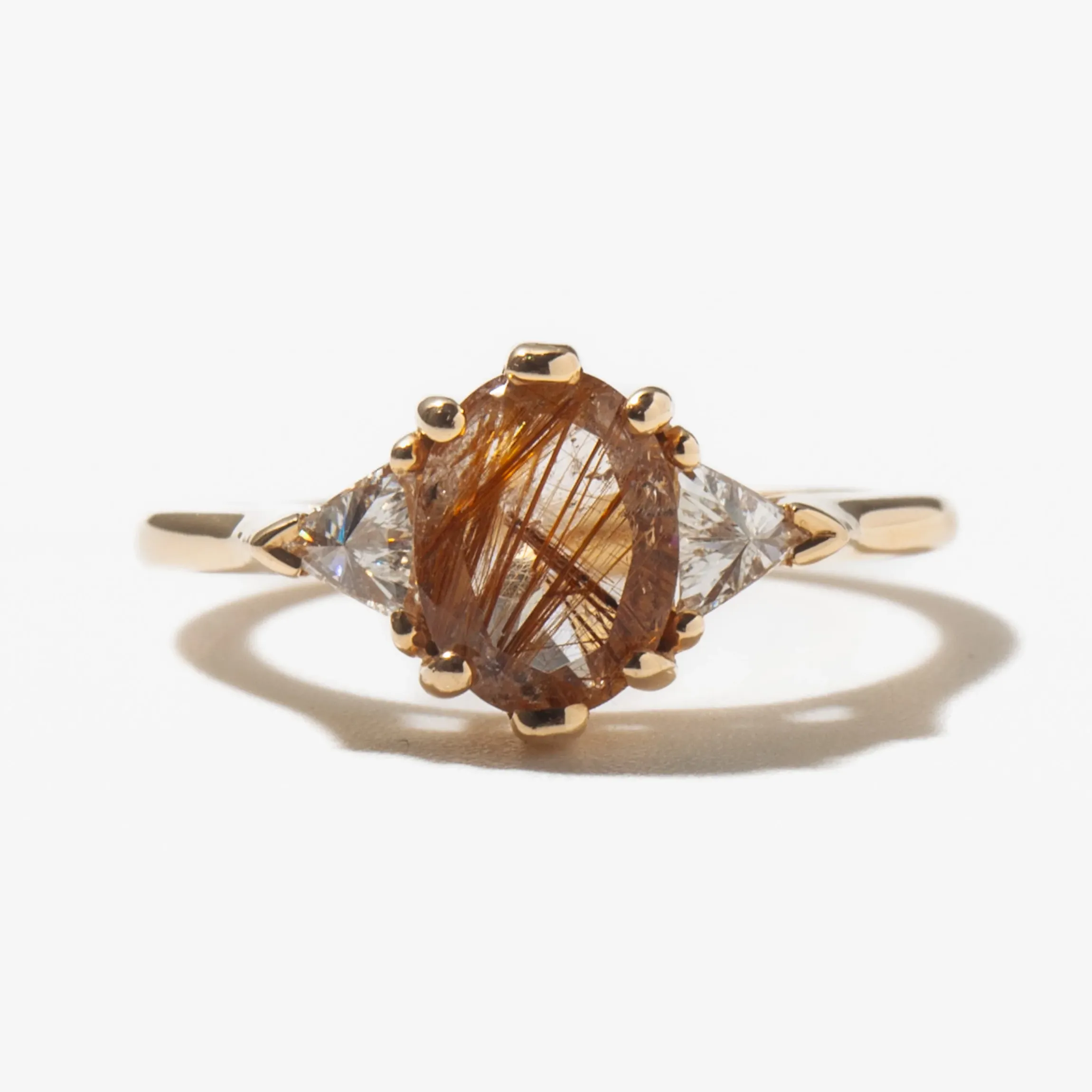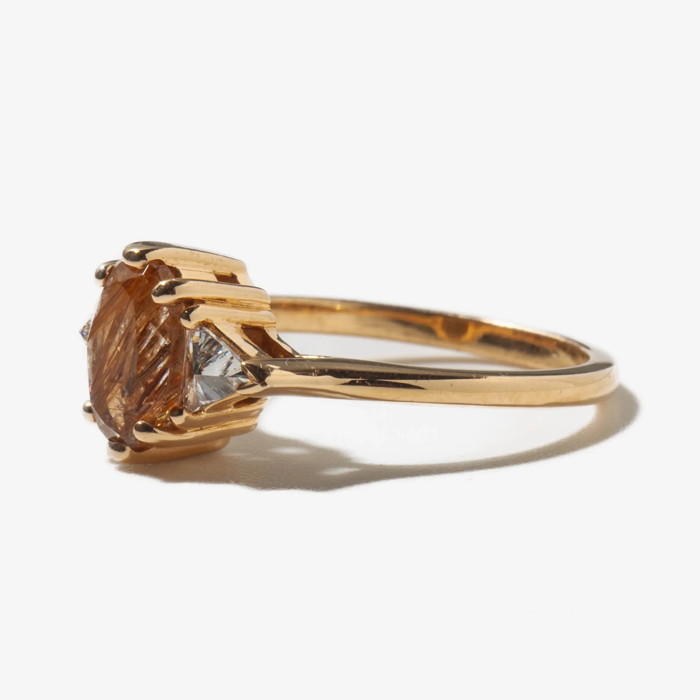 14 karat yellow gold set with a 8x6mm rutilated quartz oval center and two white diamond triangles totaling 0.14 carat.