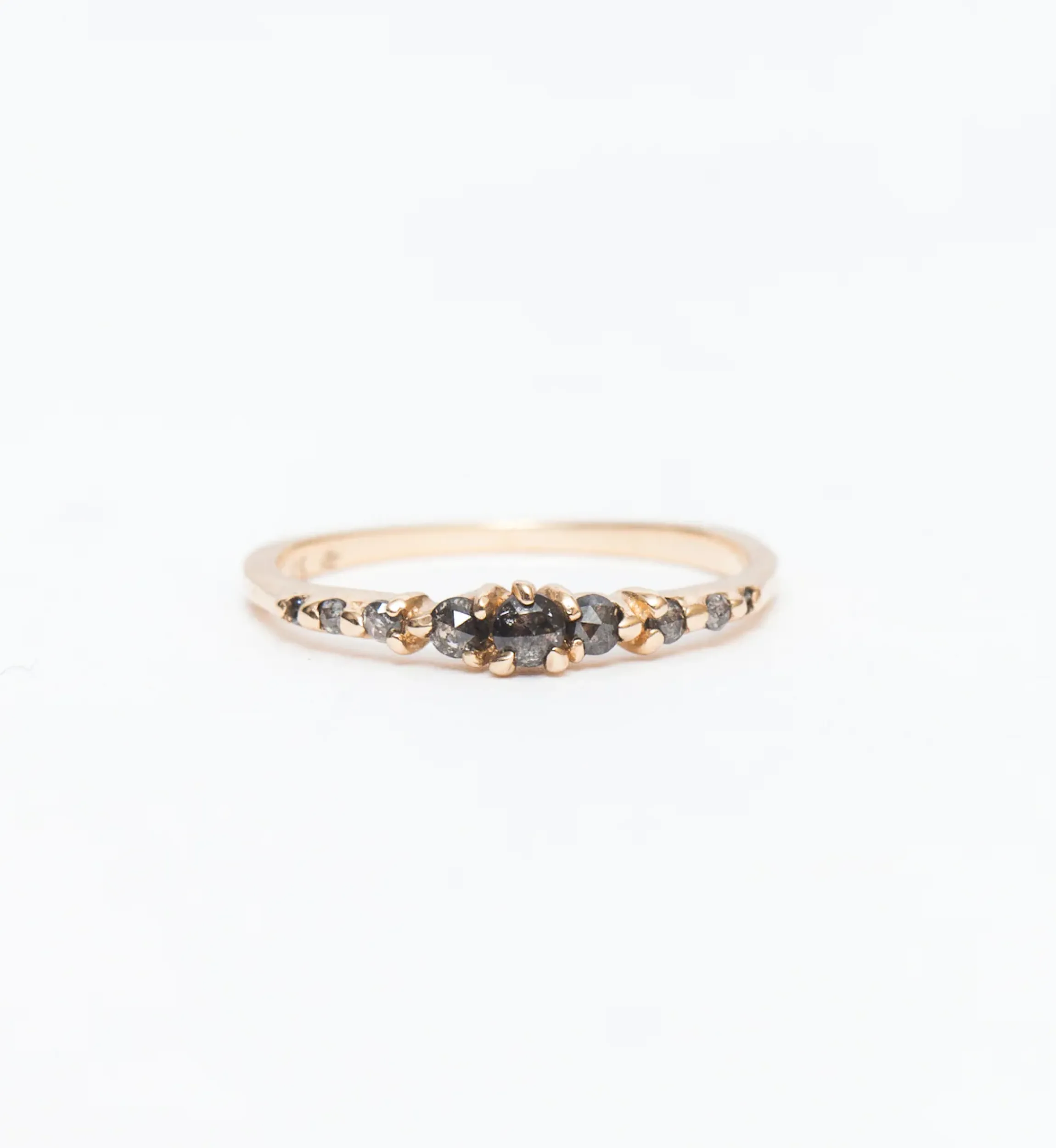 This edgy sister style to the classic Cyndra Ring favors smokey drama over traditional sparkle. A full complement of salt and pepper diamonds in rose-cut and brilliant-cut round shapes stud the golden band, each carefully set into Laurie Fleming’s meticulously hand-carved design. Whether you wear it alone as a sleek statement piece or for contrast in a classic bridal stack, you’ll love the balance of feminine grace and edgy modernity. Made in Canada.