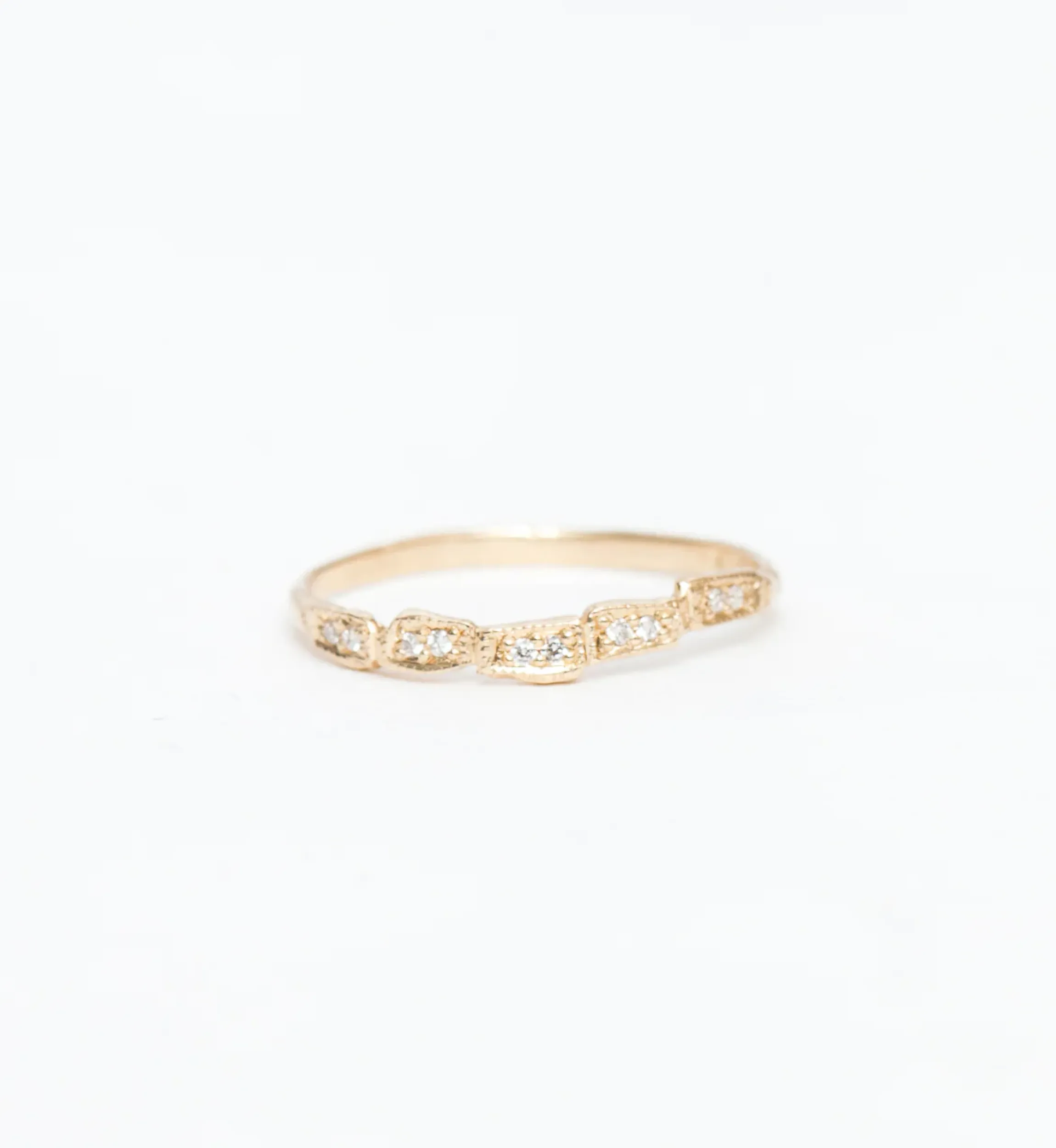 The offset shapes of this half eternity band evoke the look of a cobblestone road and play with the origins of diamond pavé, which is French for “paved”. Proving that the journey is much more interesting than the destination, this ring draws the eye left and right across its twinned sets of diamonds set within milgrain beaded frames. Whether you wear it as an everyday stacker or as modern wedding band, you’ll always love taking the scenic route with this ring on. Made in the U.S.A.