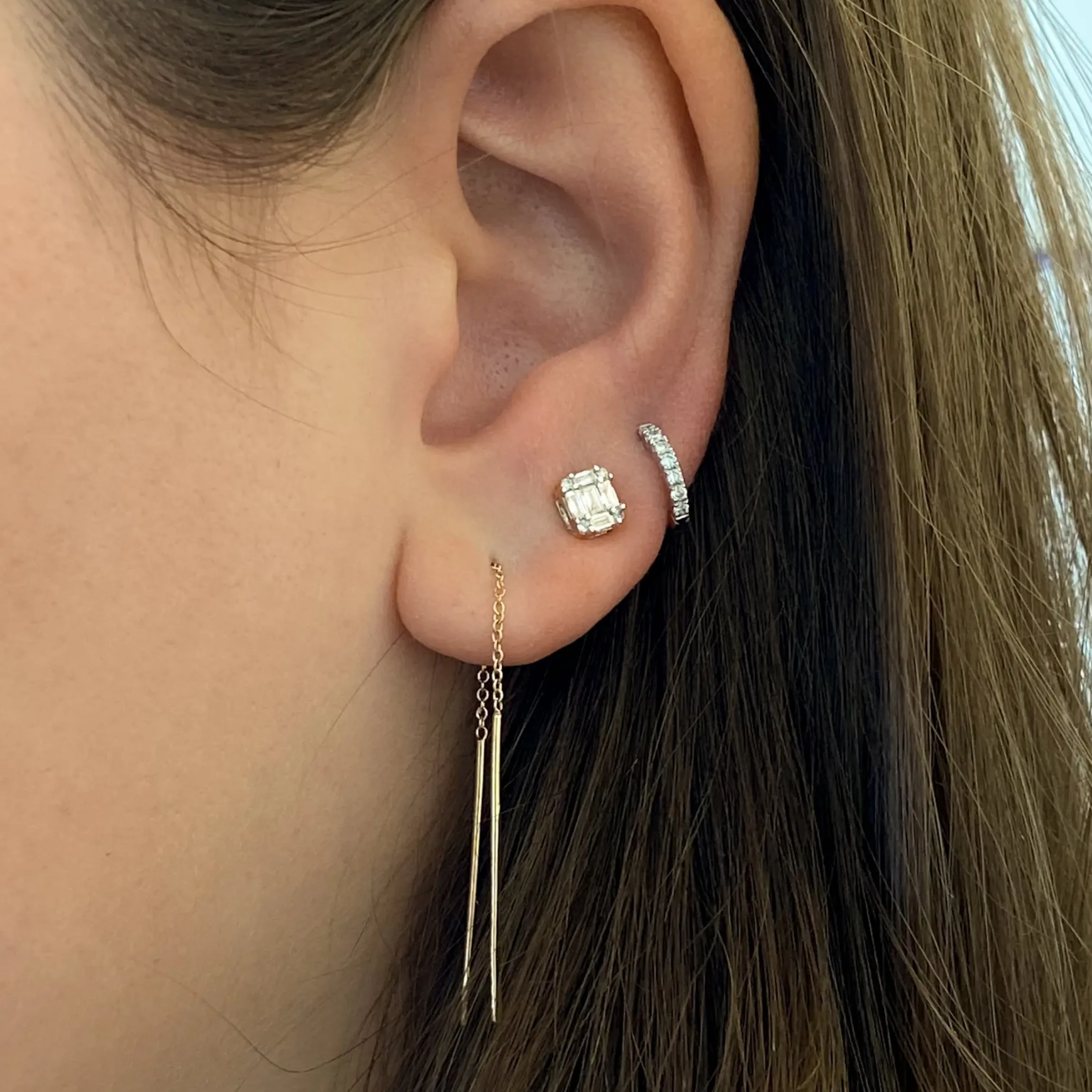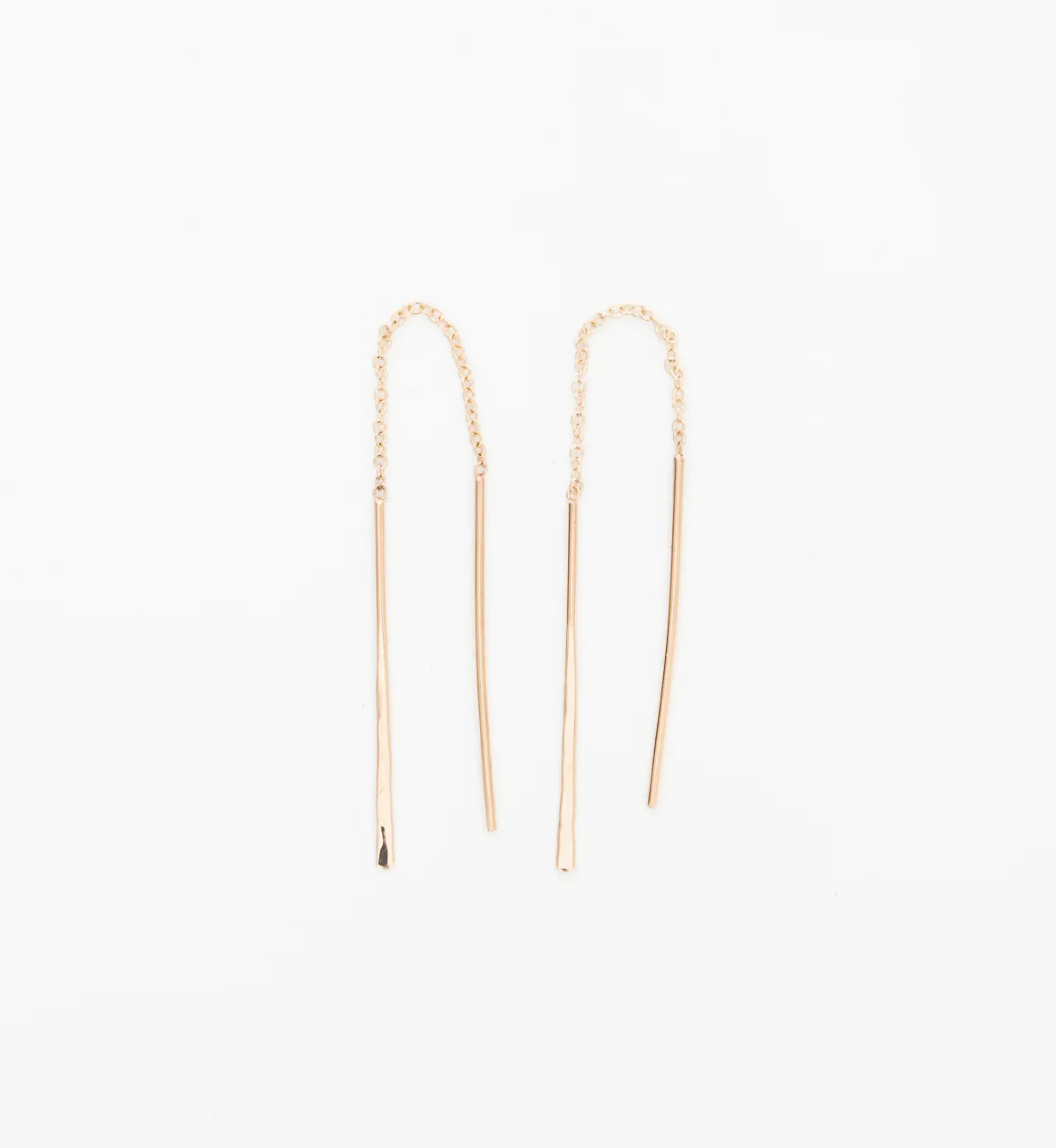 Two pieces of drawn wire, two lengths of chain, two textures—on paper, these earrings are absurdly simple. But put them on and see how easily you can tweak their look to suit any outfit. With one smooth and one hammered charm, these threader earrings showcase solid gold in two distinctly different finishes. Their reversible, free-hanging design allows endless adjustments so you get the perfect look, the perfect drop, every time. Made in the U.S.A.