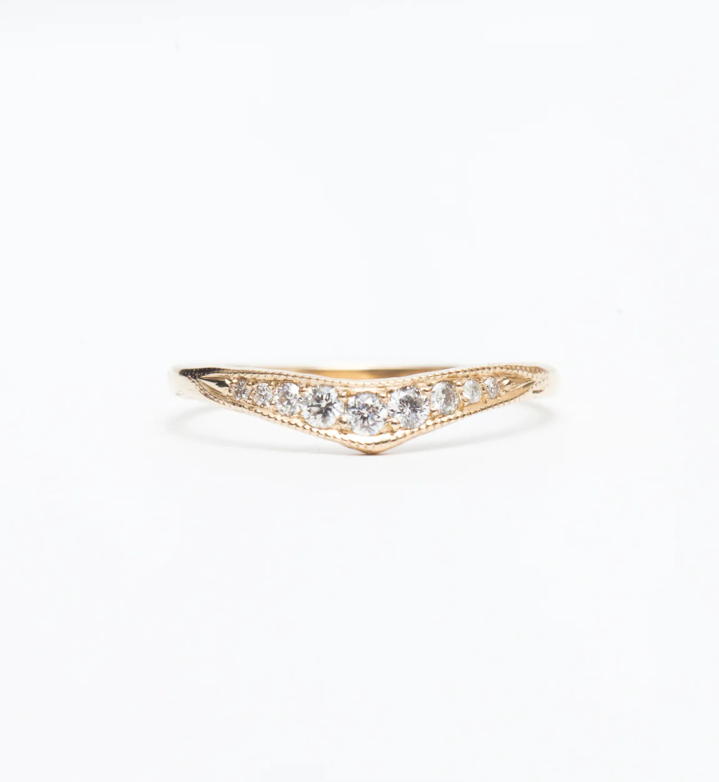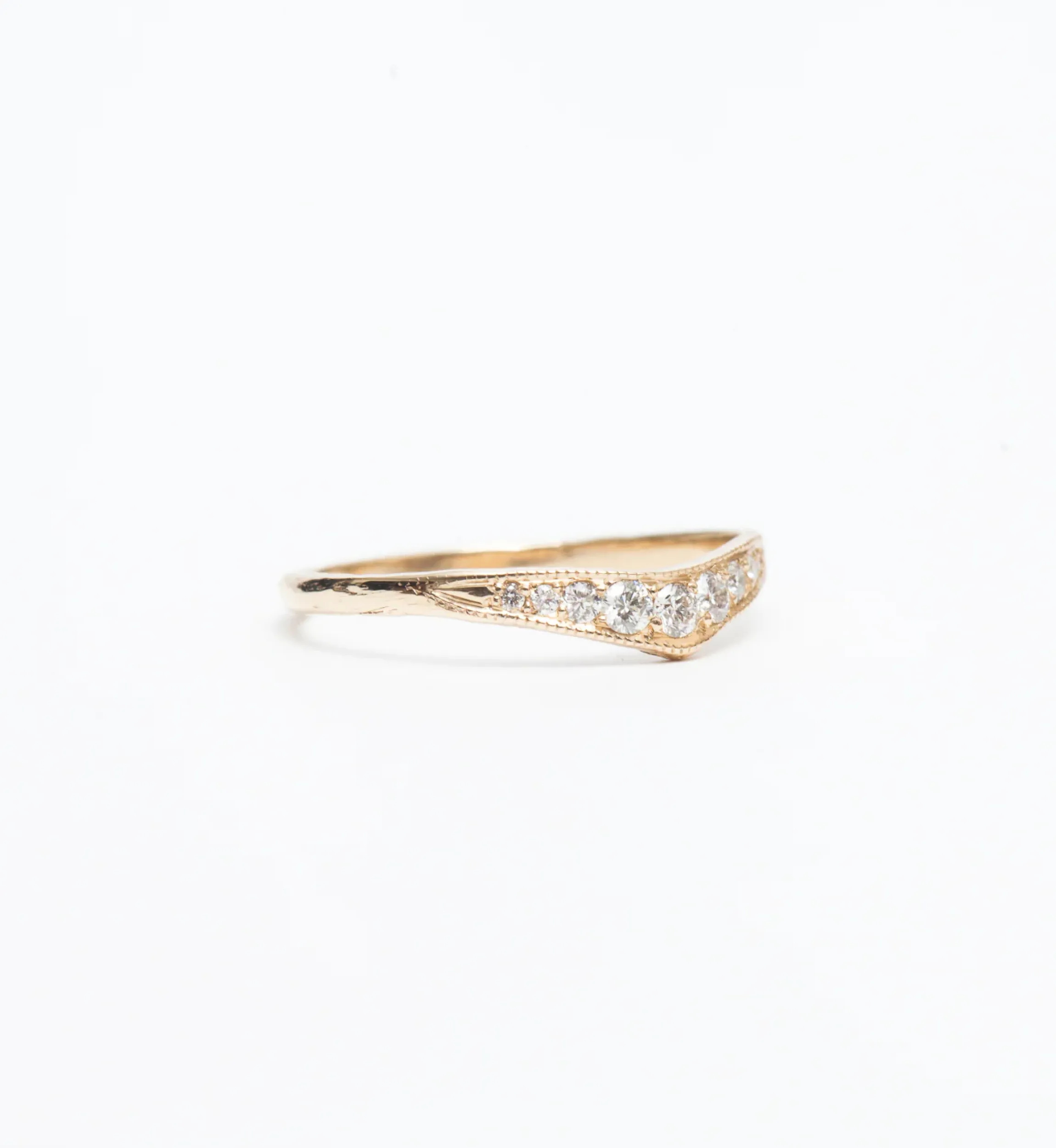 A tapered and angled band of gold, edged with milgrain beads, serves double duty as an elegant stacker or a spectacular wedding band. Cast from a hand-carved mold, this ring captivates because of its subtle and artistic variations. Pair this style with minimal solitaires for a big dose of sparkle or mix it into your favorite contoured bands to create a dazzling overload of shapes and shine. Made in the U.S.A.