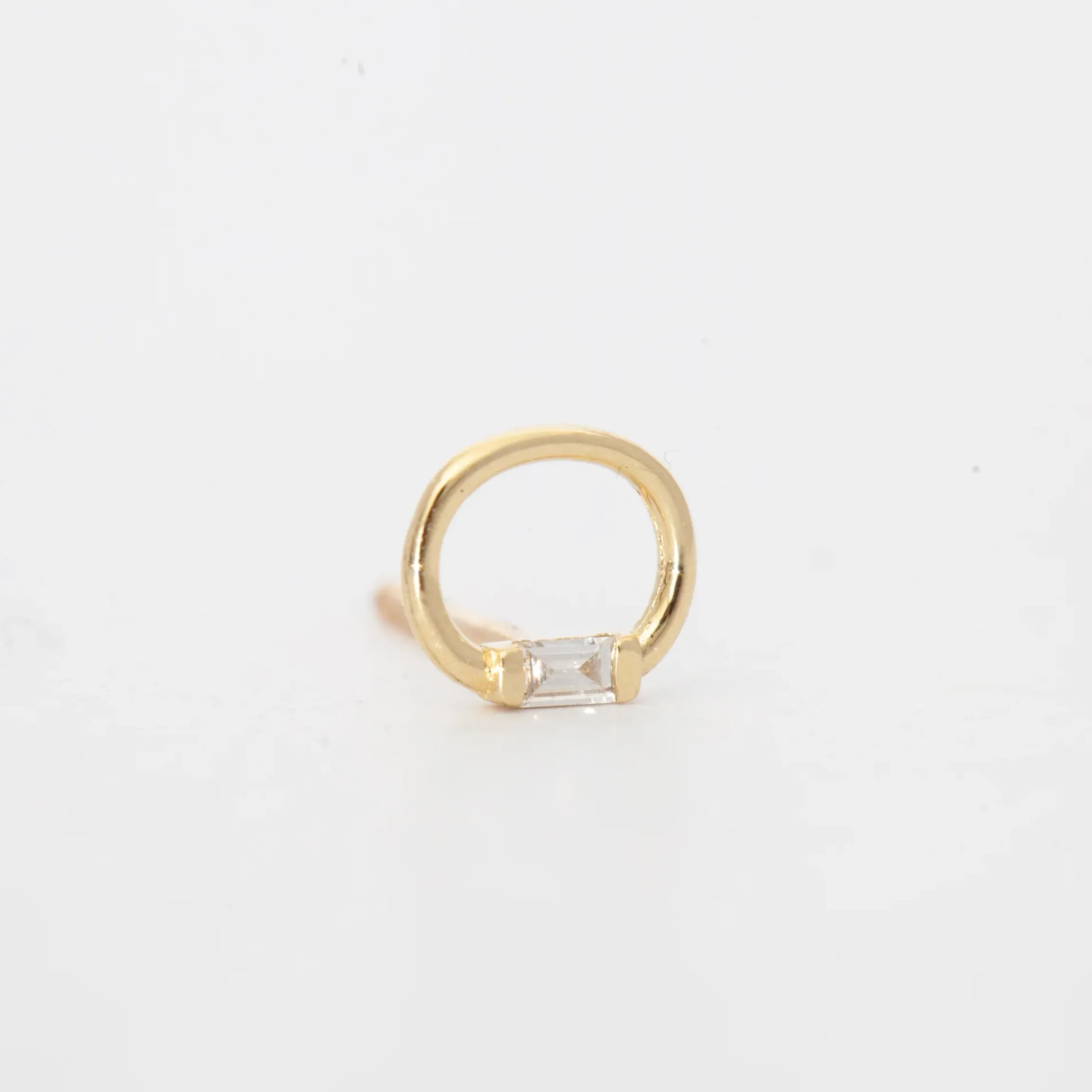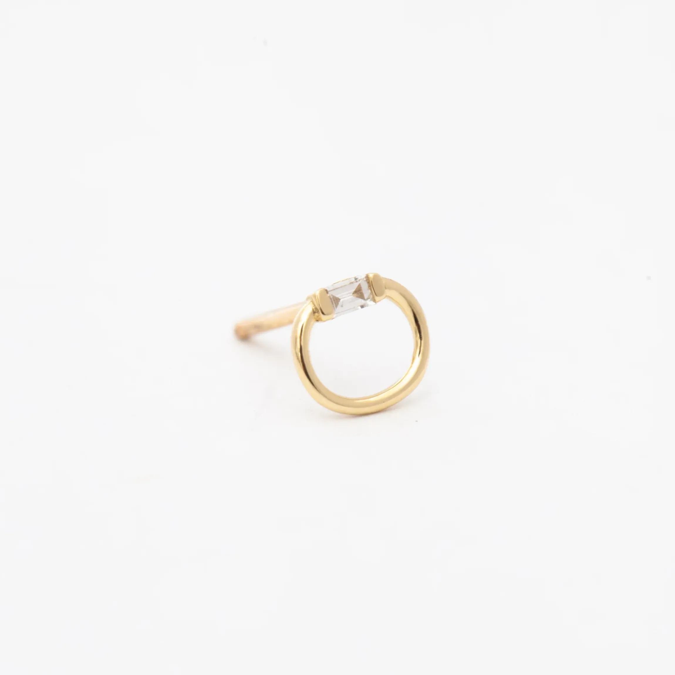 This tiny stud by Jennie Kwon is inspired by the much larger door knocker hoops that took the world by storm in the ’80s. The gleaming gold loop and sparkling baguette diamond make it a gorgeous everyday piece, unique enough to be worn alone and delicate enough to add to any ear stack. Made in the U.S.A.