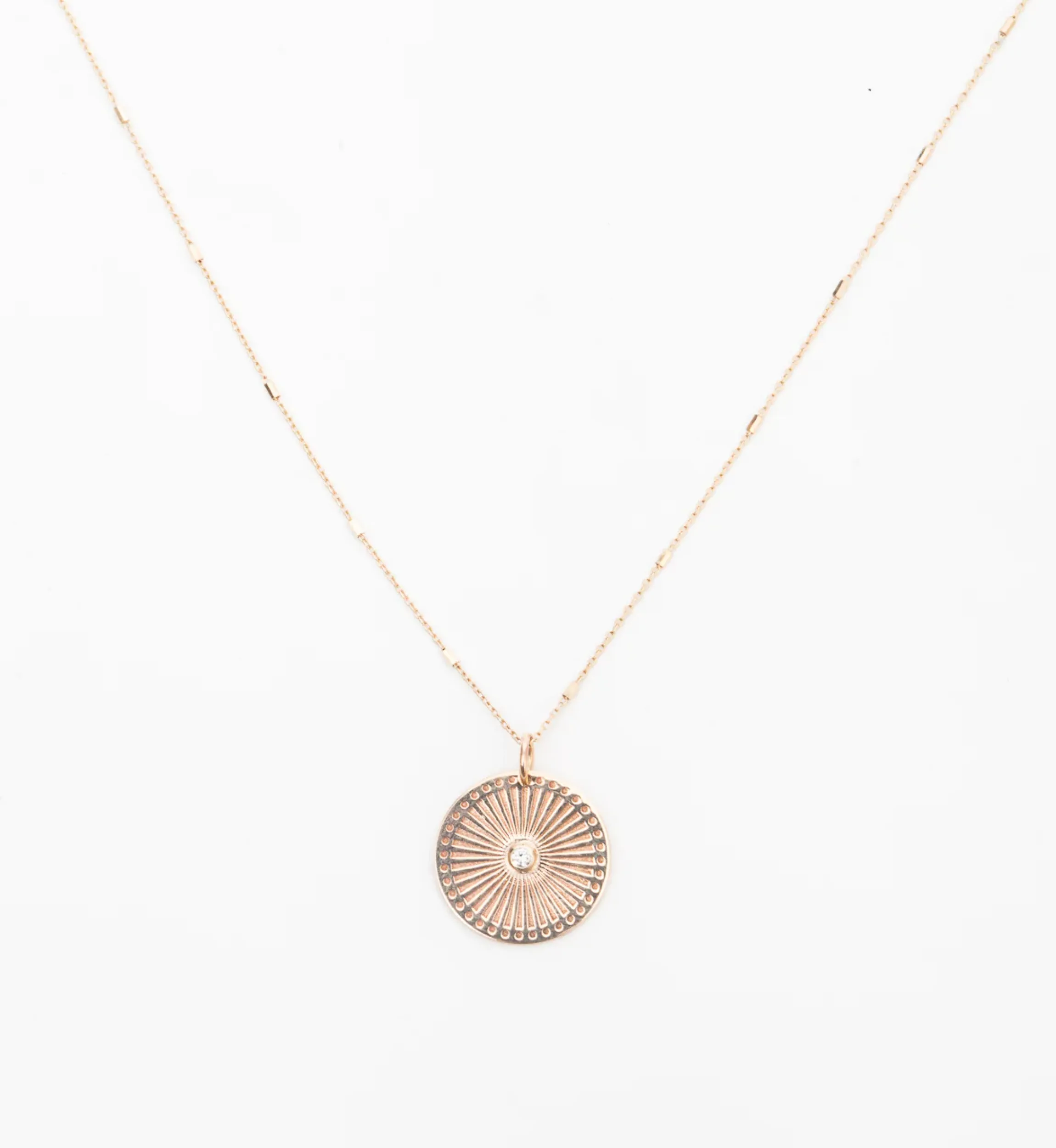 Be your own sunshine with the lovely combination of beaded chain, textured metal, and sparkling diamond on this necklace. A burst of lines and dots radiate out from a single bezel-set diamond while floating along gold chain studded with tiny bars. The slightly longer length makes it perfect for wearing alone with extra simple outfits. Finished with hallmarked logo plate and spring-ring clasp. Made in the U.S.A.