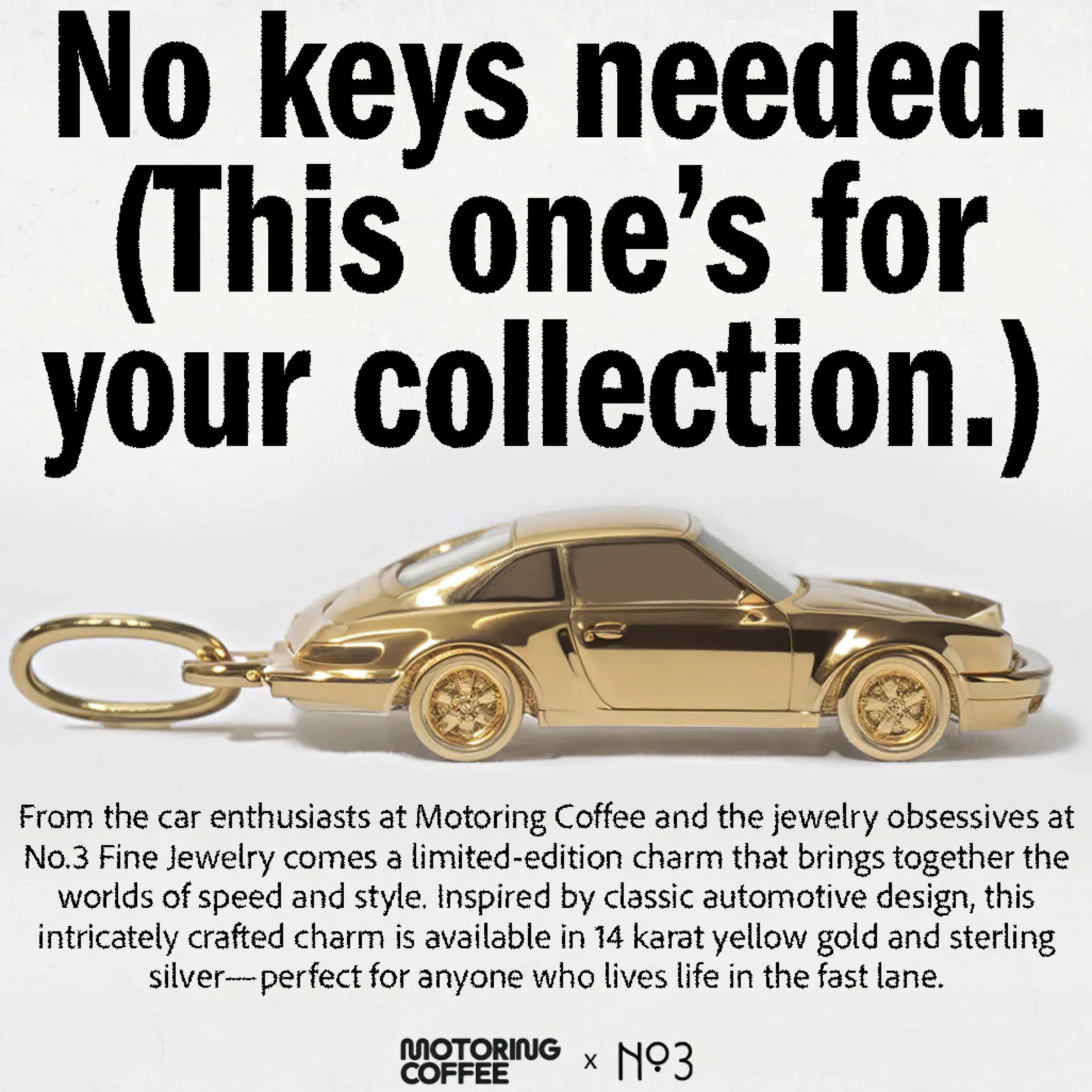 From the car enthusiasts (u0026amp; our new neighbors) at Motoring Coffee and the jewelry obsessives at No.3 Fine Jewelry comes a limited-edition charm that brings together the worlds of speed and style. Inspired by classic automotive design, this intricately crafted charm is available in 14 karat yellow gold and sterling silver—perfect for anyone who lives life in the fast lane.
