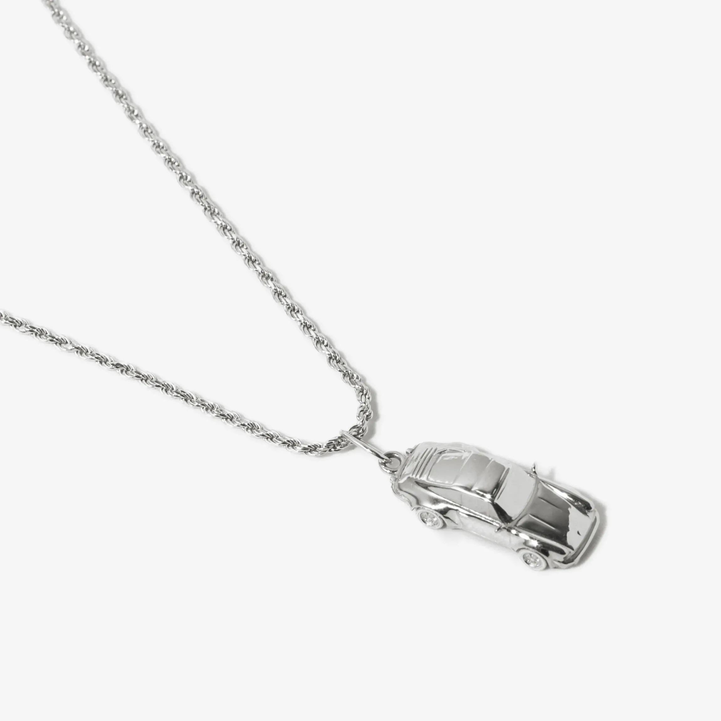 14k yellow gold or sterling silver sports car charm on an 18″ long necklace.