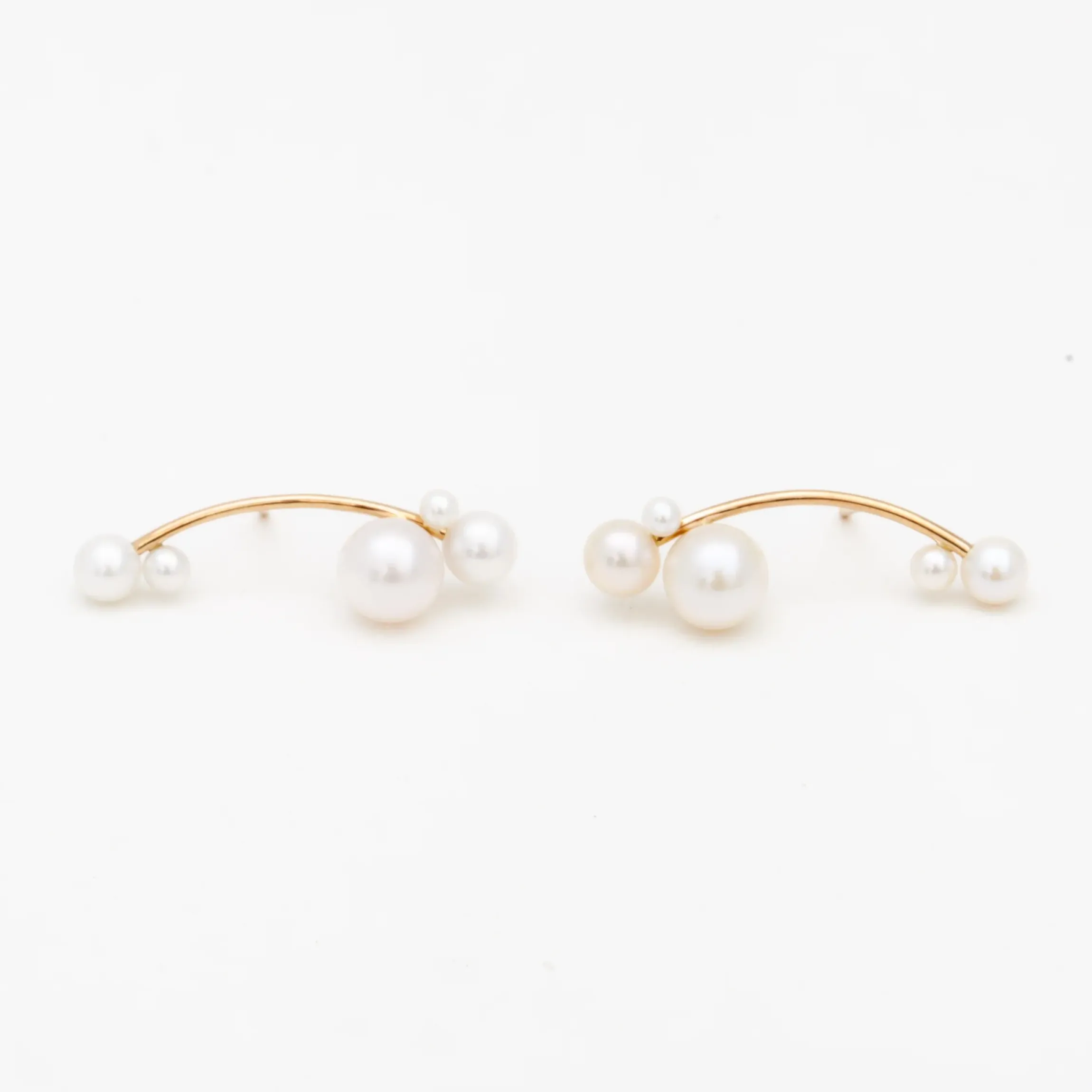 These artful earrings, designed by Sophie Bille Brahe in Copenhagen, feel like anything but ordinary. With a playful twist on the traditional pearl stud, these earrings feature an asymmetrical composition of gleaming gold and opalescent pearls combined to form the perfect statement earring perfect for your wedding day or a night out. Sold as a pair.