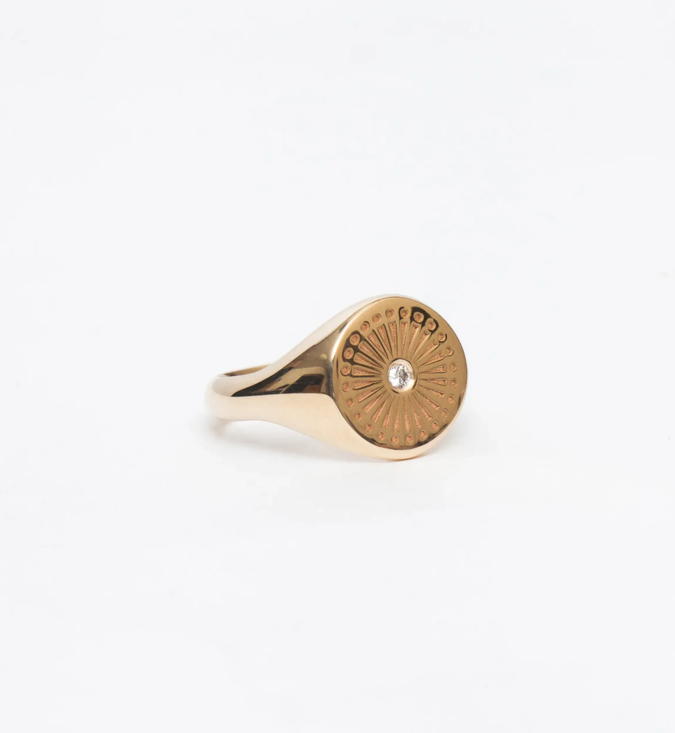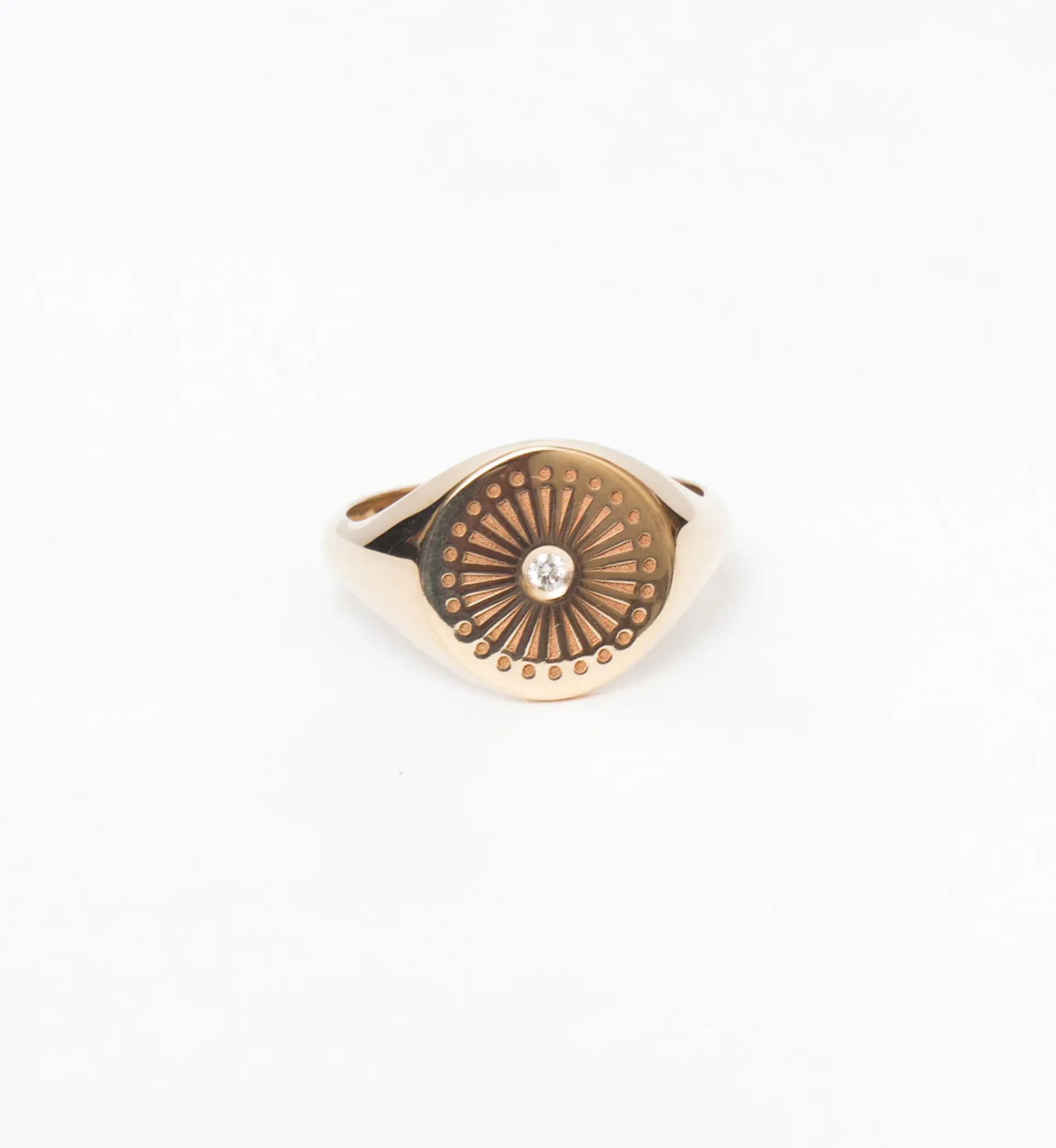 You’ll feel as powerful as the sun itself when you slip on this beautifully textured signet ring. Engraved rays and delicate dots burst from the diamond center of this circular design, covering its face in geometric splendor. Made in the U.S.A.