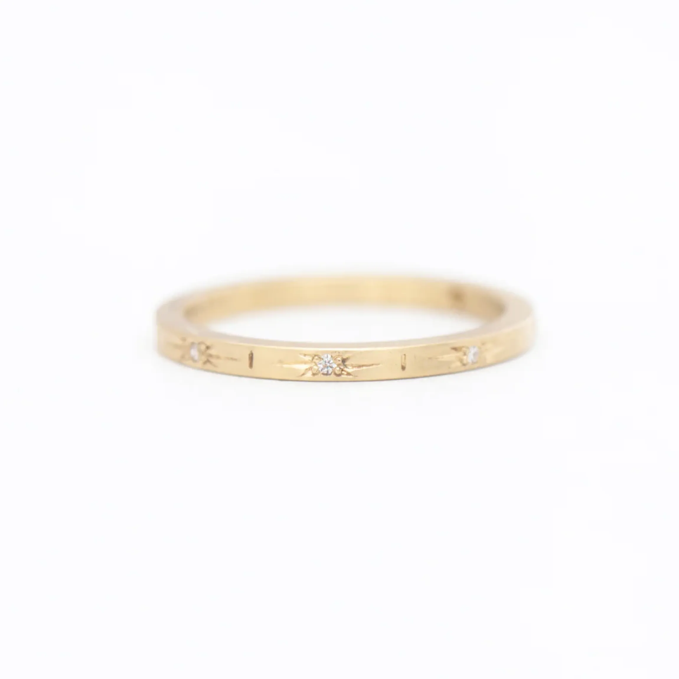 This versatile ring is simple yet magical, a totem for everyday elegance. Five diamonds sparkle in their hand-engraved star settings set three quarters around the ring’s curve. Perfect as a wedding band or as an addition to an everyday ring stack. Made in the U.S.A.