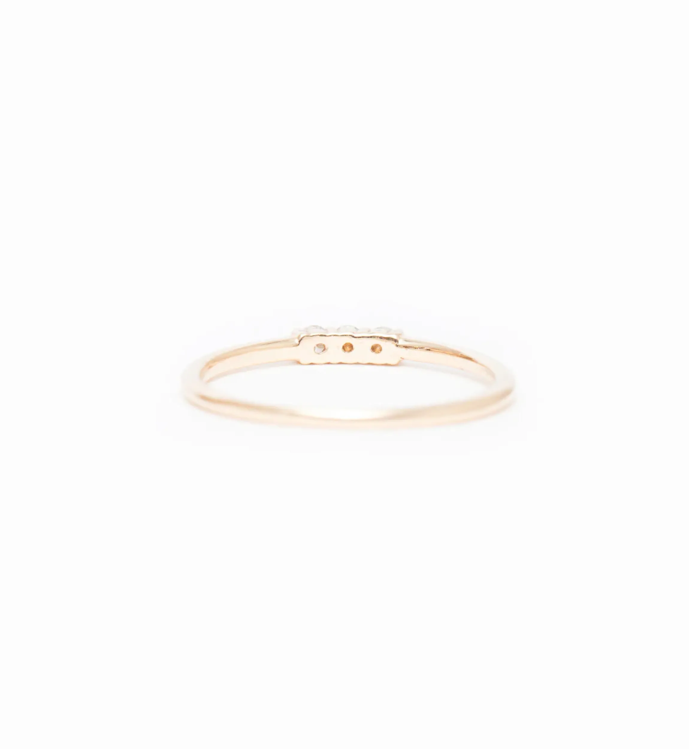 The latest addition to Jennie Kwon’s “Equilibrium” series puts the focus squarely on the round…diamond, that is. Three round brilliant diamonds glisten from a slightly elevated setting while the signature hand-drawn wire band and flush diamond accents complete the look. Though it was designed as a fine fashion piece to add extra brightness to your favorite stack of rings, we bet you’ll love it as a super slender wedding band, too. Made in the U.S.A.