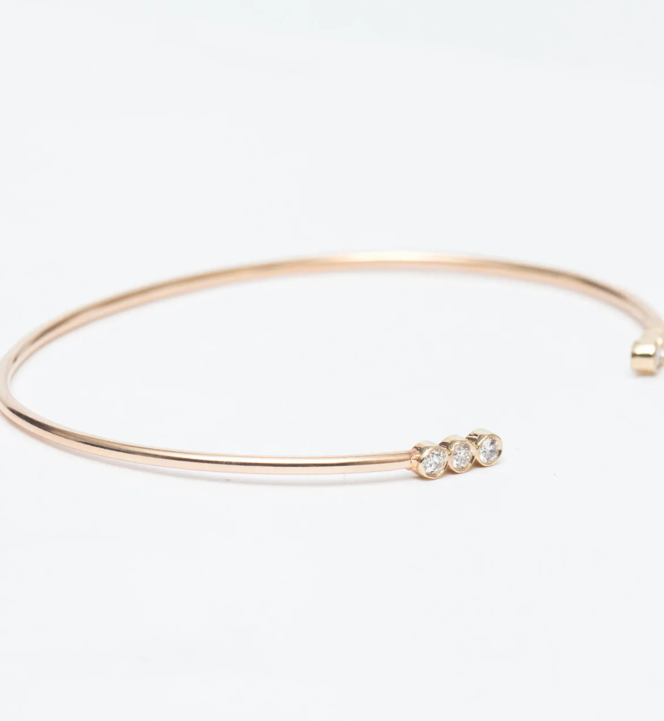 Matched trios of round white diamonds sit at each end of this svelte cuff bracelet for a dazzling accent that feels like you’re weighs almost nothing at all. Hand-drawn wire flexes gently for easy wear, slipping on your wrist and staying put all day long. Incredibly fine bezels securely hold each diamond in place without distracting from their elegant sparkle. Stack it with other wire cuffs to cover your wrist with sleek lines of gold punctuated with bright gemstones. Made in the U.S.A.