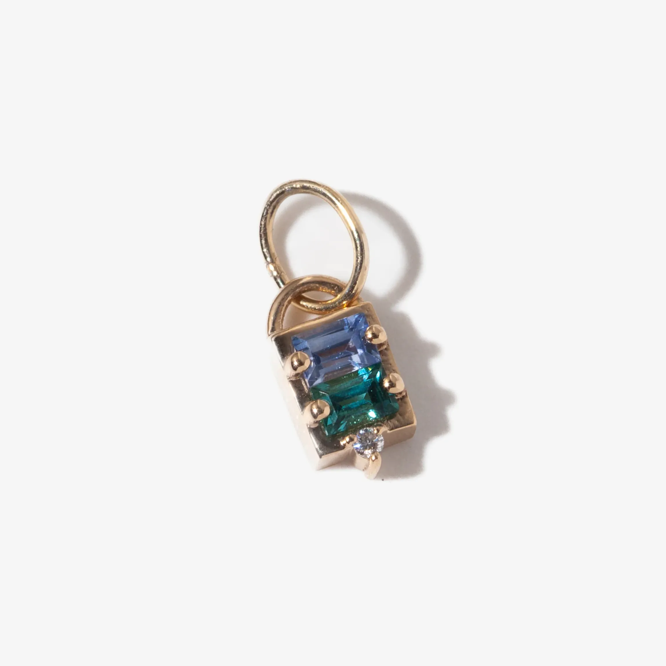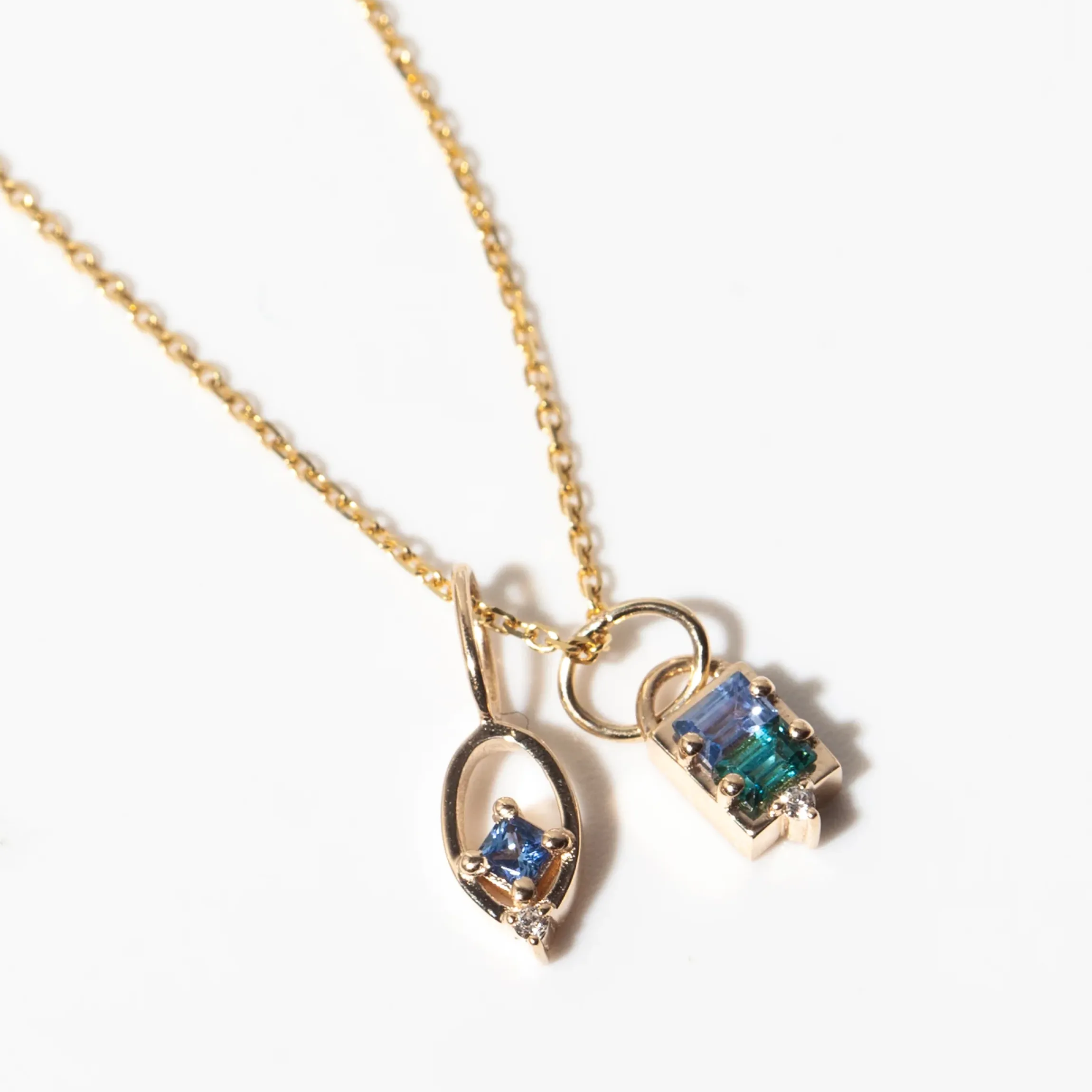Representing stability and strength in community, two baguette-cut stones, one sapphire and one tourmaline, align edged and perch atop a tiny reclaimed diamond. The saturated stones balance well with the glimmering gold making this piece an interesting to look at piece. Please note, this style is sold as a single pendant. Made in the U.S.A.