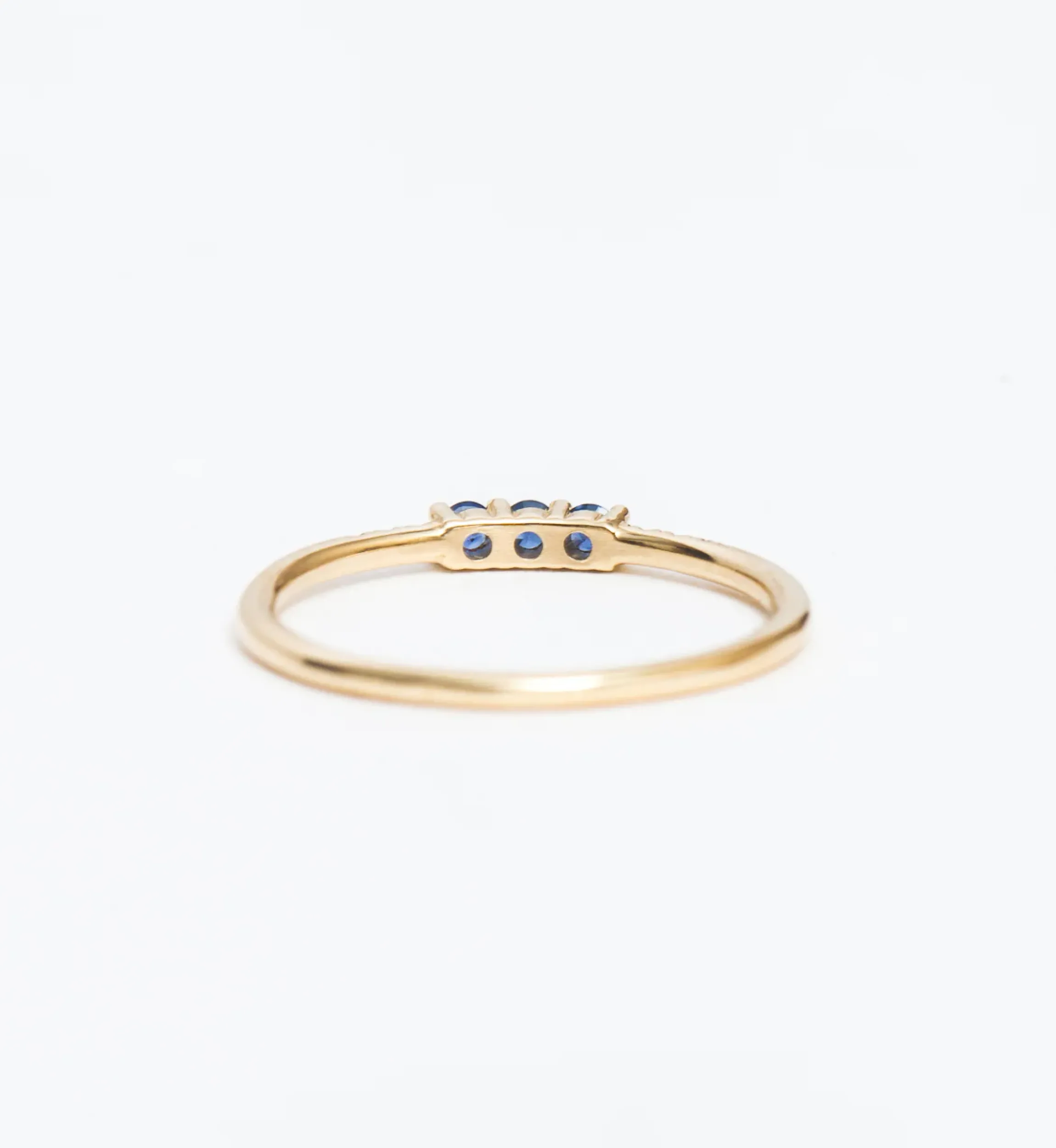 14 karat gold with three 2.0 mm round blue sapphires and six 1.0 mm round white diamonds.