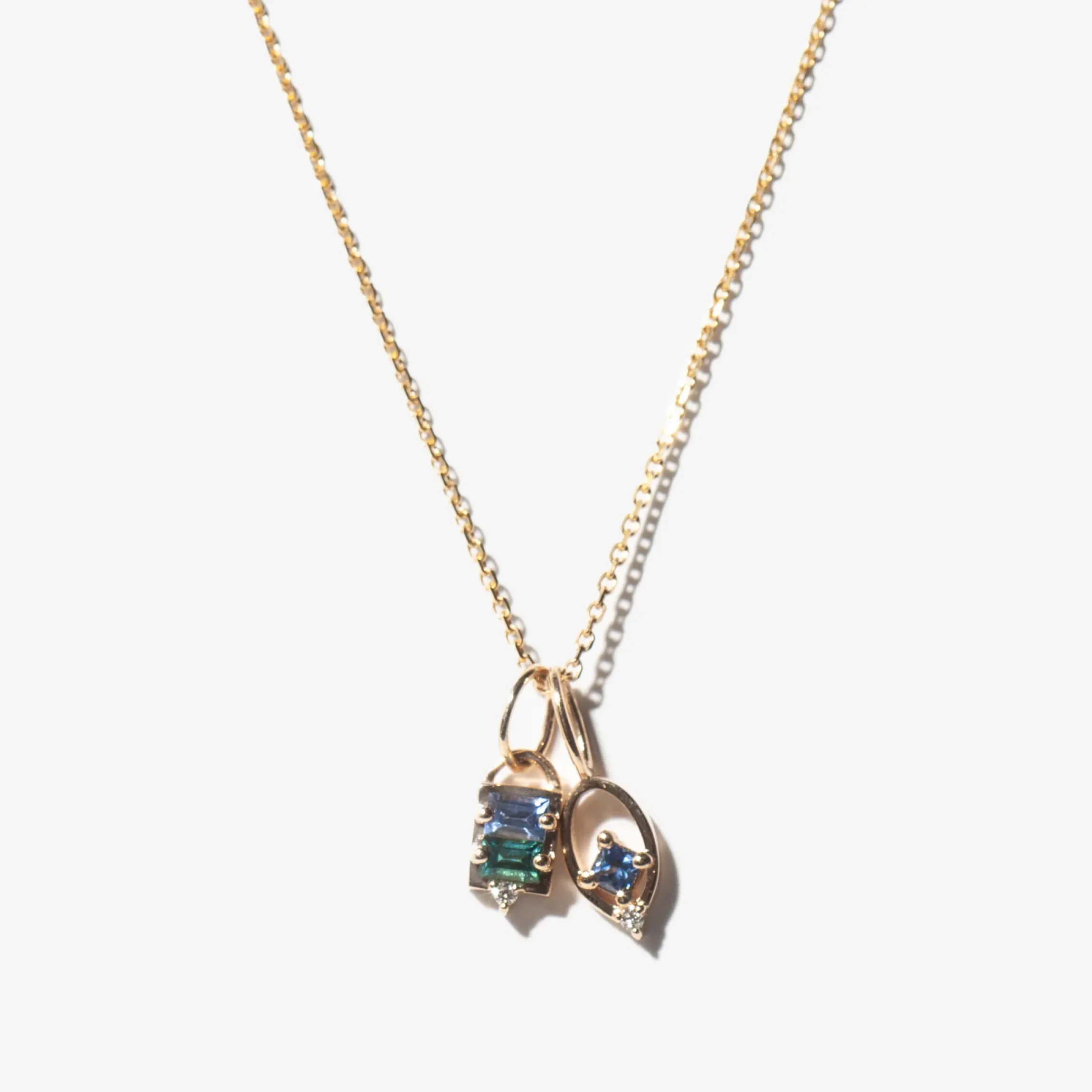 Numerologically, 2 is the representation of double and of harmony. Here, 2 stones balance one other and complete the piece. Featuring negative space, glimmering gold, a stunning round opal along with a tiny reclaimed diamond this is a stunning charm to add to your stack. Wear alone for a simple statement or with other charms as the perfect layering piece. Please note, this style is sold as a single pendant. Made in the U.S.A.
