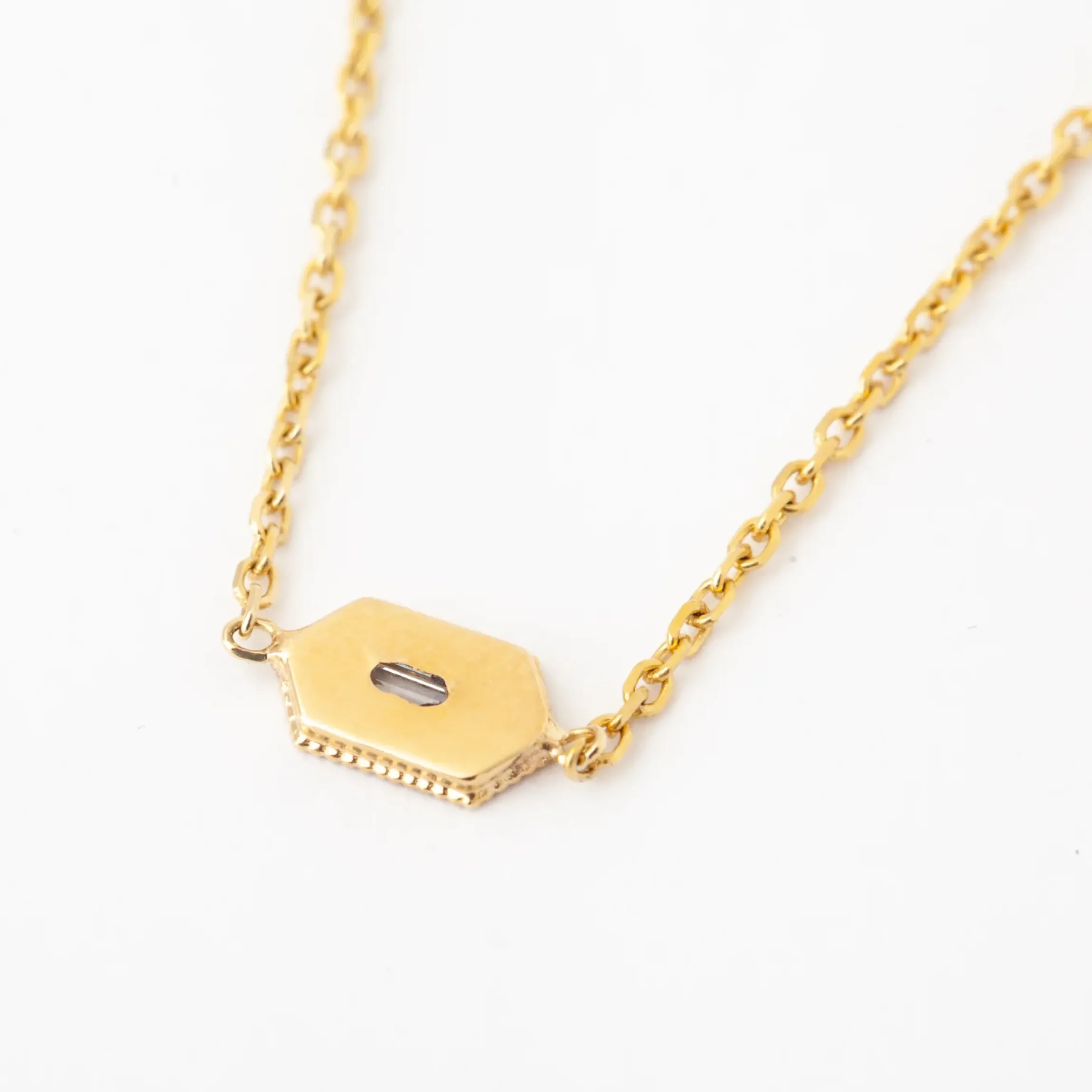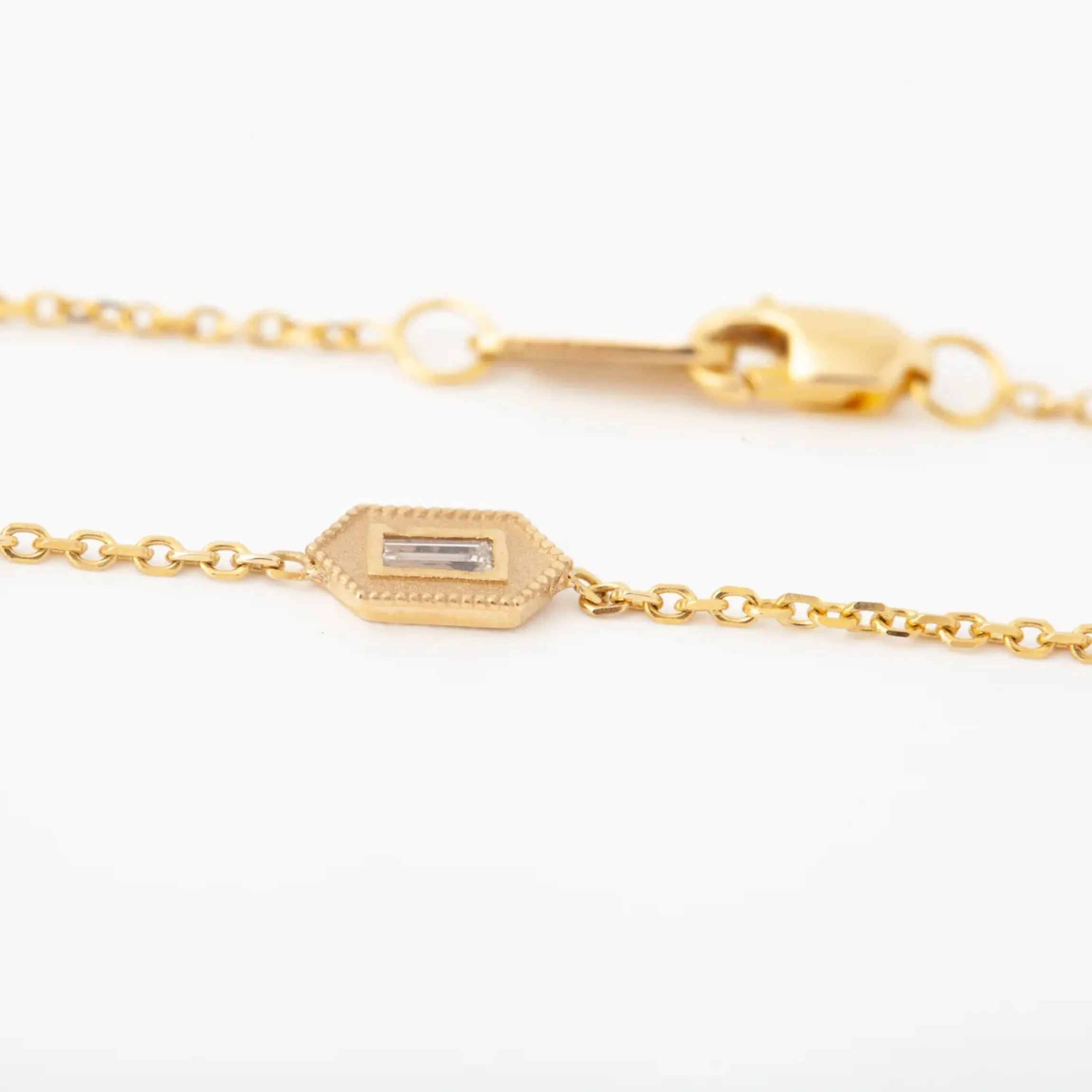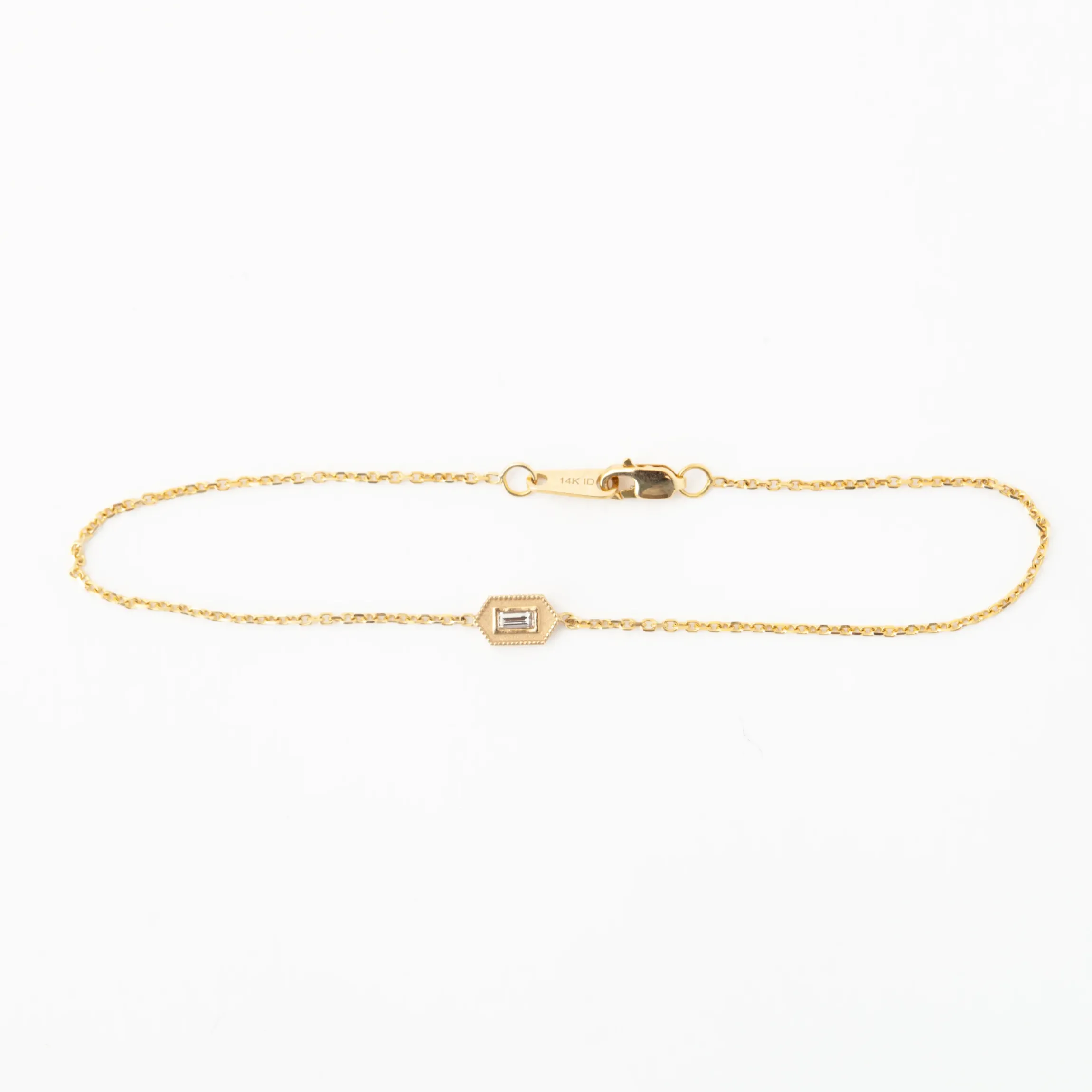 Like little windowpanes catching light, this bracelet is sure to add a little sparkle to your day. A baguette diamond sits in the center of a hexagon that is outlined with round 14k yellow gold beads. The small details on this bracelet ensures that it looks gorgeous from every angle.