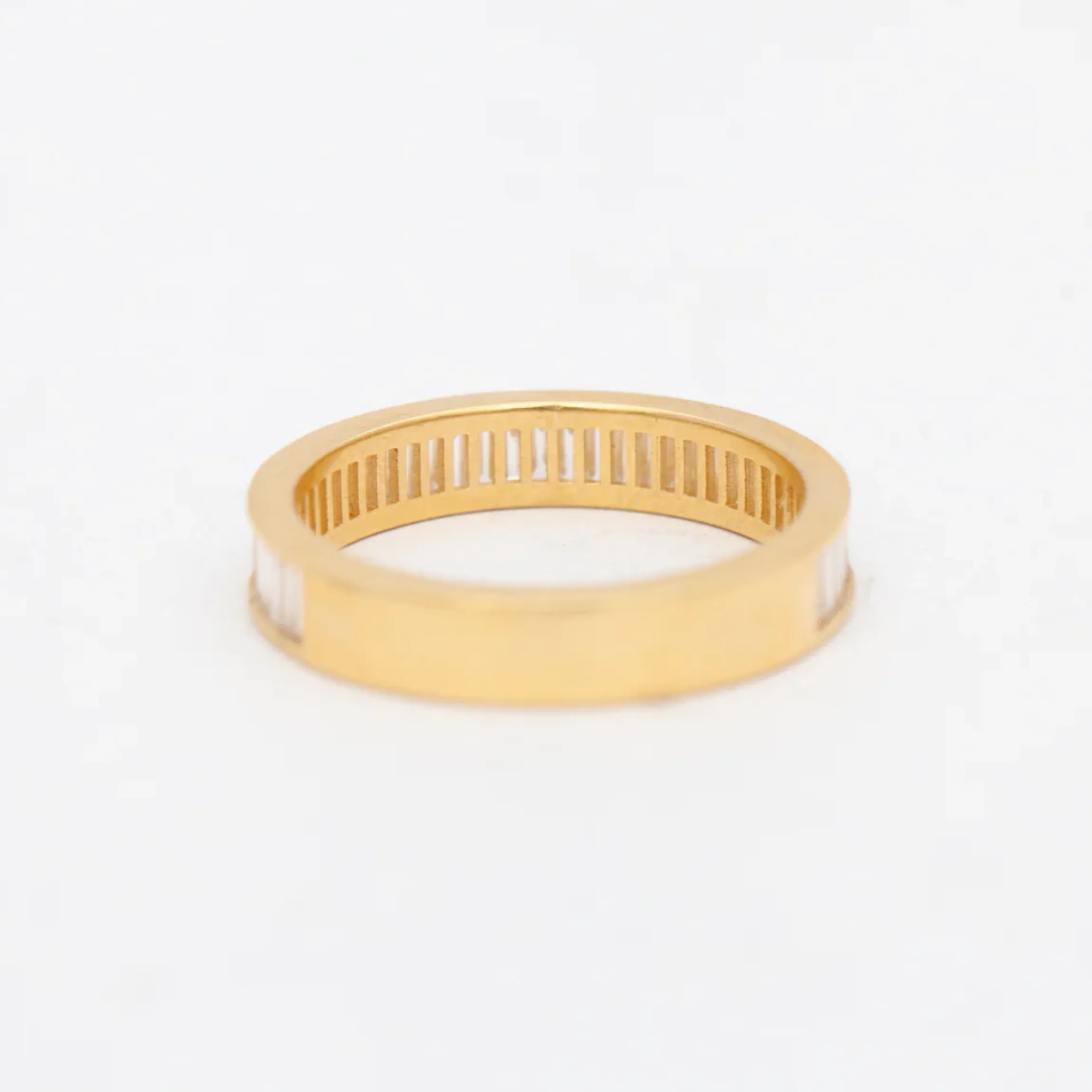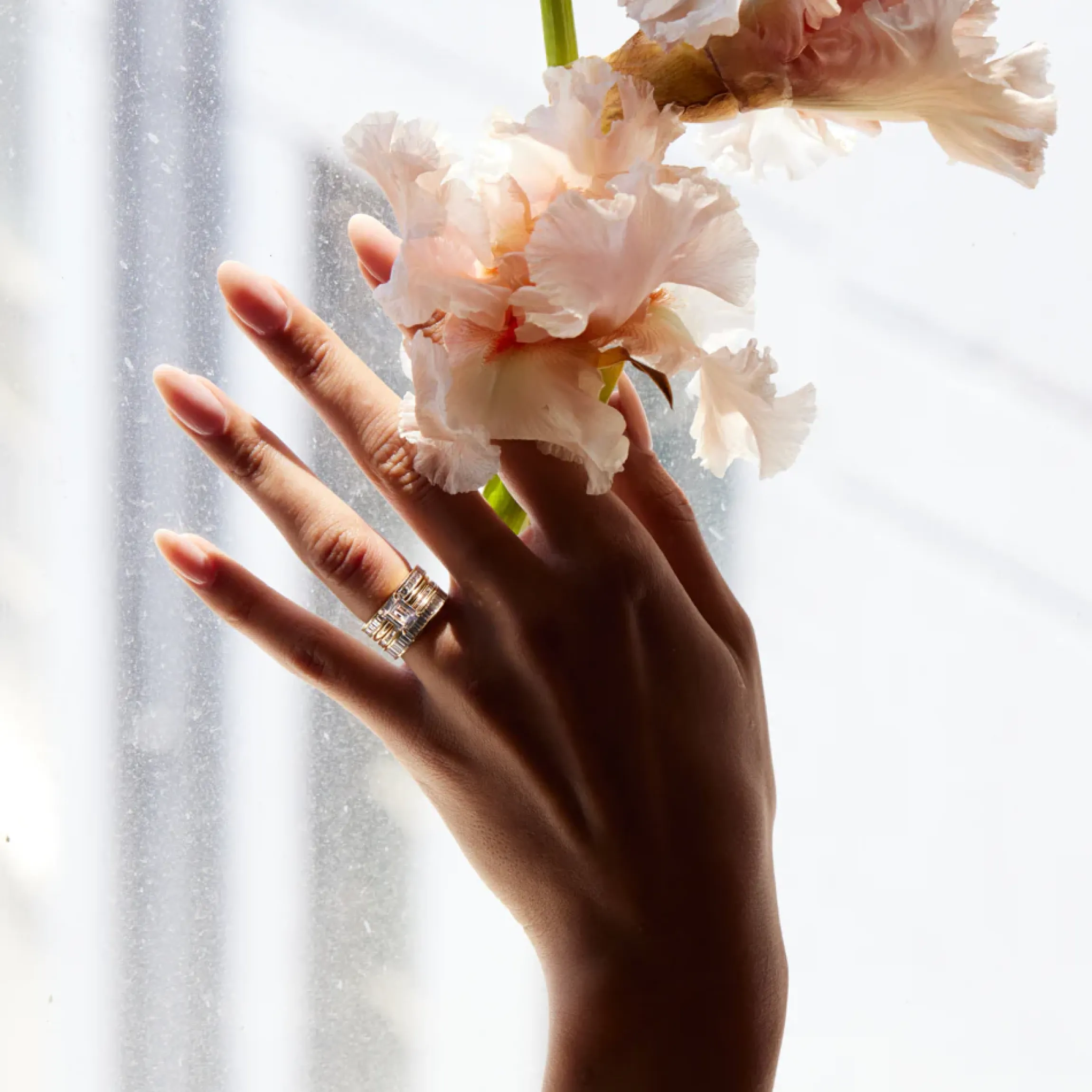 Maximalists rejoice—this channel-set band by The Future Fine sparkles like no other. A flush-set row of baguette diamonds acts like a wall of mirrors, catching the light from every direction. Pair this three-quarter eternity band with a round or oval engagement ring for a luxurious contrast of shapes and metals, or wear it as a statement piece on its own.
