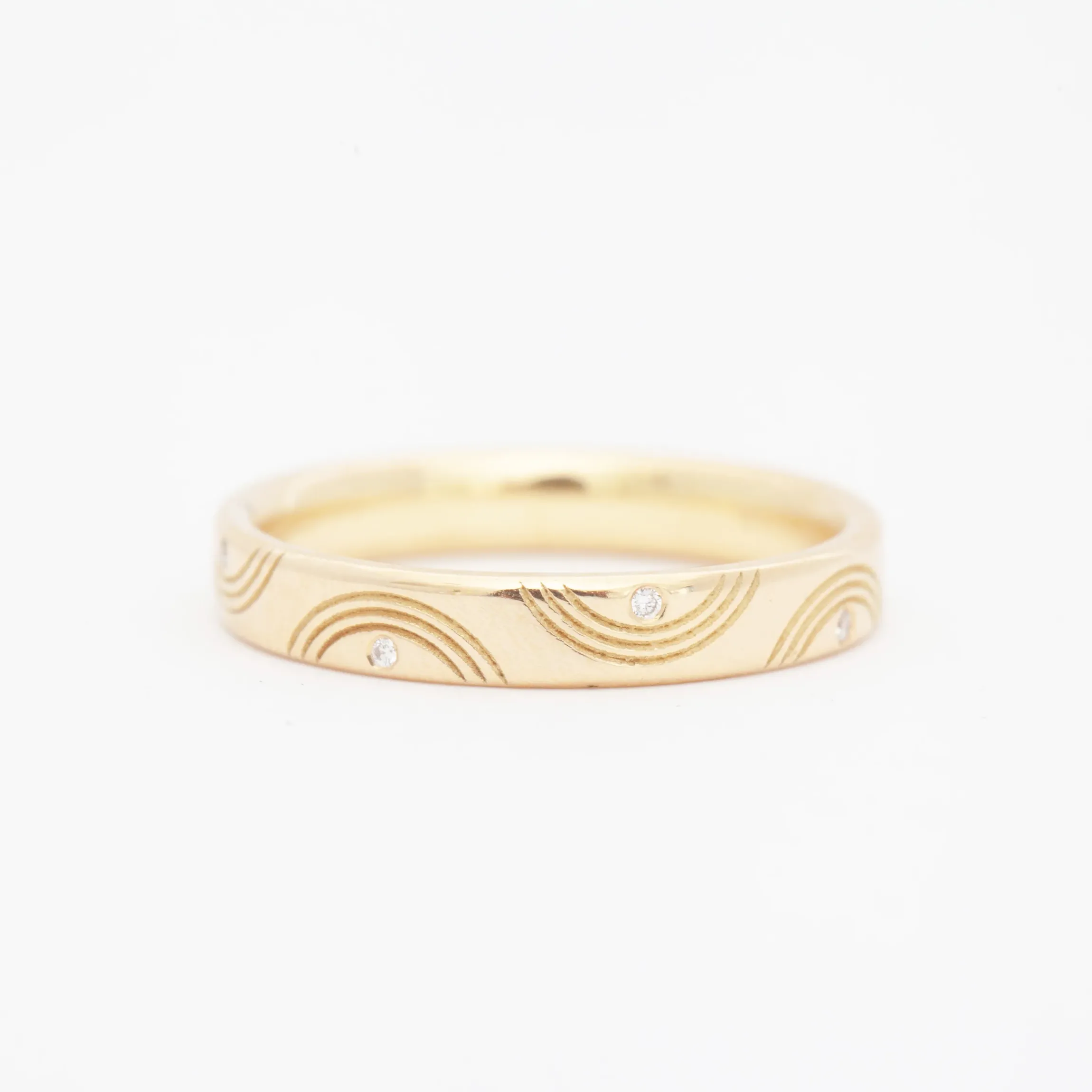Subtle engraved waves cut through smooth, rich gold for a modern, textured complement to engagement rings of any style. The alternating pattern creates a gentle, rhythmic sensation on the finger, reminiscent of the raked lines in a Japanese rock garden. Flush-set diamonds twinkle from the center of each engraving, adding a classic pop of shine that will make you say “I do” in a heartbeat. Made in Israel.