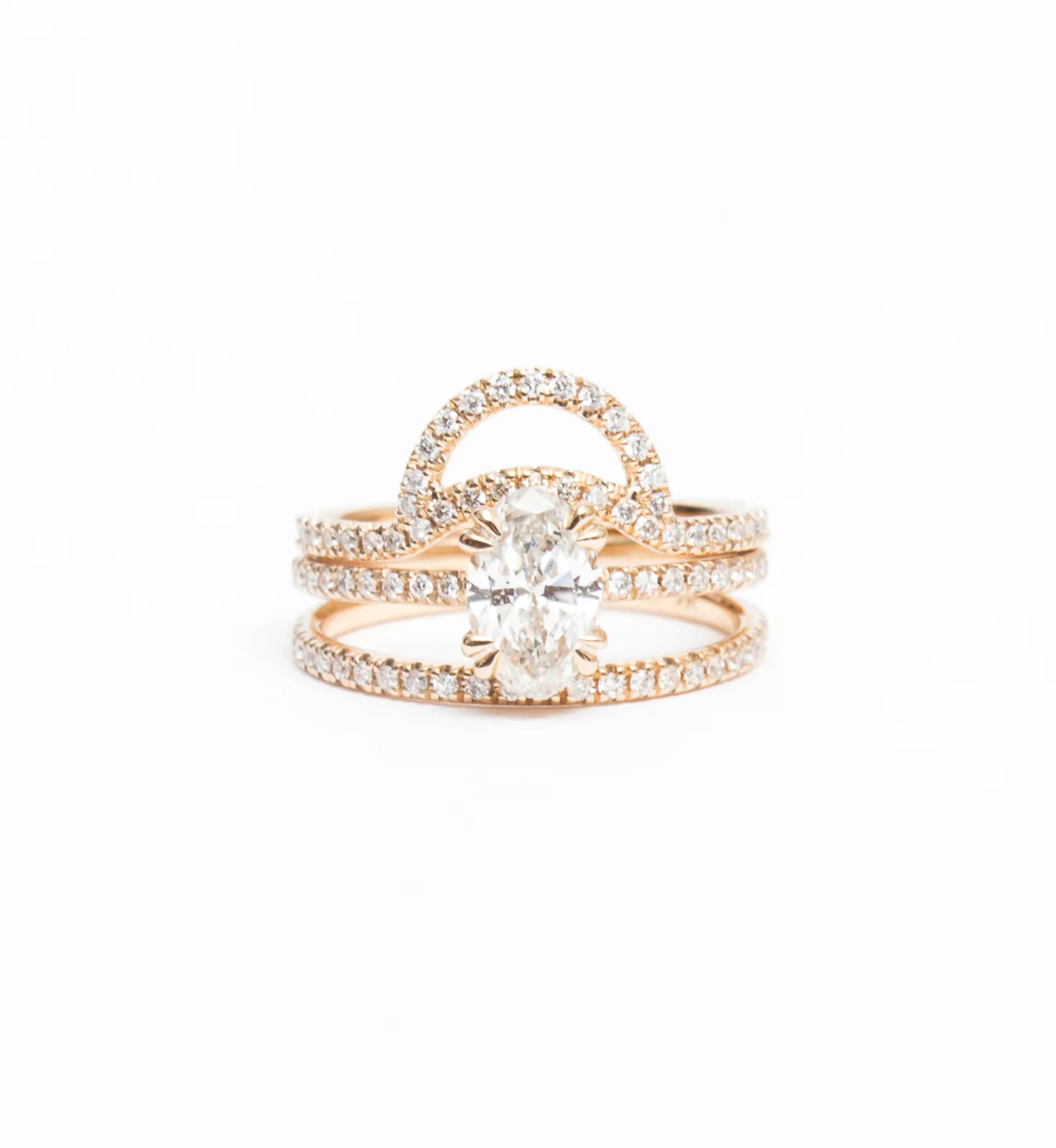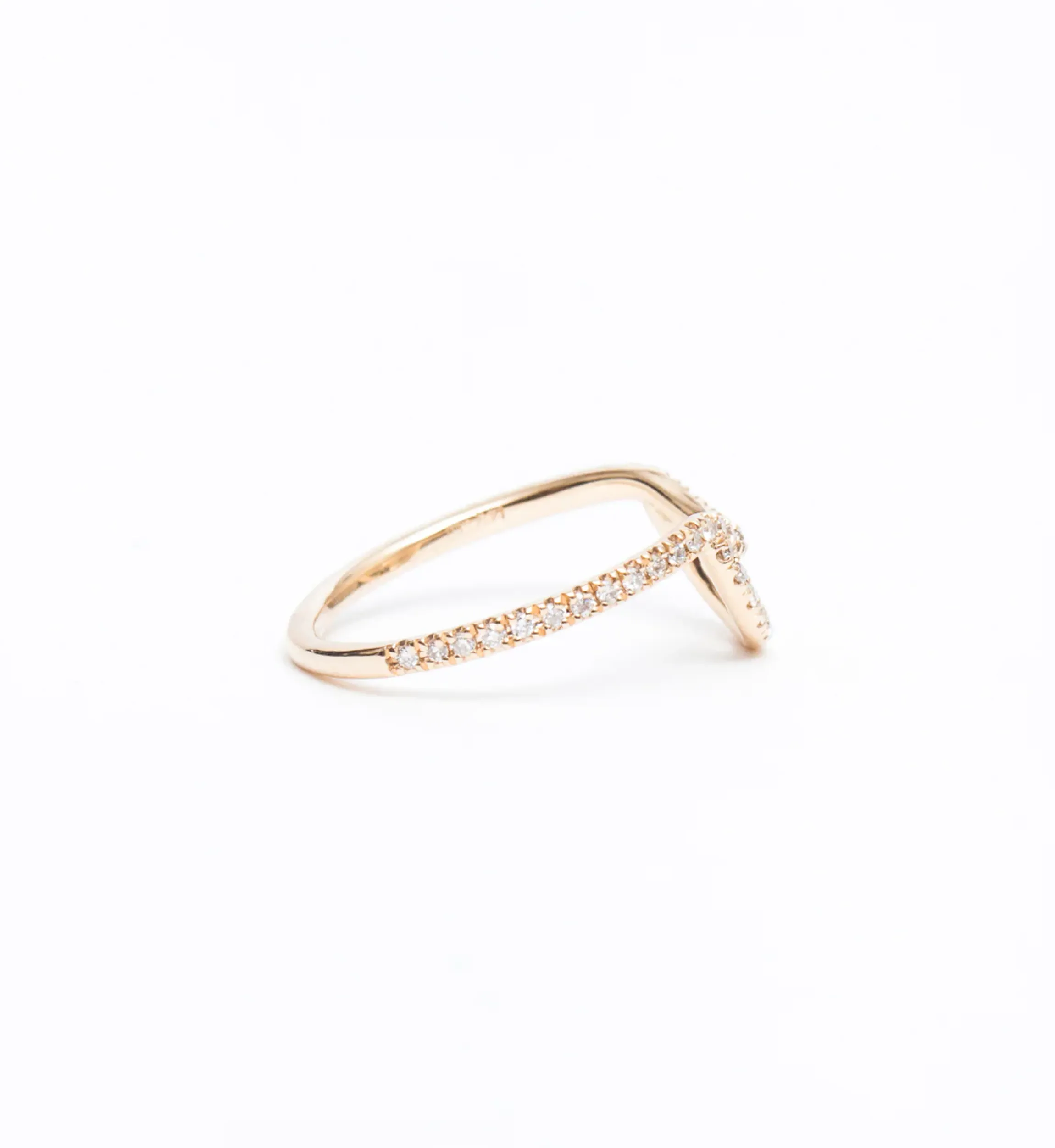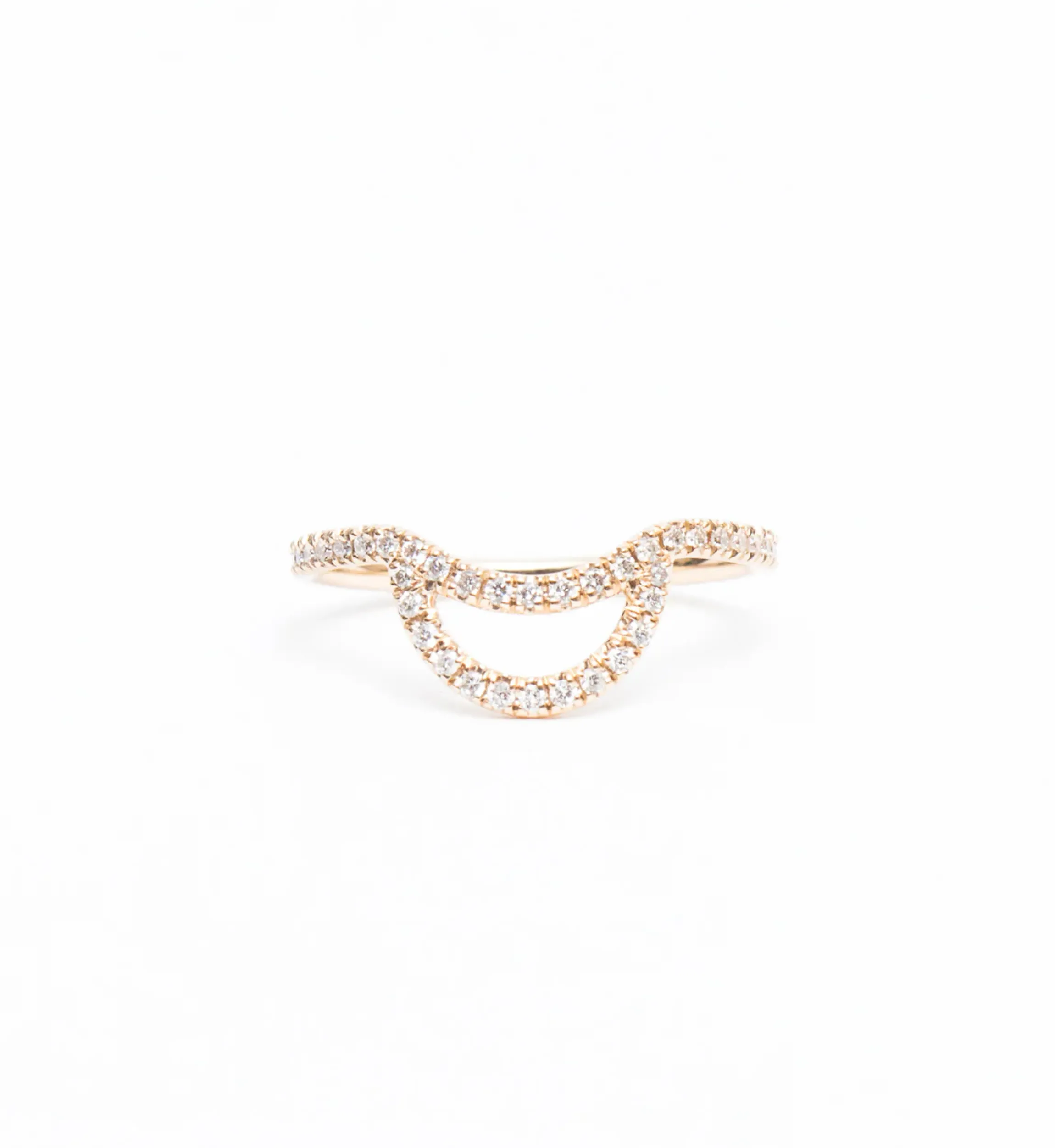 What would a band inspired by the sun be without some diamond “stars” to complete the look? This sculptural band takes Anna Sheffield’s signature stacks out of orbit with a pair of curves floating around your ring. A bit of negative space inside balances the sparkle with just a peek of skin, making it incredibly elegant, yet easy to wear. Designed in New York.