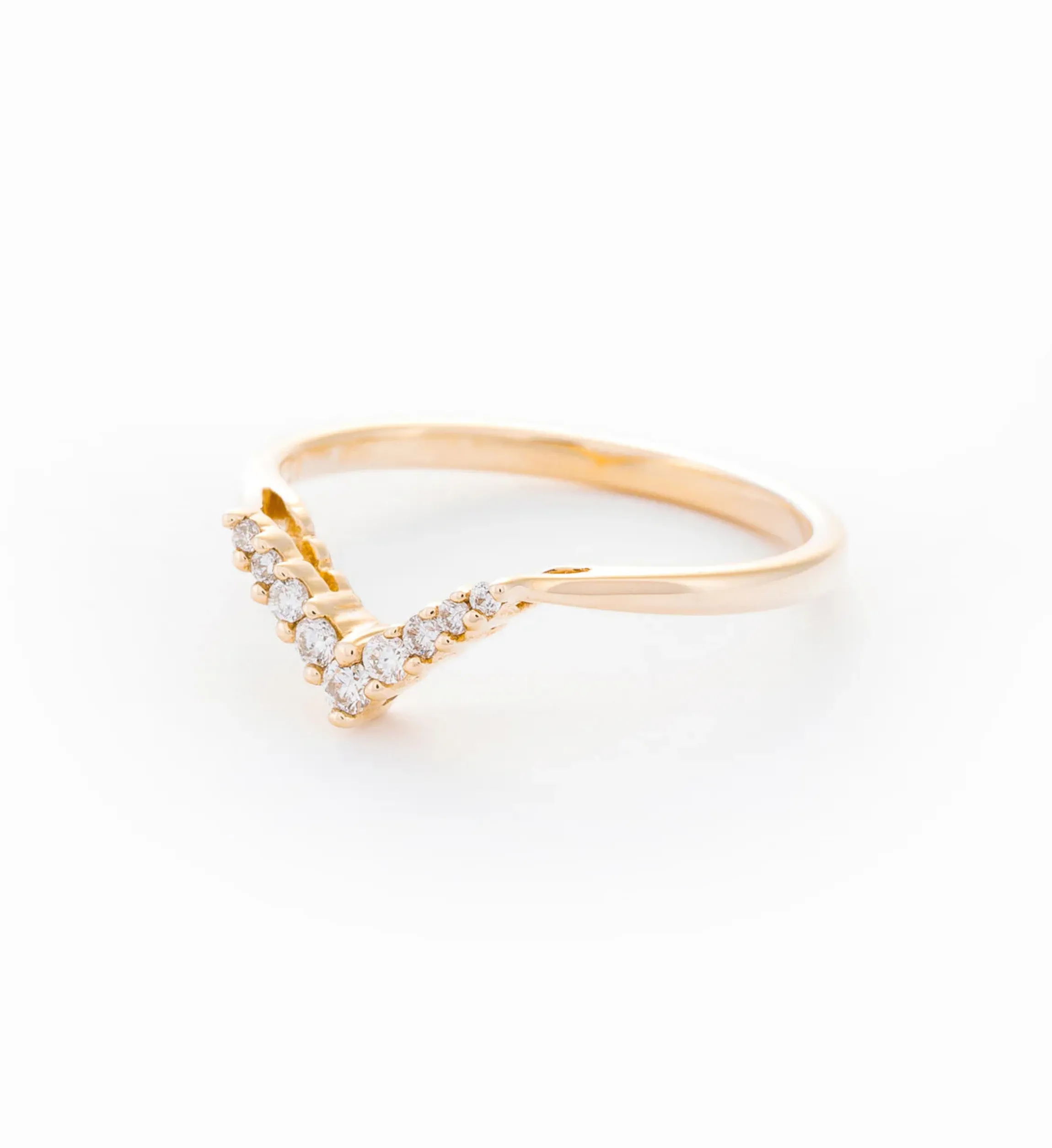 This diamond-dusted band adds a stunning geometric element and unforgettable sparkle to any set of rings. Nine white diamonds form a perfectly tapered chevron, with the largest at the peak tapering down in size toward the band. The shared prong setting elevates the diamonds into one unified design while still letting each individual stone capture your attention. Whether nestled into its larger counterpart or worn as a pair to create a stunning frame of diamonds, this piece will prove to be the perfect companion to your engagement ring. Designed in New York.