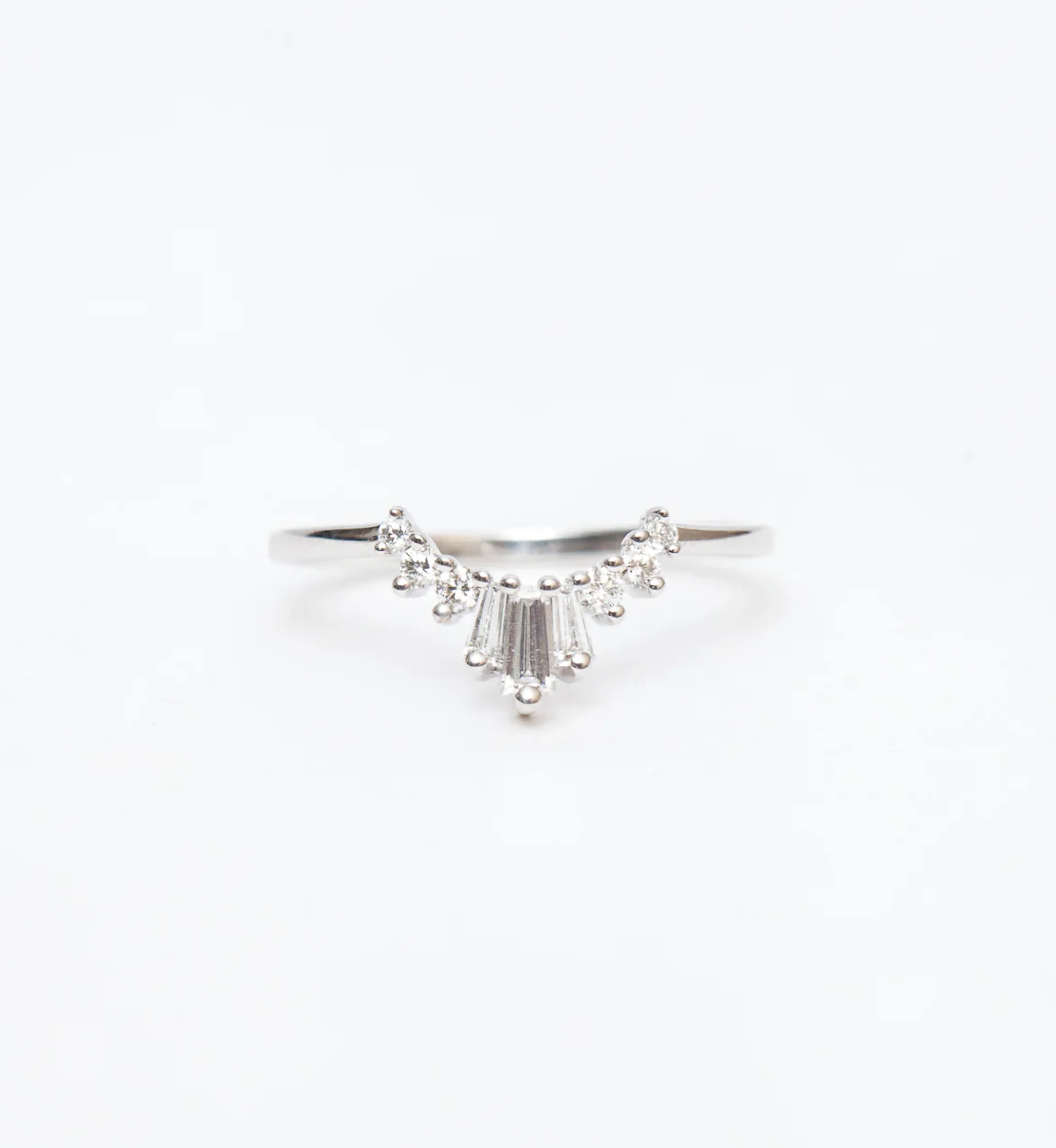 The Art Deco era has long inspired Anna Sheffield, so it was natural for her to infuse the period’s iconic architecture into her signature stacking band. A trio of tapered baguette diamonds ascend like New York’s famous skyscrapers, adding drama and geometry to any ring stack. For a simpler statement, wear it solo with your solitaire for an unmistakable combination. Designed in New York.