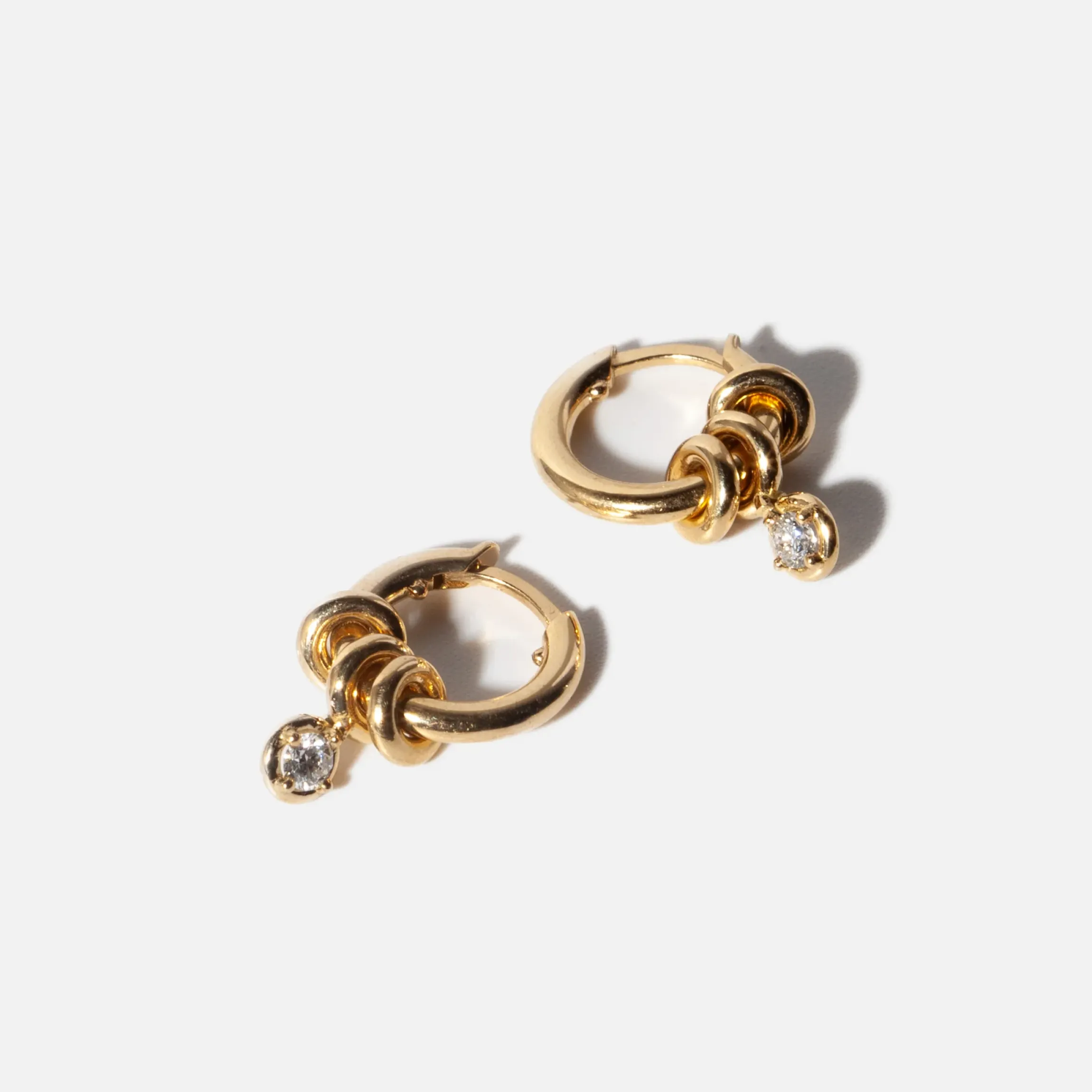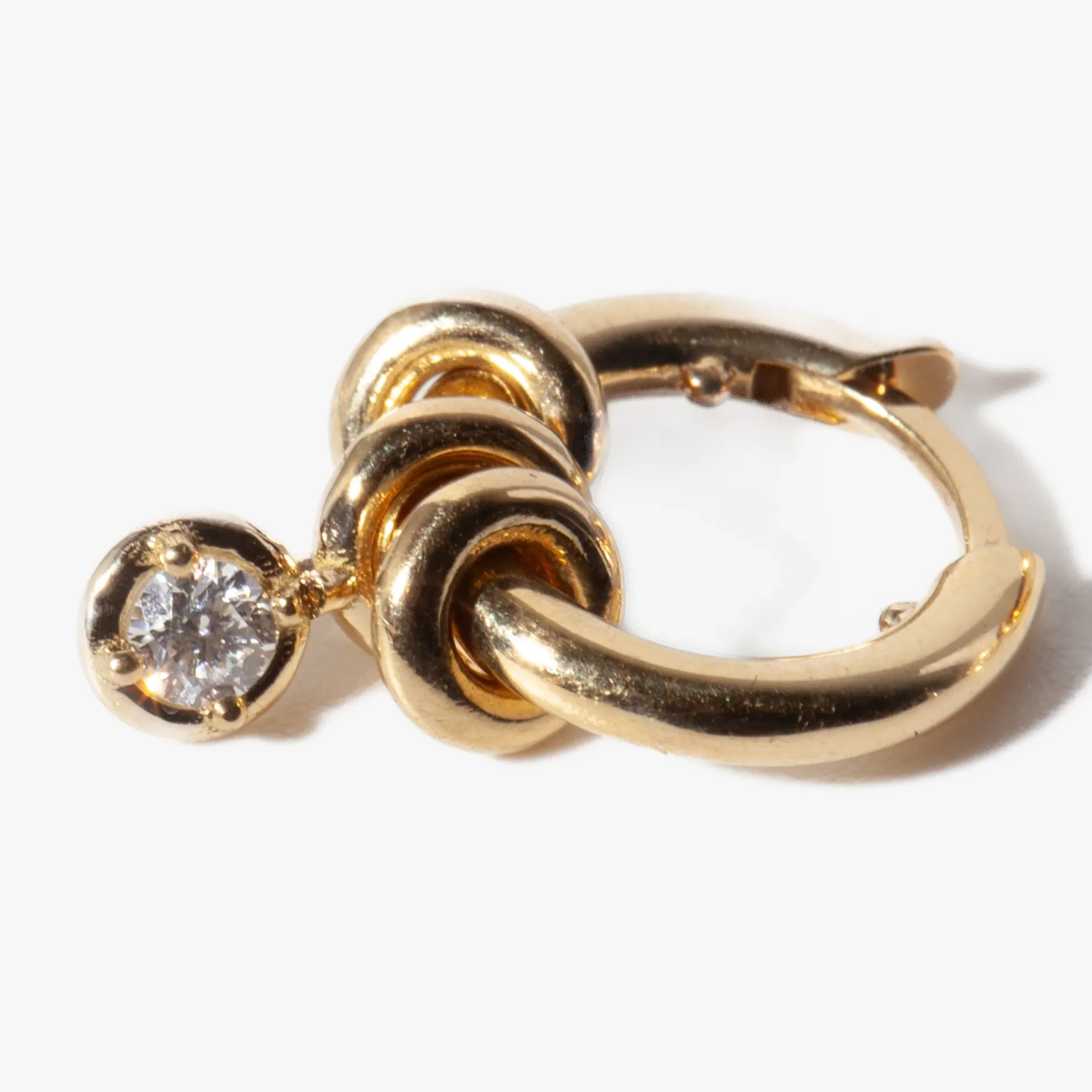 This new hoop by Spinelli Kilcollin, displays a familiar, streamlined silhouette and comfort closure in sterling silver. Three annulets adorn each hoop, the center of which bears a drop charm for added contrast and movement. Each earring is individually handmade in Los Angeles.
