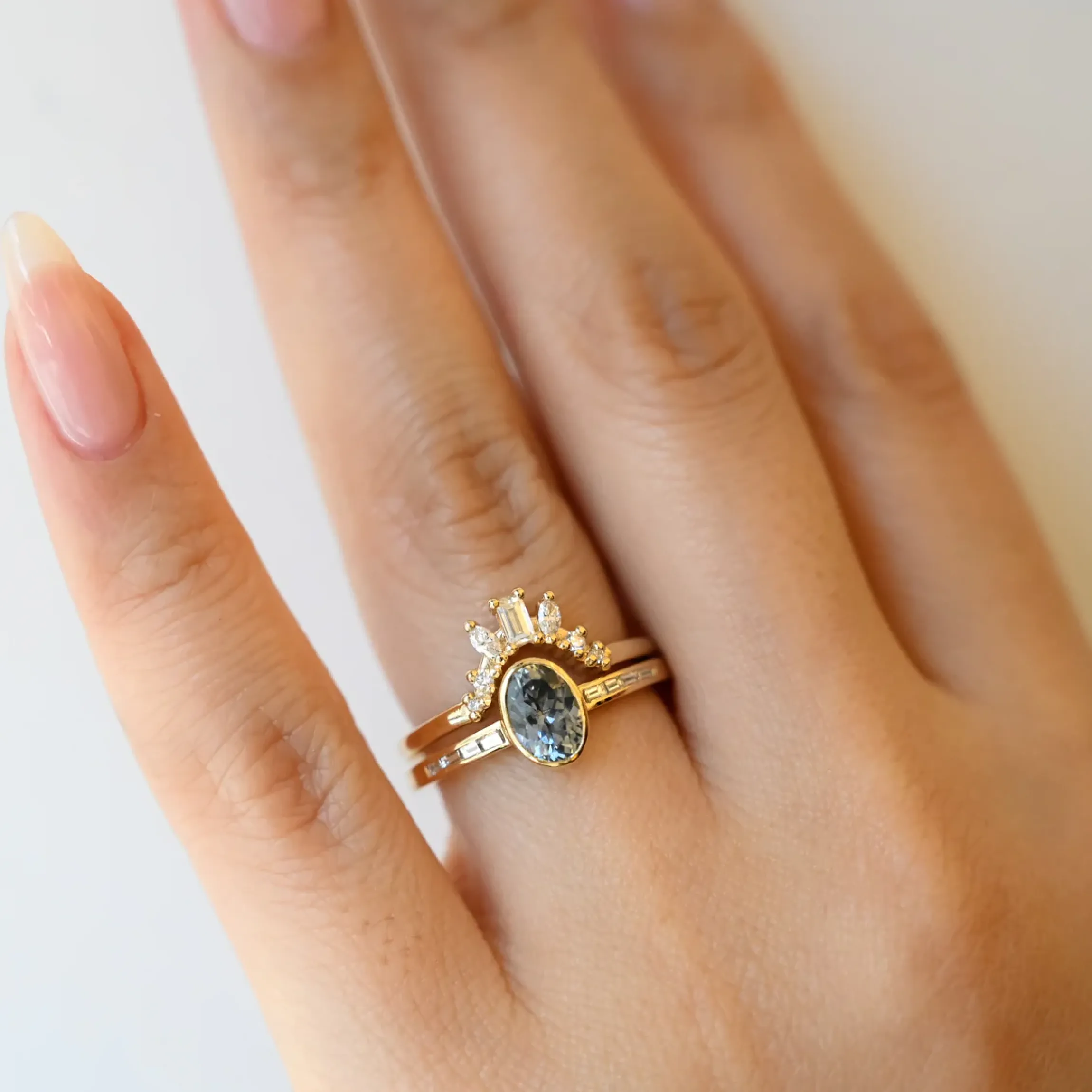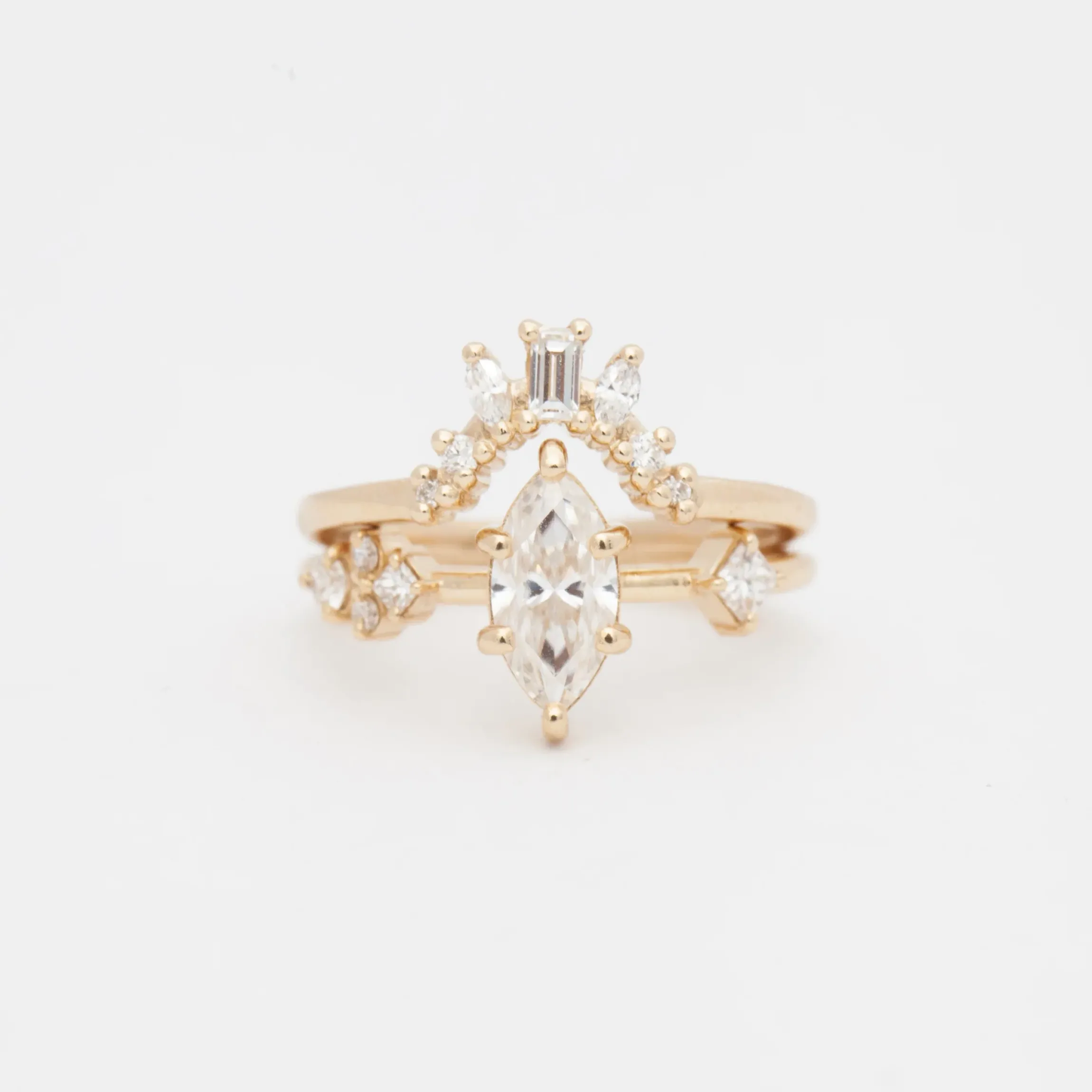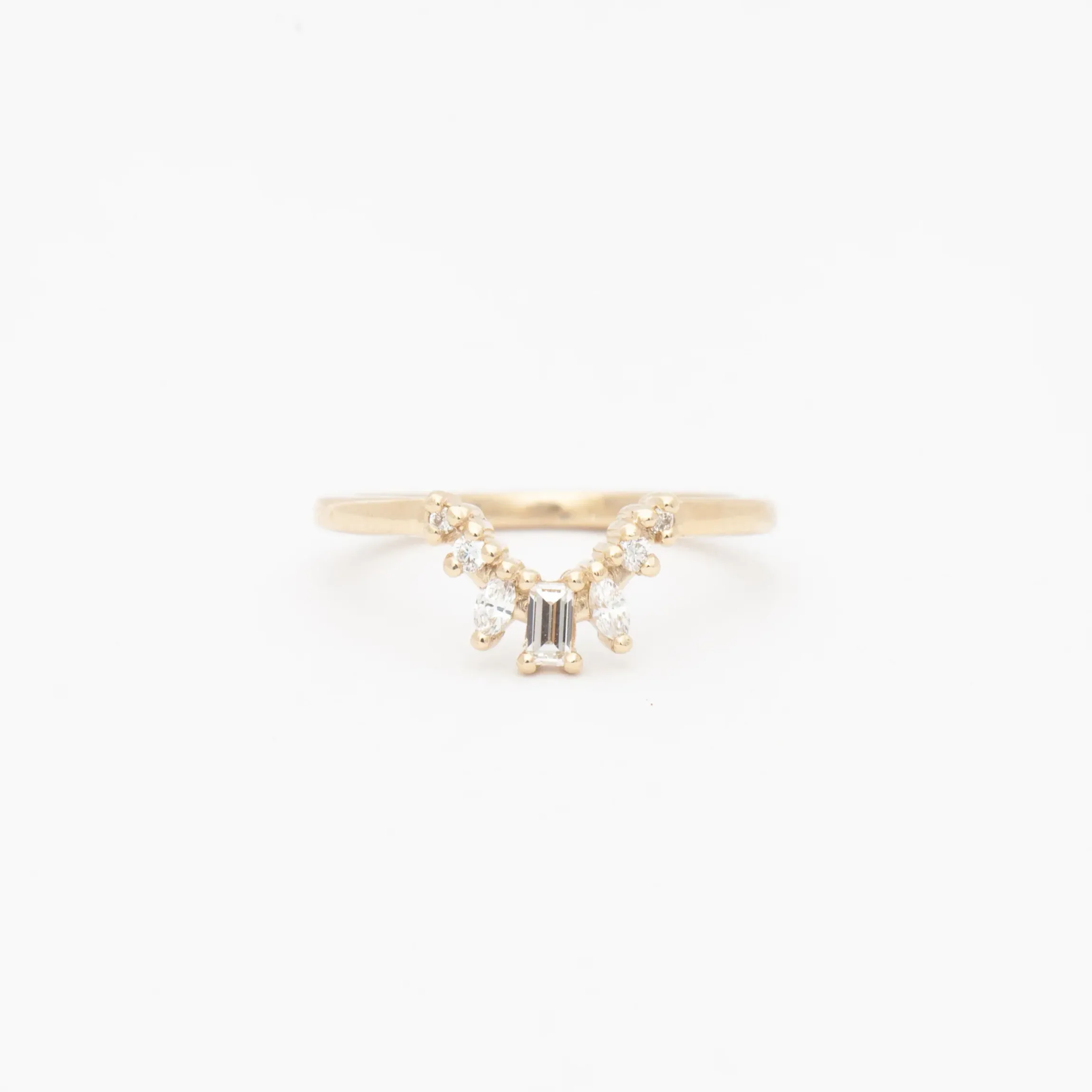 Tiny gold beads and a bouquet of different diamond shapes set along a deep curve make this band a perfect complement to elongated engagement rings. Dainty round diamonds, elegant marquise diamonds, and a single baguette diamond fan upward on the finger, adding shape and texture to your suite of rings. Stack a classic eternity band on the opposite side for a winning combination of classic and contemporary styling. Made in the U.S.A.