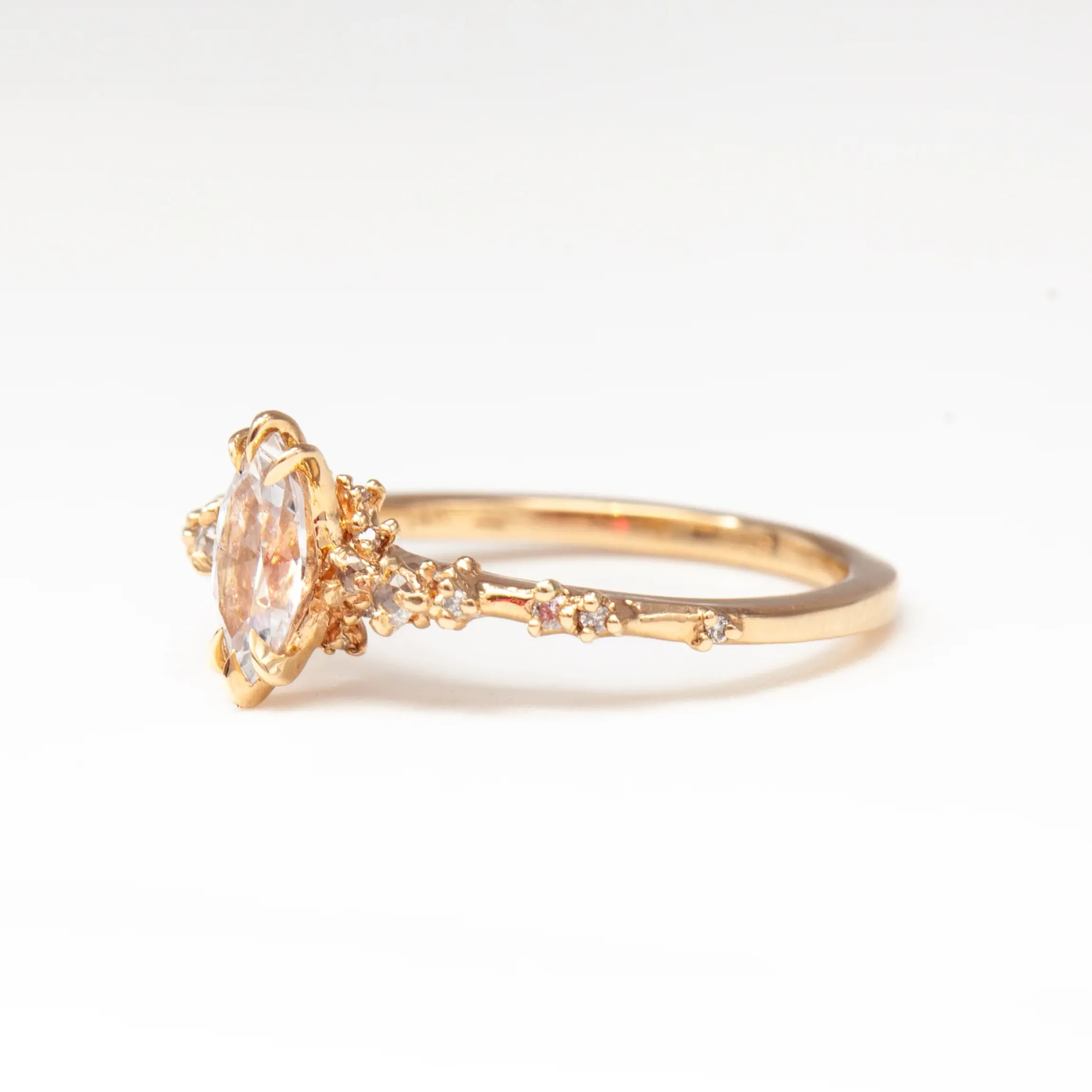 14 karat gold set with an approximately 0.50 carat marquise white diamond center with twelve 0.8mm, six 0.9mm, two 1.1mm recycled round brilliant cut diamonds (GH color, VS clarity) and two 1.25 and two 1.75mm rose cut diamonds (GHI color, SI1 clarity).