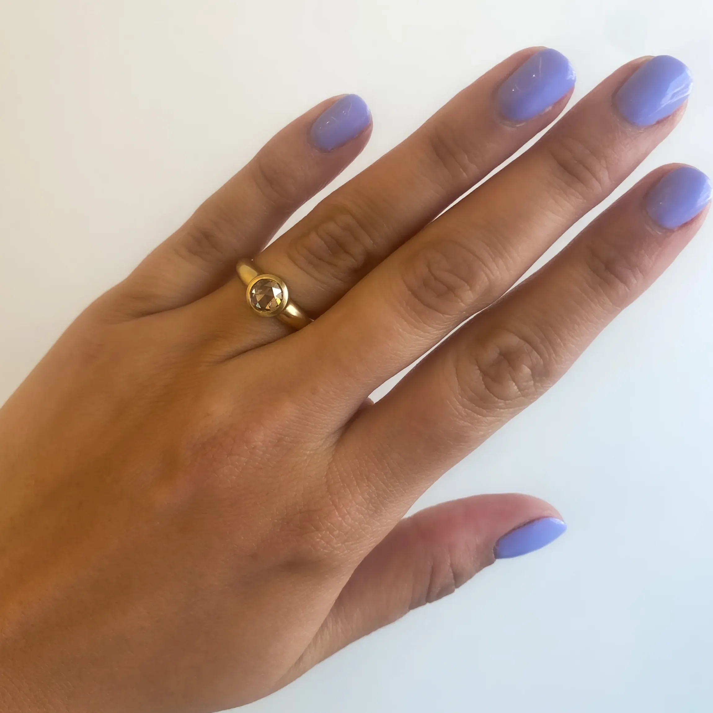 Featuring a gorgeous round rose-cut diamond with an orange-brown hue, the traditional solitaire takes on a modern update with this playful and eye-catching design from Melissa Scoppa. The chunky band and low-set center diamond wrapped in a weighty bezel create a beautiful and unique piece, perfect for someone looking for a cool alternative engagement ring. Made in the U.S.A.