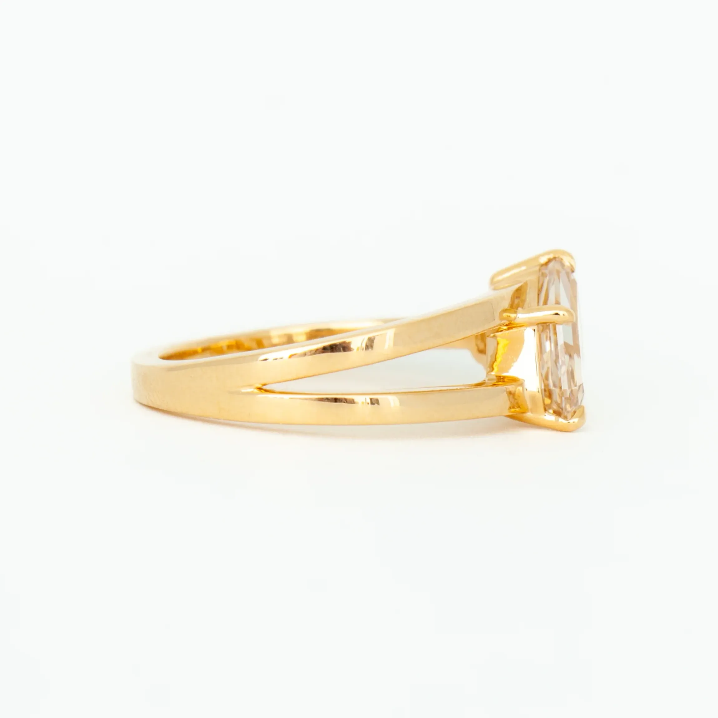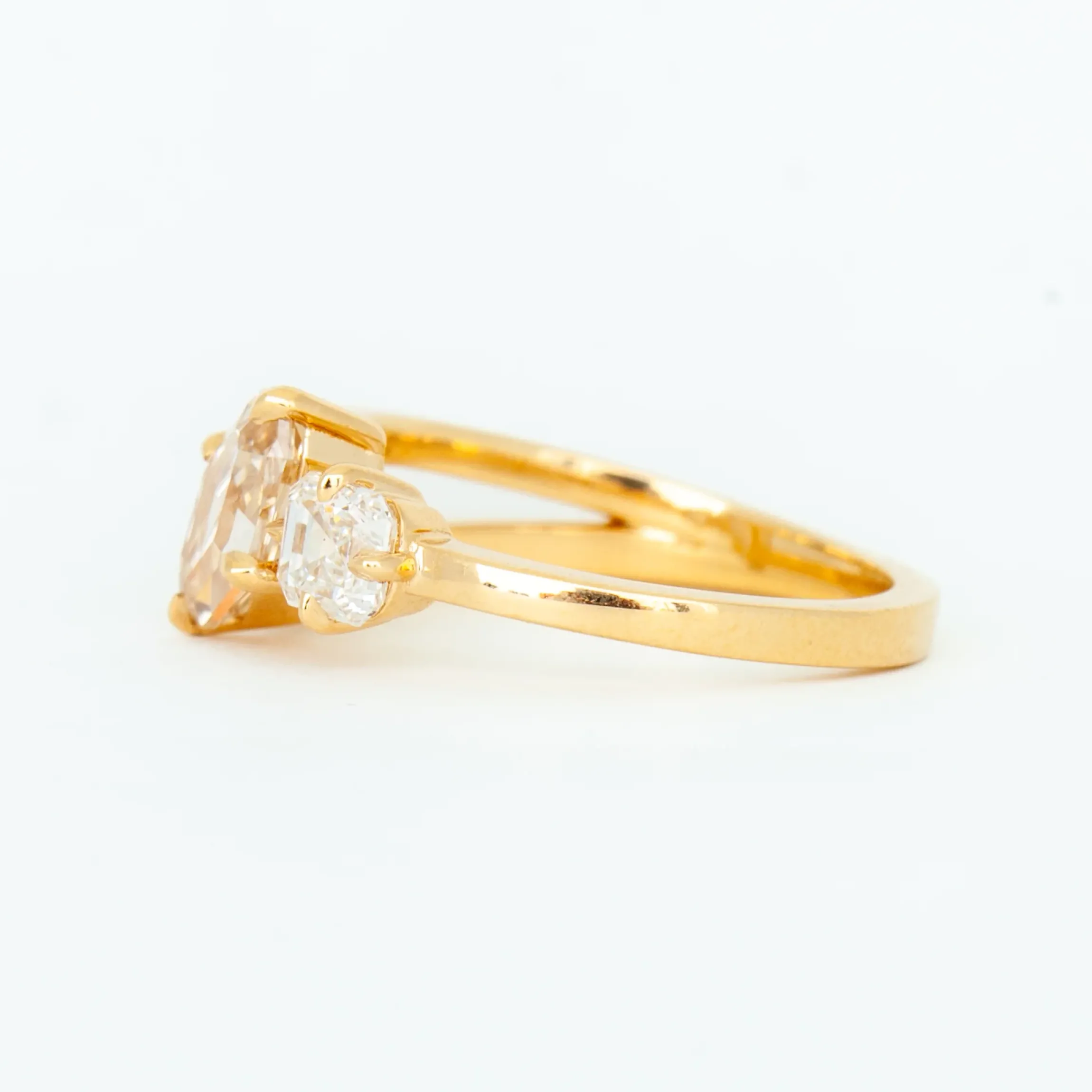 18 karat yellow gold set with an approximately 1.06 ct lozenge champagne diamond with one asscher white diamond totaling approximately 0.37 carat.