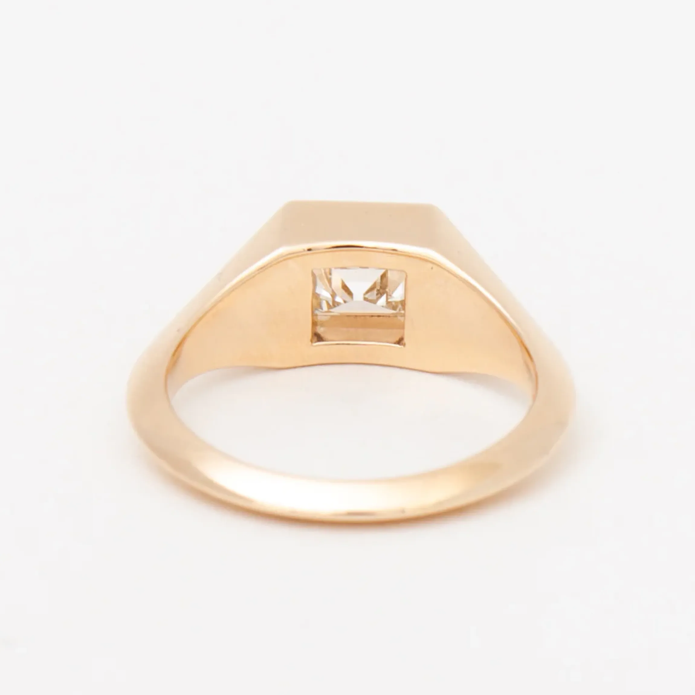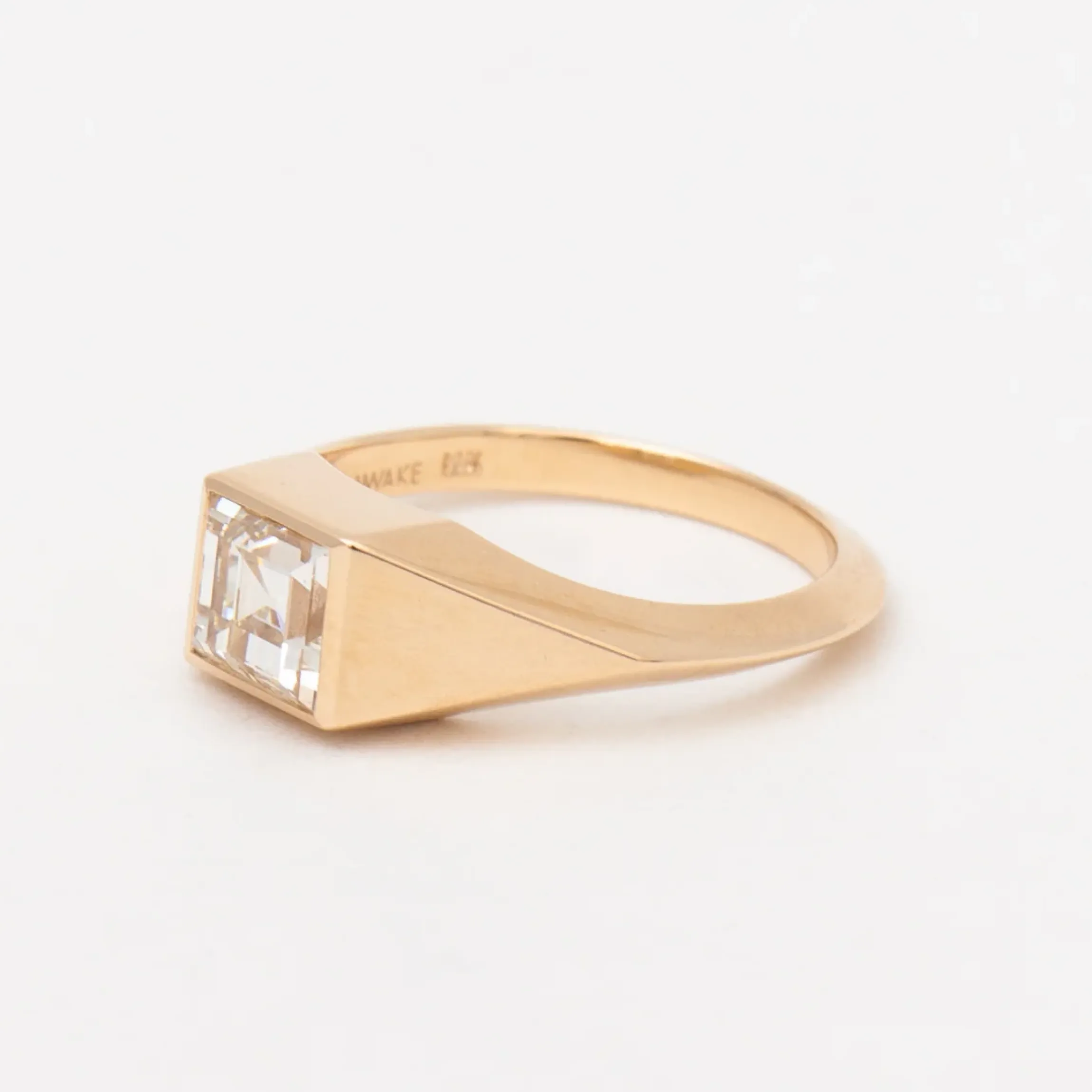 This new WWAKE signet ring is making a statement in our shop. A perfect Carré-cut, chubby white diamond sits in at the center of this composition surrounded by a bold yellow gold setting that makes for a gorgeous ring you can’t help but admire. Show off your style with a signet that makes an impact–it’s the cool alternative engagement ring or a statement piece for everyday wear. Made in the USA.