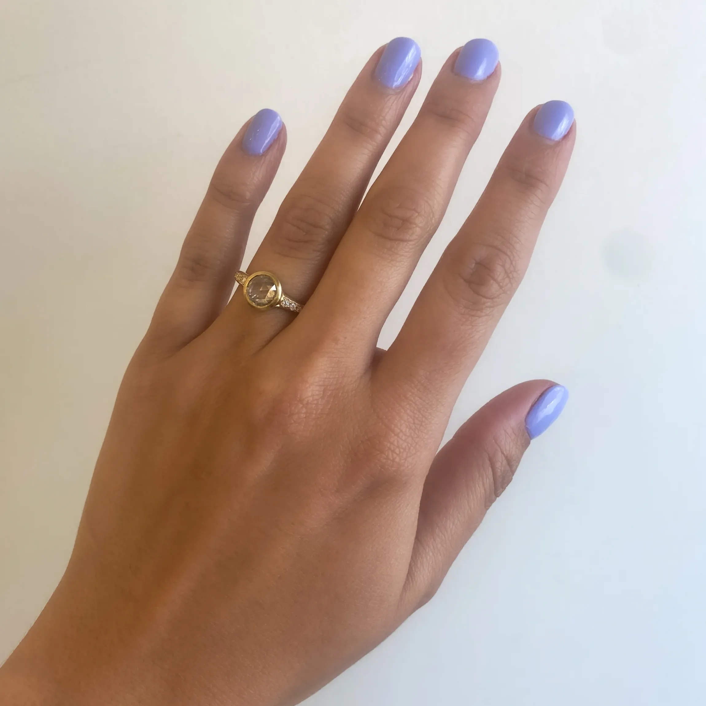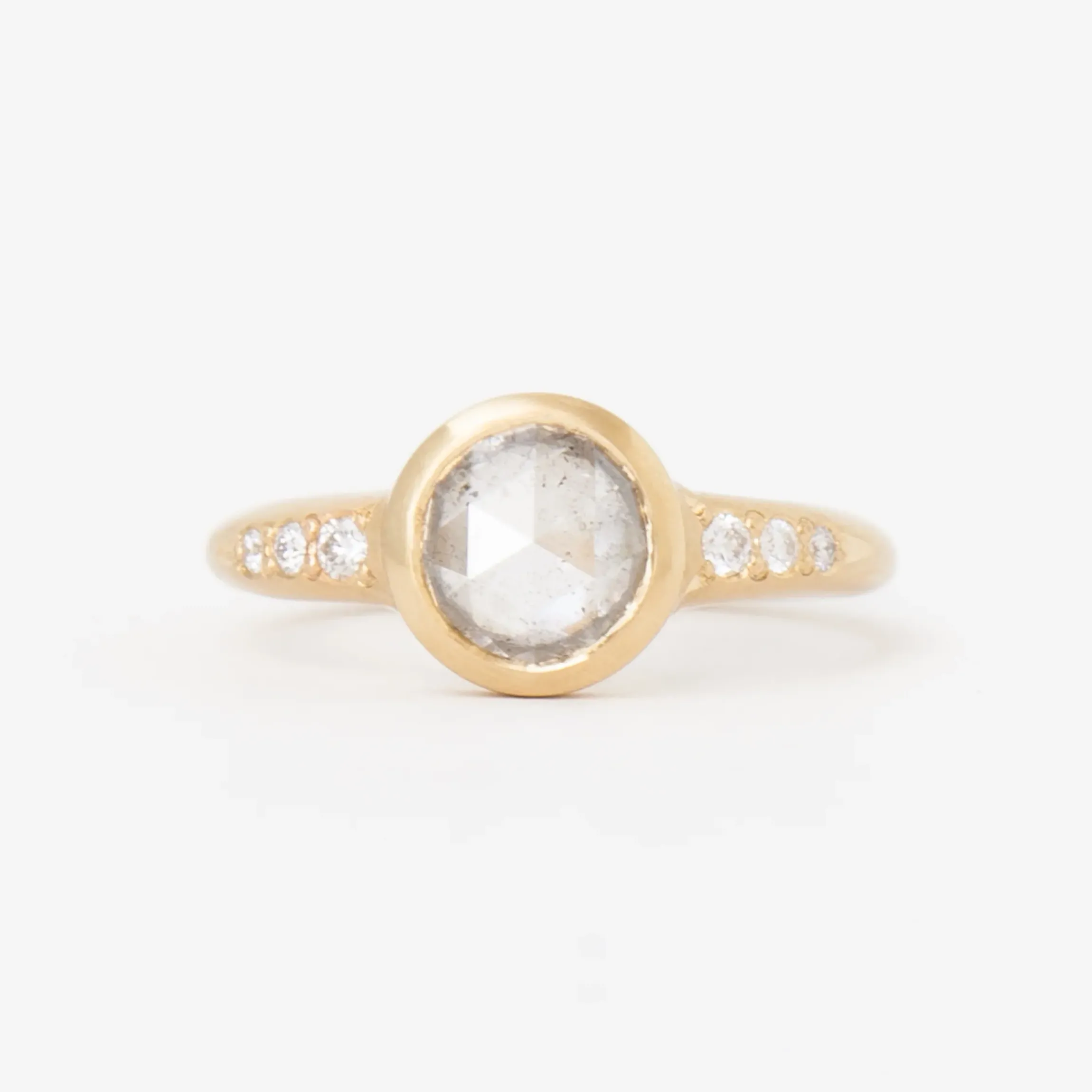 Featuring a gorgeous round rose-cut diamond with a salt and pepper hue, the traditional engagement ring takes on a modern update with this playful and eye-catching design from Melissa Scoppa. The bubbly band with the graduating white diamonds that frame the low-set center diamond wrapped in a weighty bezel create a beautiful and unique piece, perfect for someone looking for a ring that you don’t stumble upon everyday. Made in the U.S.A.