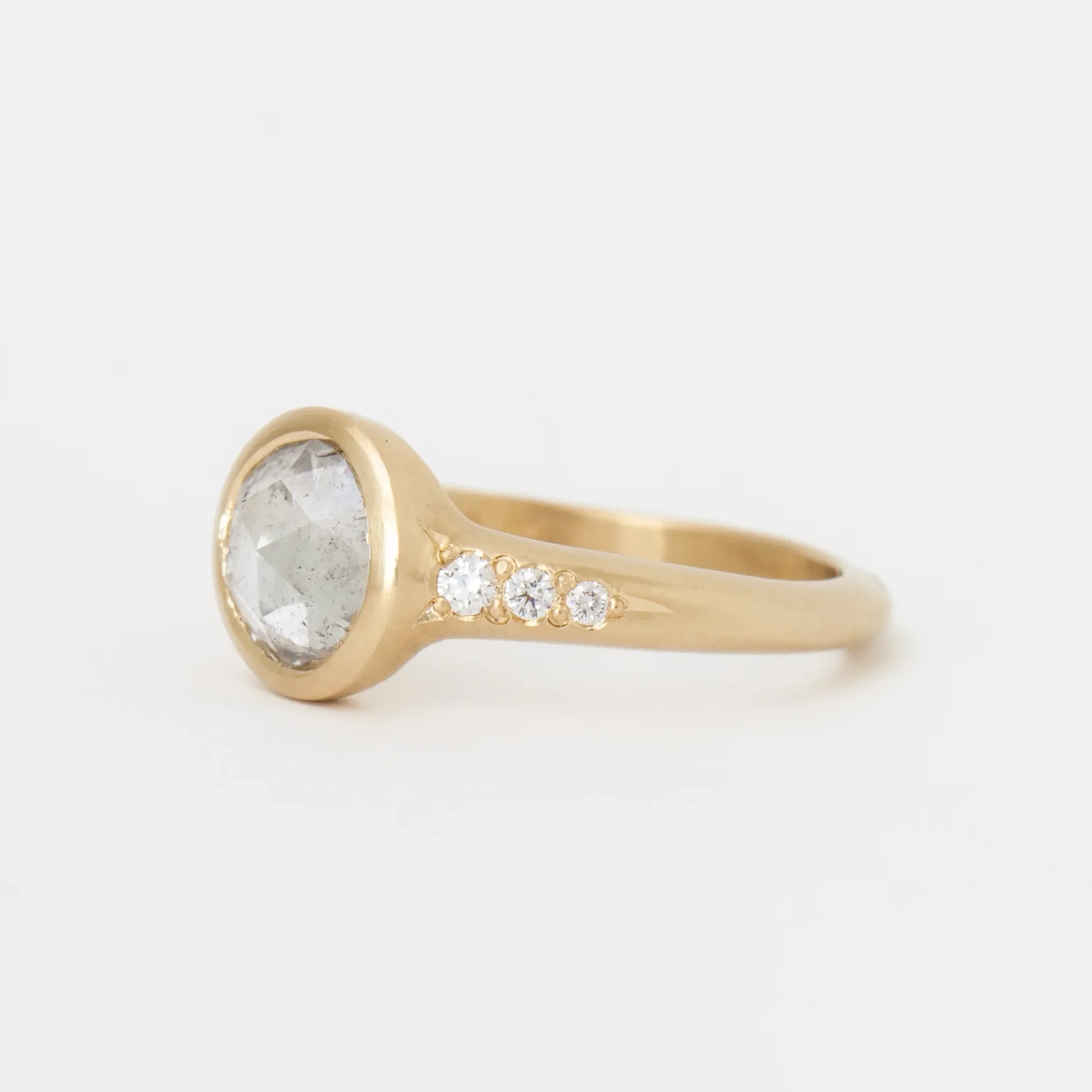14 karat fairmined yellow gold with with six graduated white diamonds (F color, VS clarity) totaling 0.10 carat and a round salt u0026amp; pepper rose-cut diamond totaling 1.32 carat.