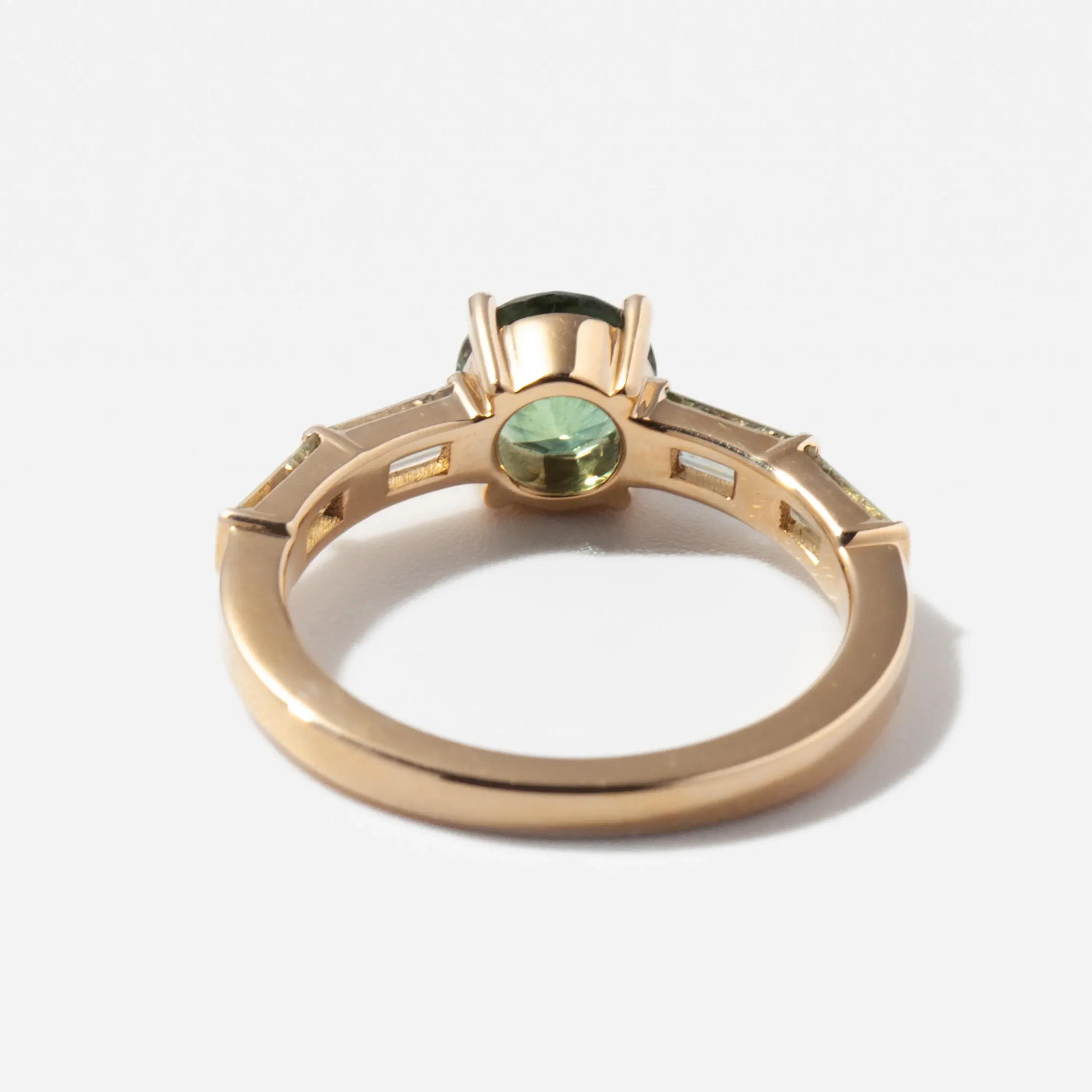 14k recycled yellow gold. 1.33 ct. heat-treated, round-cut Montana sapphire from the Rock Creek deposit. 4 total, 2 x 3 mm sapphire baguettes from the Rock Creek deposit.