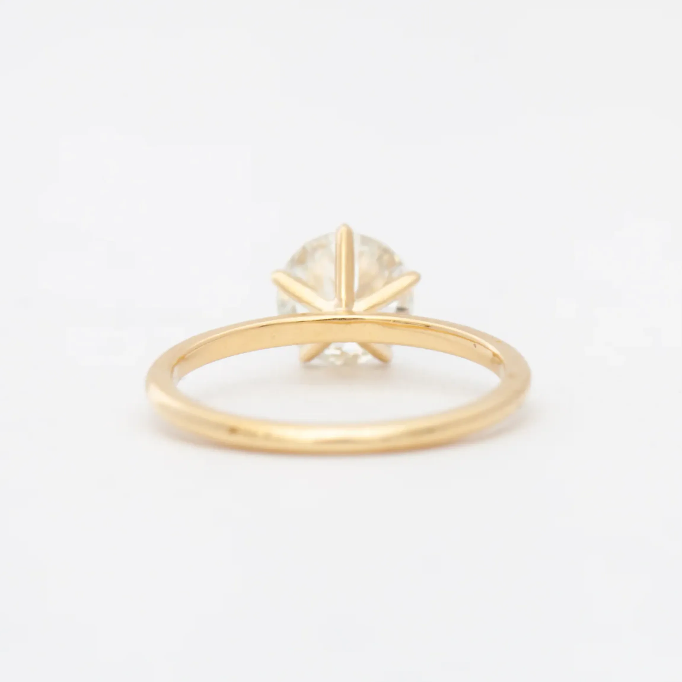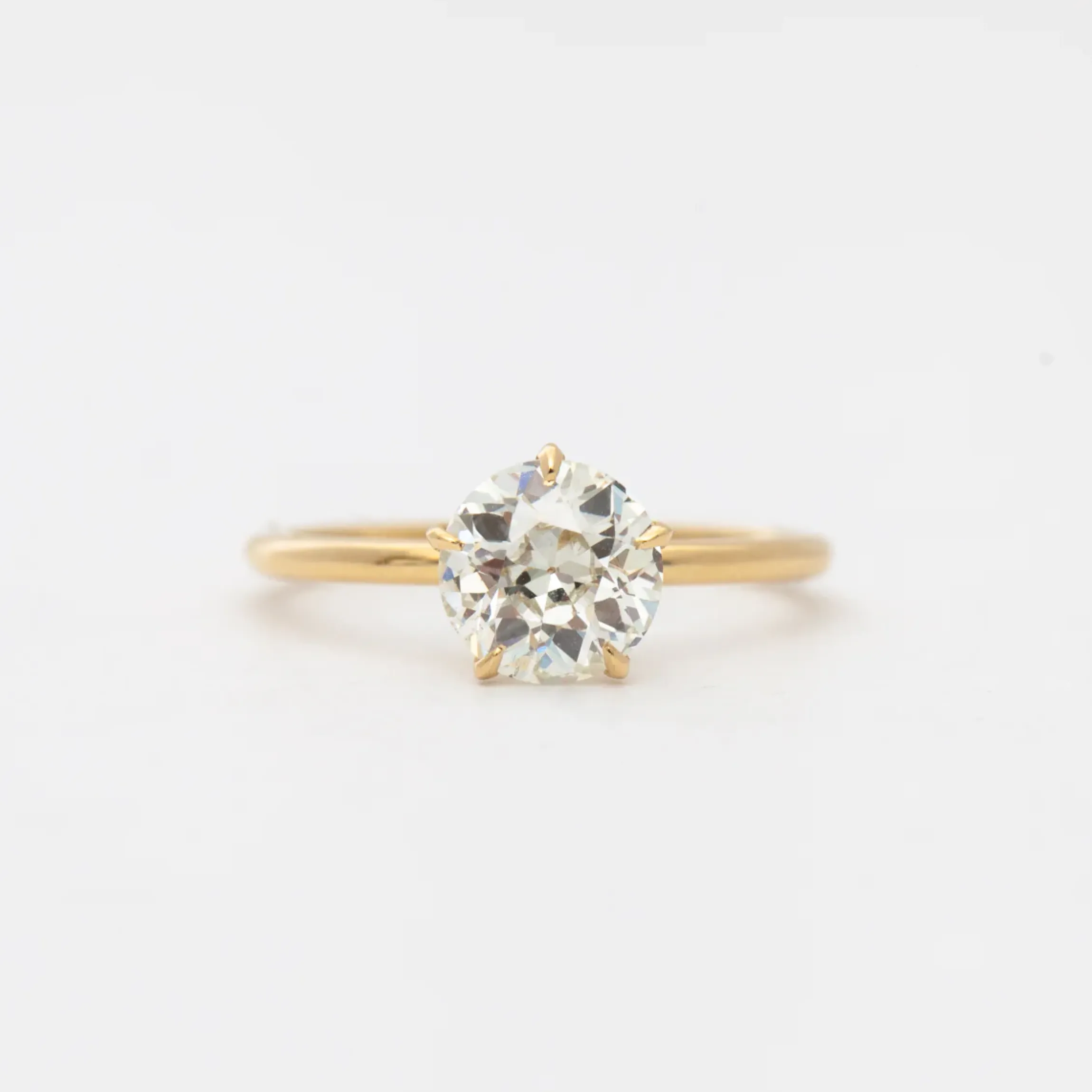18 karat yellow gold set with a 1.42 carat round Old European center (J color, SI2 clarity).