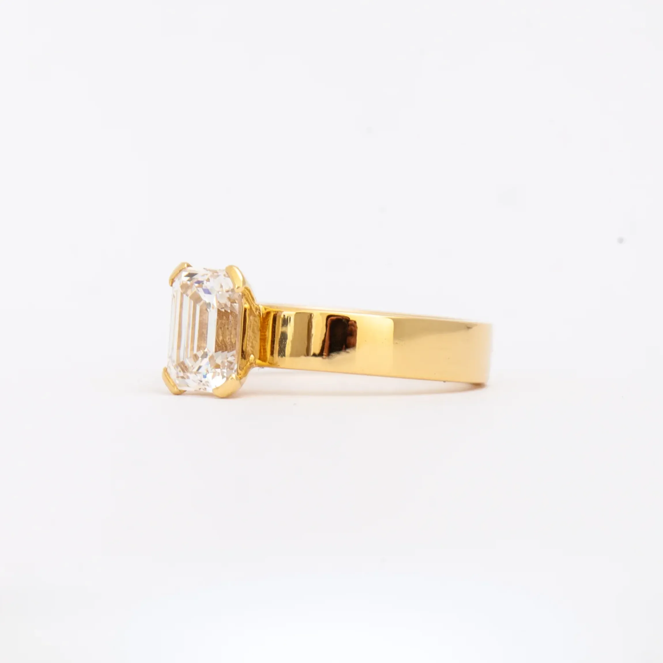 18 karat yellow gold set with a 1.57 carat lab-grown GCAL certified emerald cut white diamond (F/VS1).
