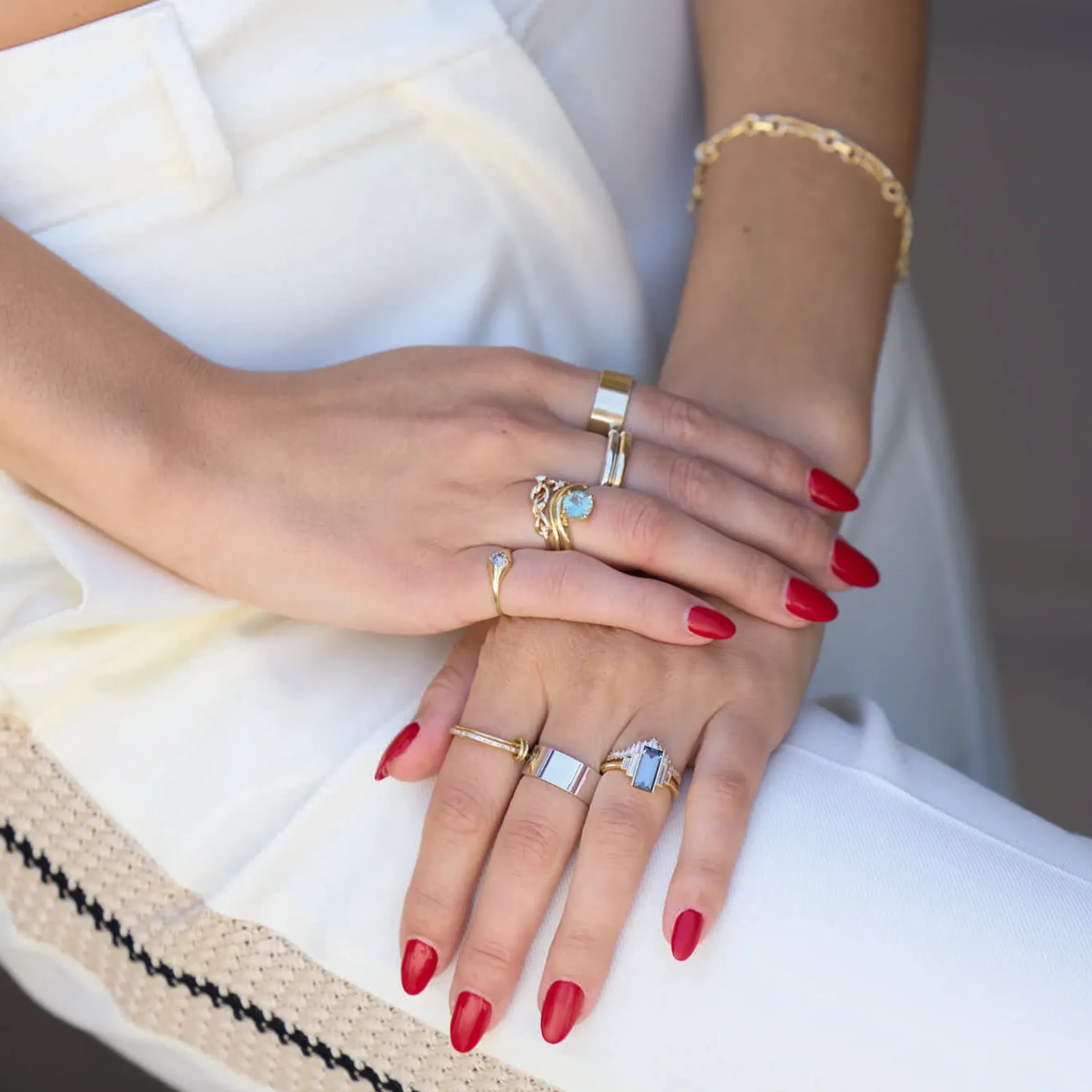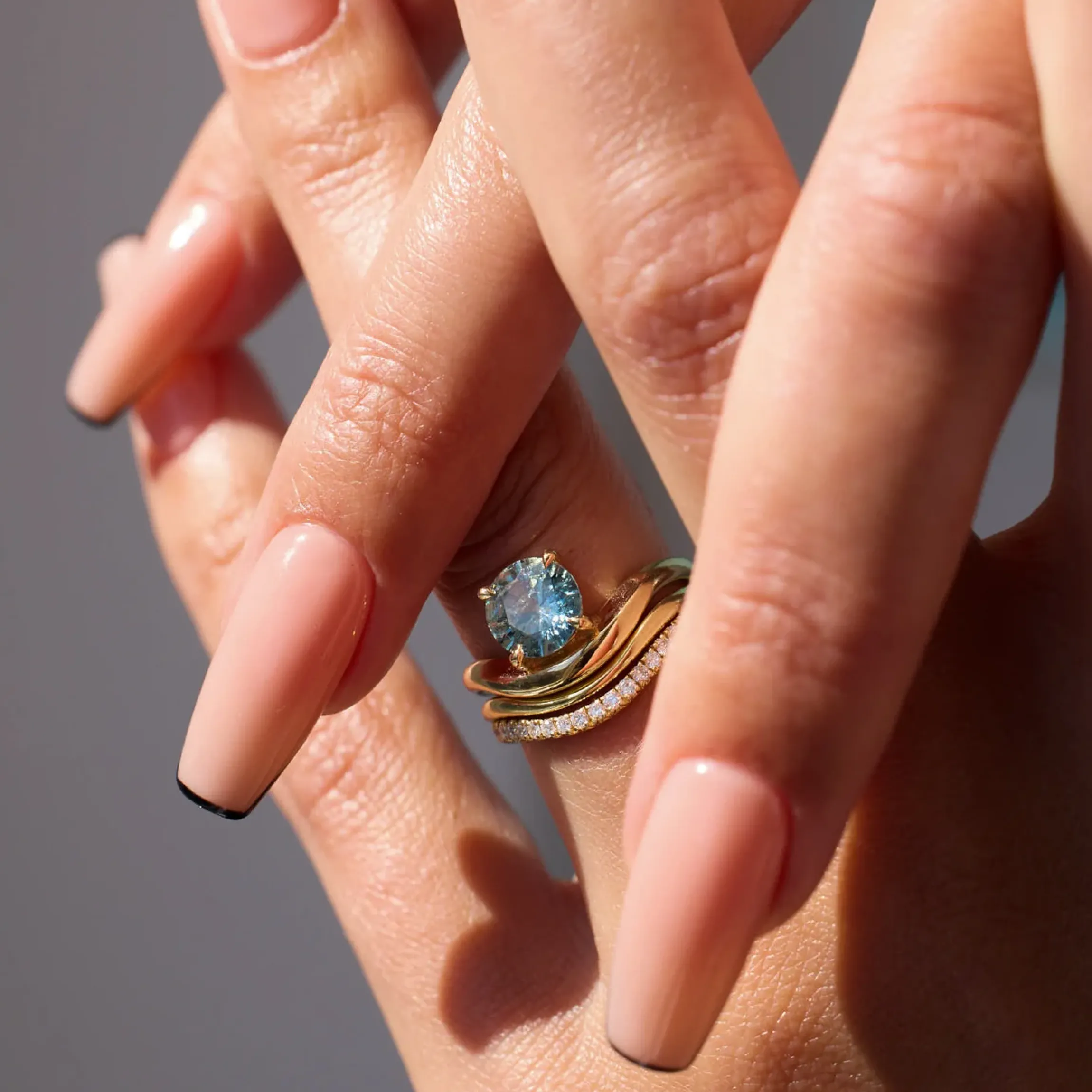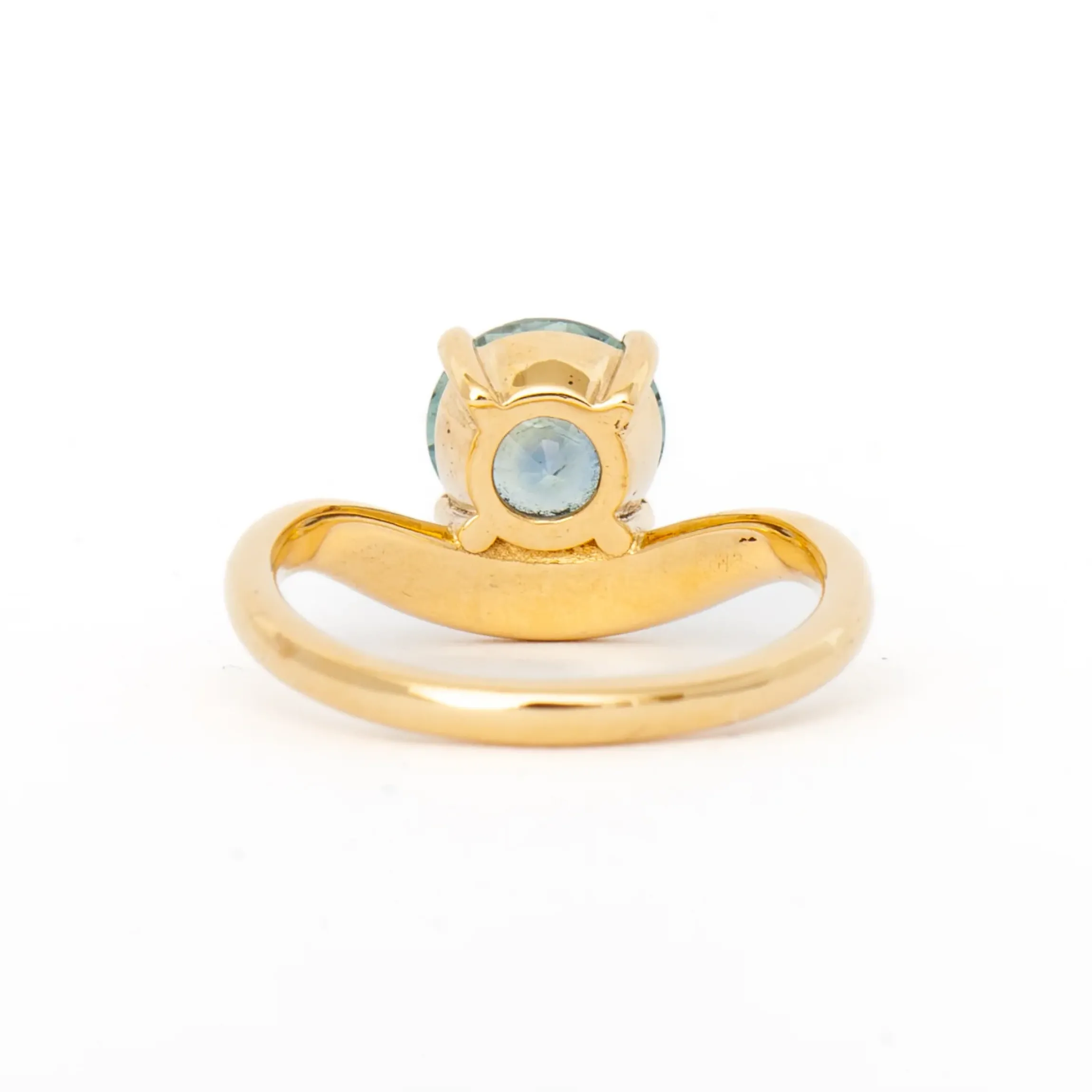 A true work of art, this new ring from The Future Fine features organic gold lines that take a gentle dip to mirror the unique curves of its center sapphire. This one-of-a-kind Piscine features a glimmering teal sapphire from Montana that pairs beautifully with the yellow hue of the setting. Its asymmetric design creates a dream-like quality, while the offset stone glimmers in perfect harmony like ripples on a tranquil pool. Designed and made in the U.S.A.