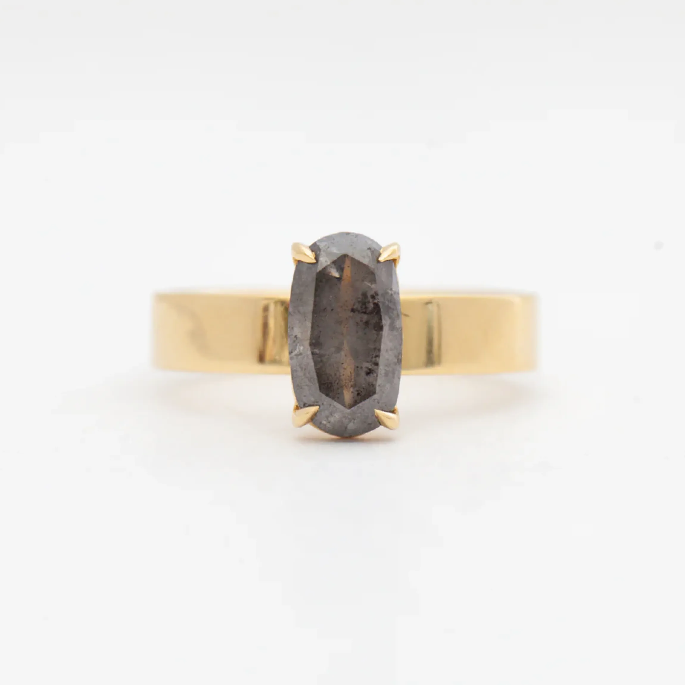 Bold, beautiful, and heavy in gold, the Temple setting by The Future Fine features a thick luxurious band that truly pays homage to the diamond it carries. This one-of-a-kind Temple features an elongated salt and pepper diamond with gorgeous natural inclusions that give it its rich coloration. Perfect for any bride looking for a high-impact yet elegant alternative to a white diamond engagement ring. Made in the U.S.A.