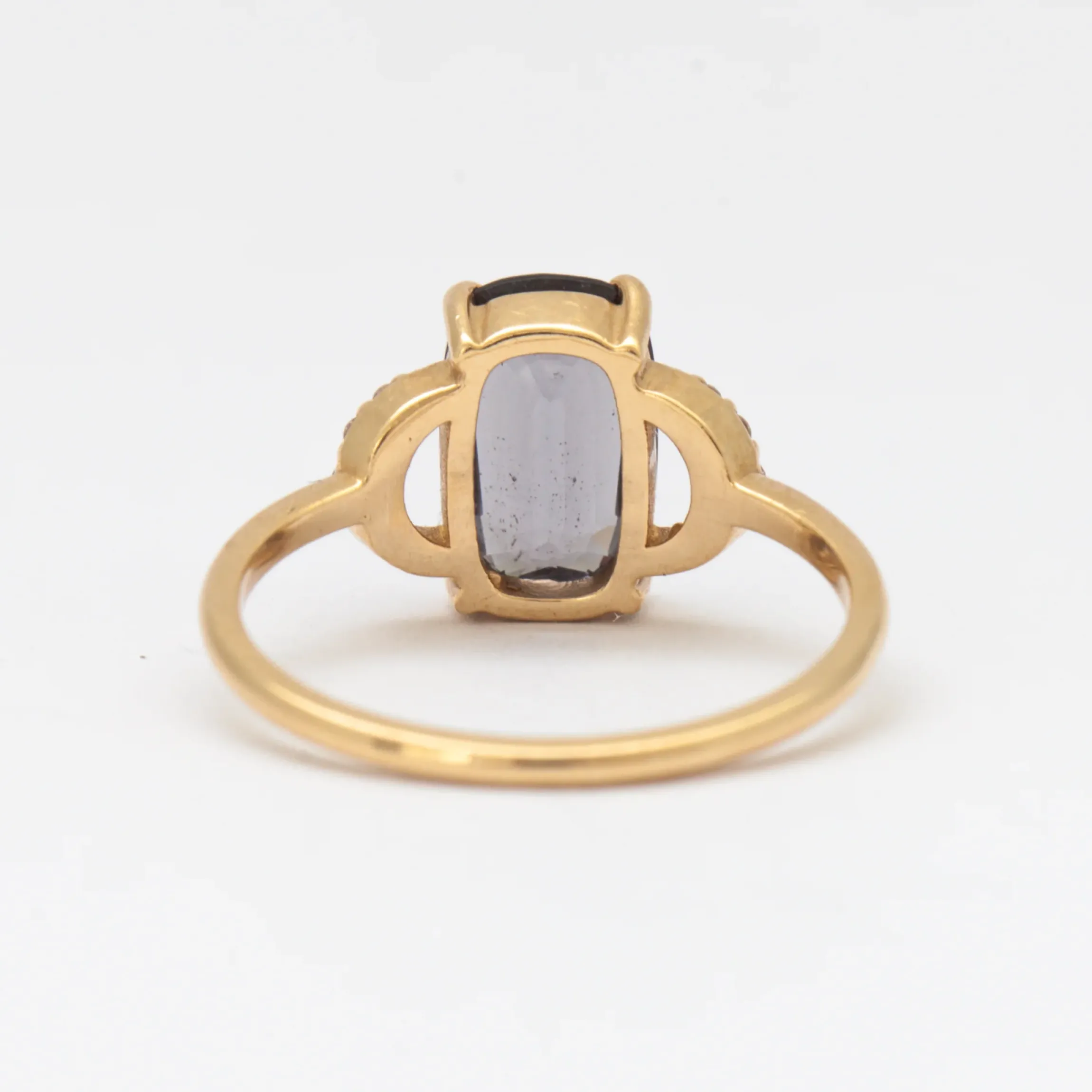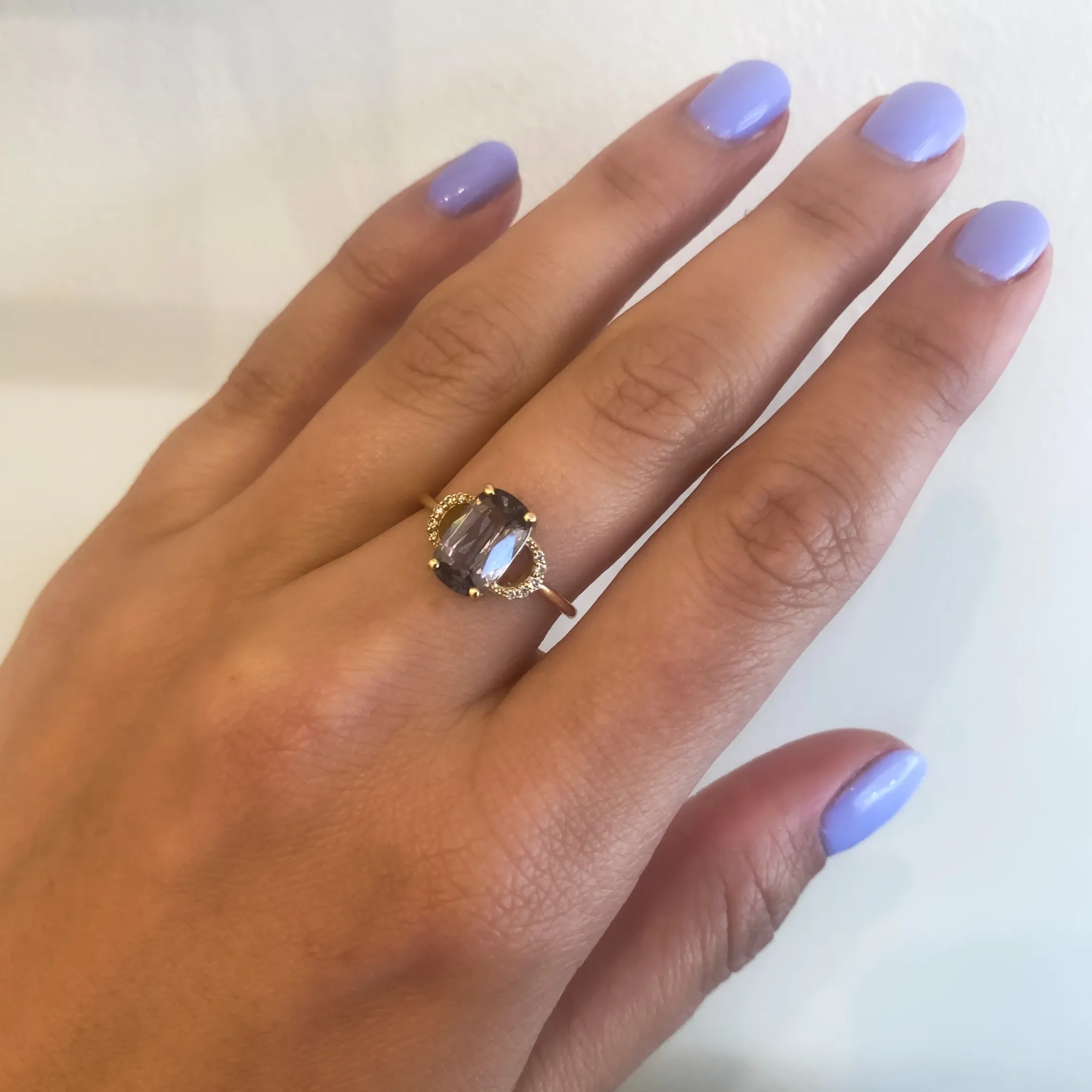 Introducing a unique and playful ring fresh from the renowned NYC designer, Vale Jewelry. This ring is sure to turn heads, featuring a stunning elongated cushion in purple, flanked by diamond-adorned half circles. The low-profile design ensures comfortable wear for every day. It is a perfect option for those seeking a non-traditional engagement ring or an every day power ring.